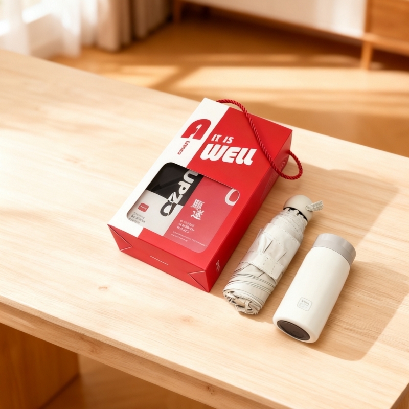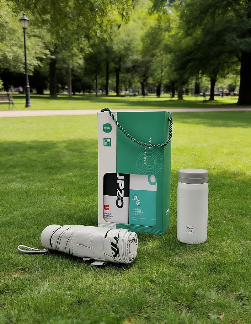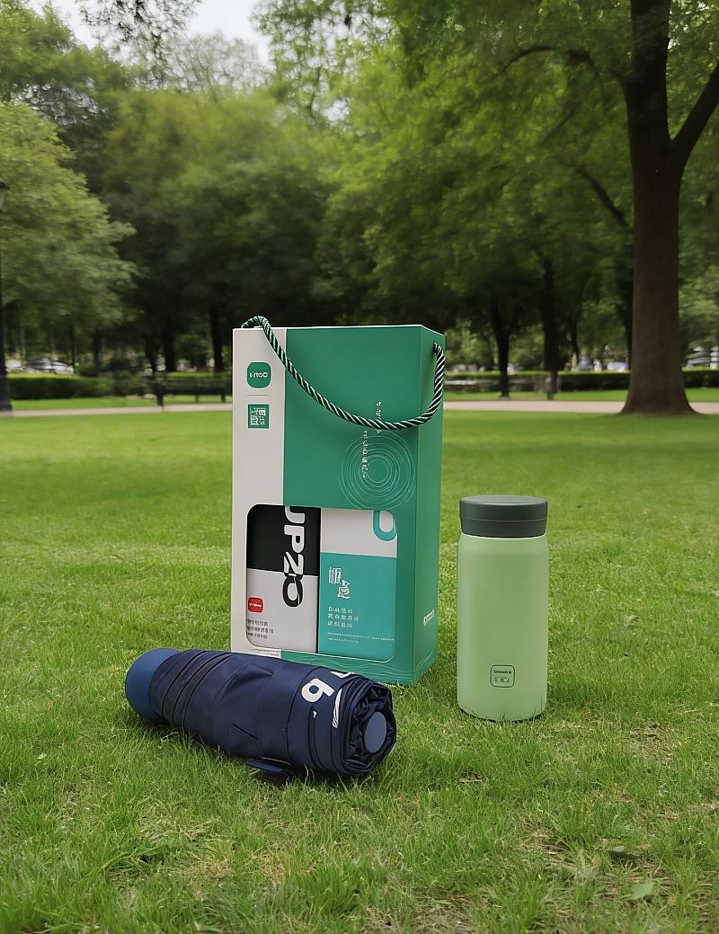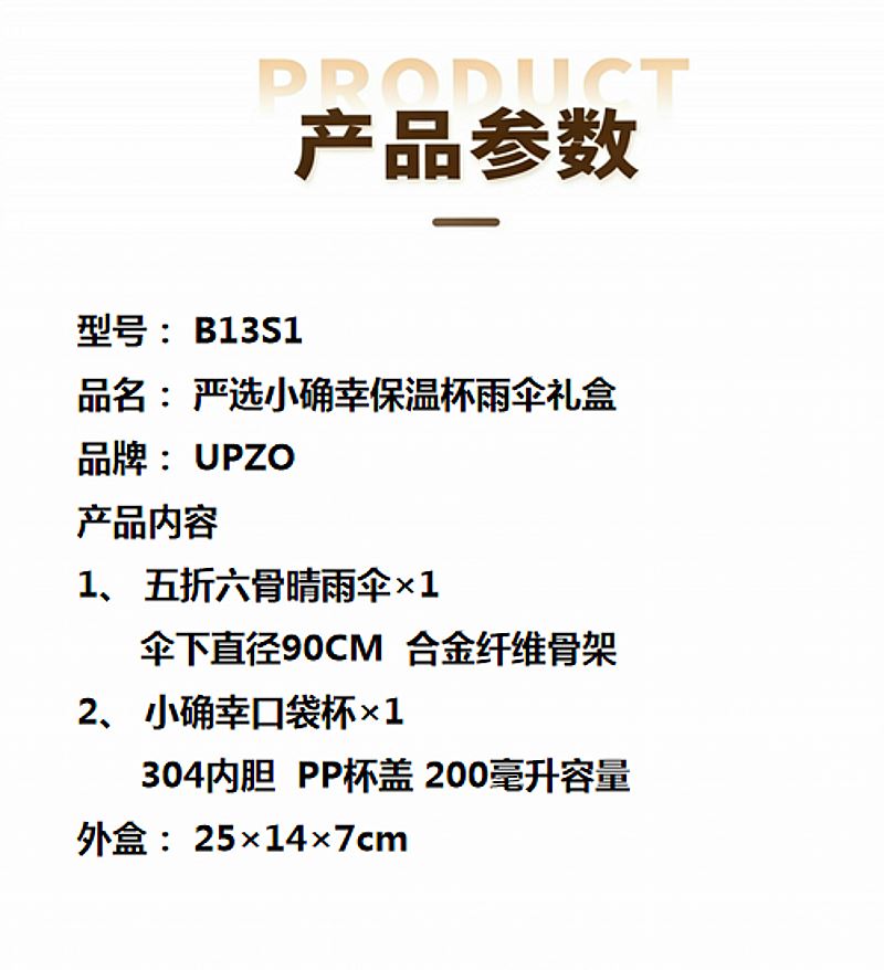 产品内容 1、 五折六骨晴雨伞×1 伞下直径90CM 合金纤维骨架 2、 小确幸口袋杯×1 304内胆 PP杯盖 200毫升容量 外盒: 25×14×7cm 五折六骨晴雨伞 胶囊伞尺寸设计 黑胶隔热 小确幸保温杯 200毫升口袋杯 撞色设计 304内胆