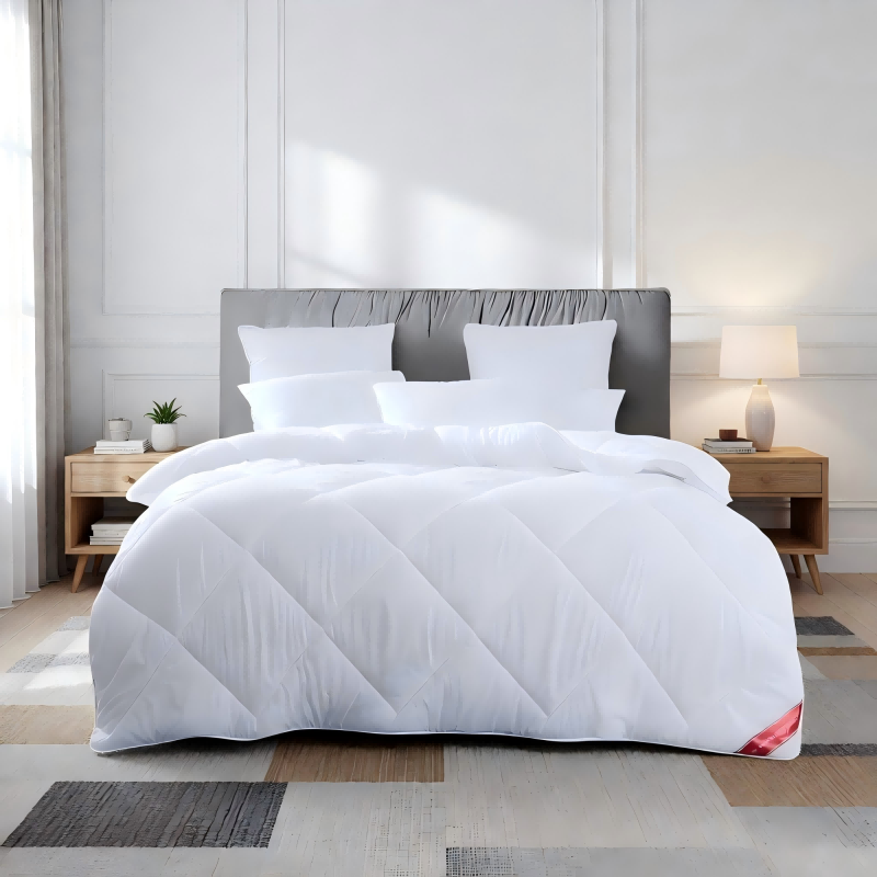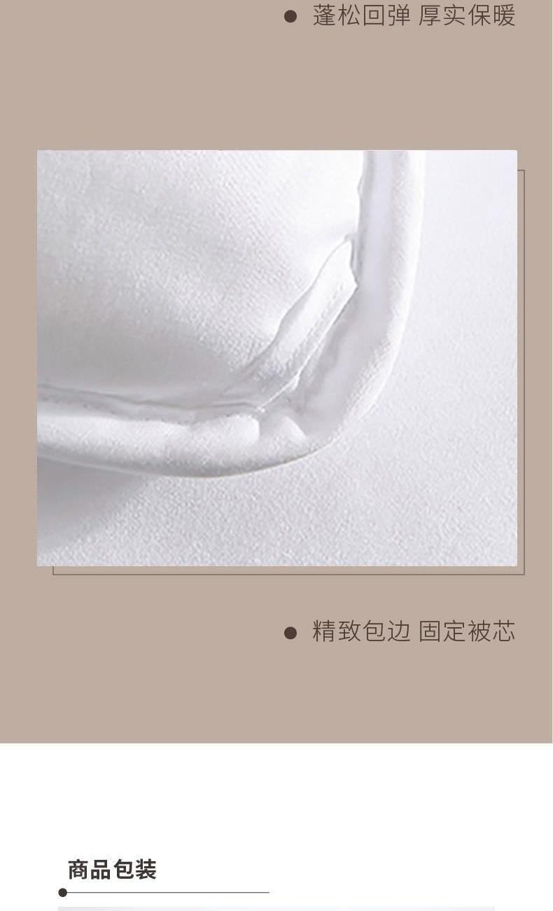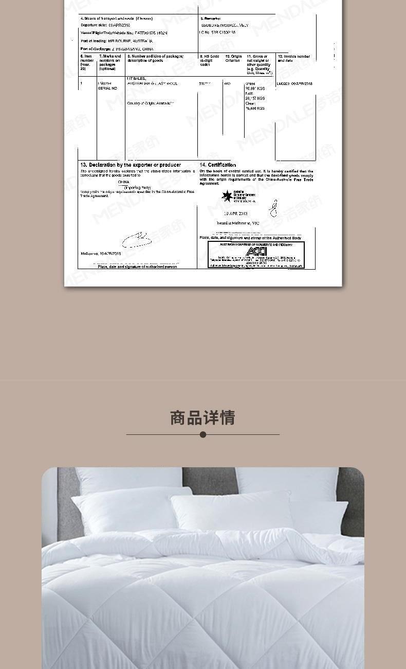 面 料:全涤磨毛 尺 寸:200×230cm 填充物 : 51%澳毛+49%聚酯纤维 填充克重:800g 填充:羊毛本身具有良好的吸、放湿性。羊毛工艺与纤维均匀混纺,平整且蓬松,无异味。 面料:手感细腻,亲肤柔软,舒适贴合; 工艺:蓬松回弹、厚实保暖;细致包边,固定被芯。