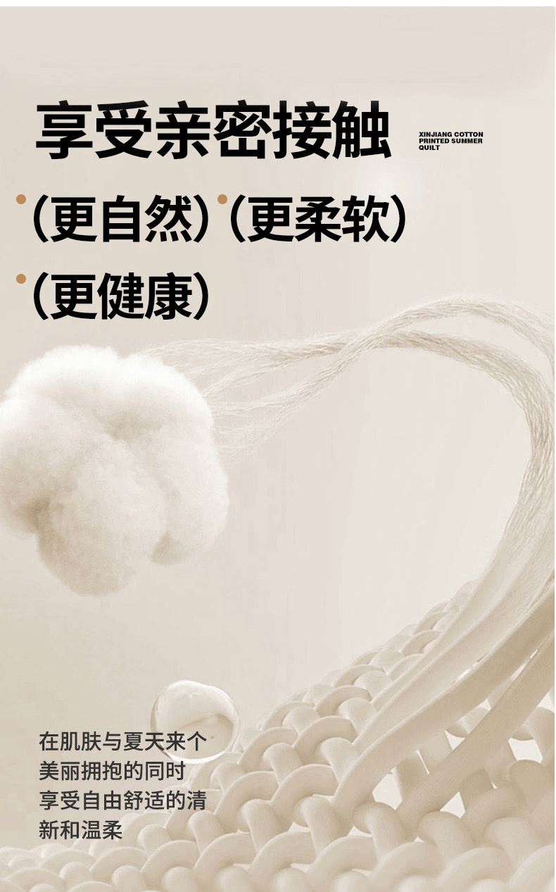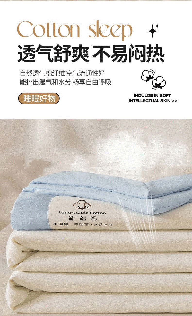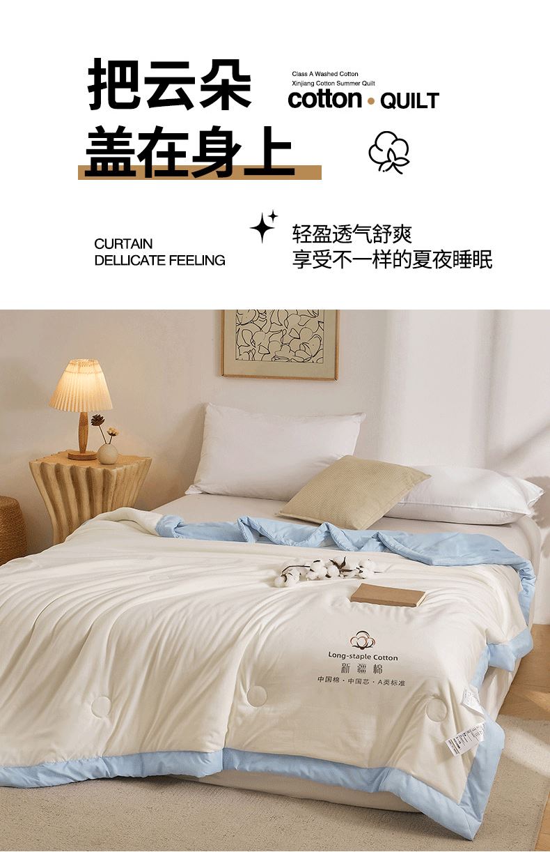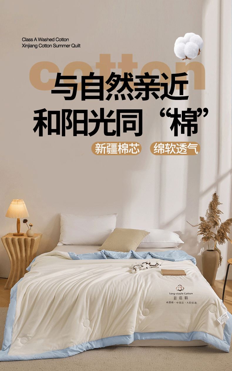 尺寸:150*200cm 面料:水洗棉 填充:新疆棉花 执行标准:GB/T22796-2021 安全类别:GB18401-2010 B类 1.臻选水洗棉面料,源于自然的绵软触感 质感丰盈软糯与肌肤零距离接触,弹性更优良。 2.填充超柔羽丝纤维适合肌肤敏感,零压体验,释放身心压力:科学分区设计:根据人体工学原理,将被子划分为不同区域,承托身体各部位,有效缓解压力,促进血液循环。