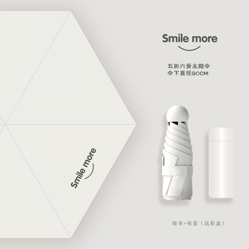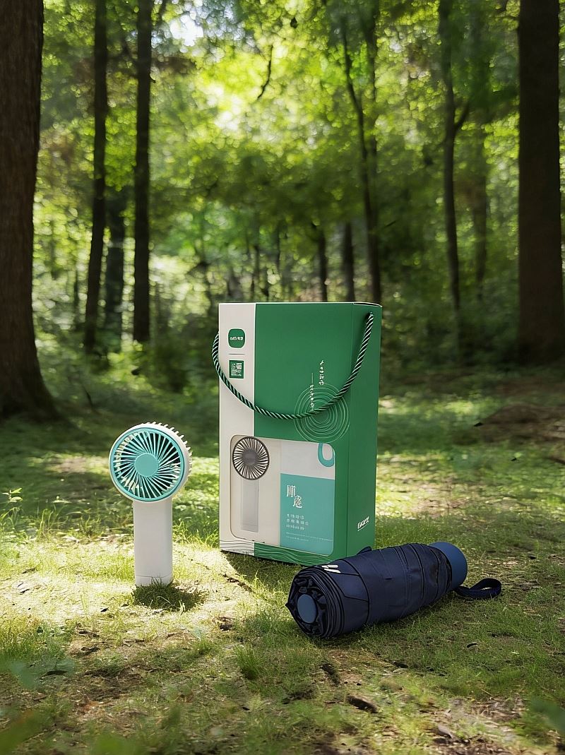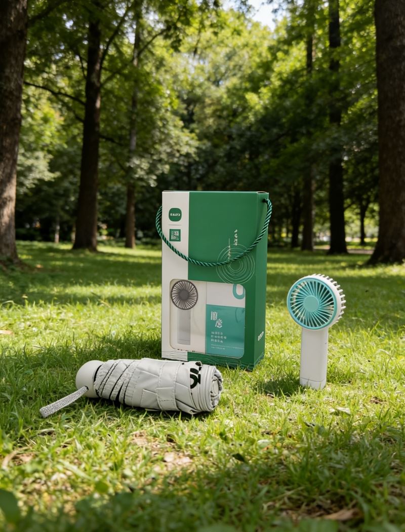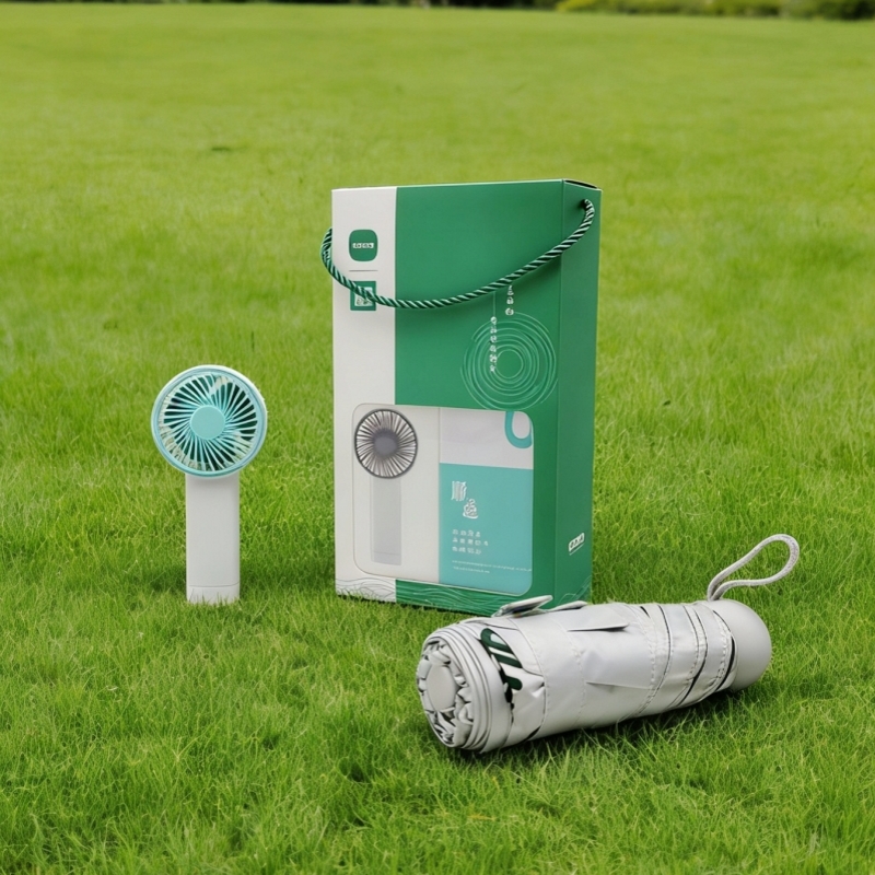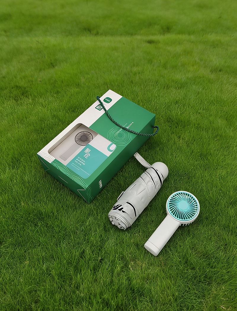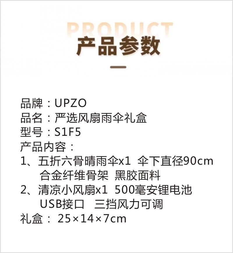 型号:S1F5 产品内容: 1、五折六骨晴雨伞(胶囊伞)×1 伞下直径90CM 合金纤维骨架 黑胶面料 2、清凉小风扇*1 500毫安锂电池 USB接口 (续航时间90分钟左右 三挡风力可调) 礼盒规格:25*14*7CM 五折六骨晴雨伞 胶囊伞尺寸设计 黑胶隔热 清凉小风扇 500毫安 续航90分钟左右 风力三挡