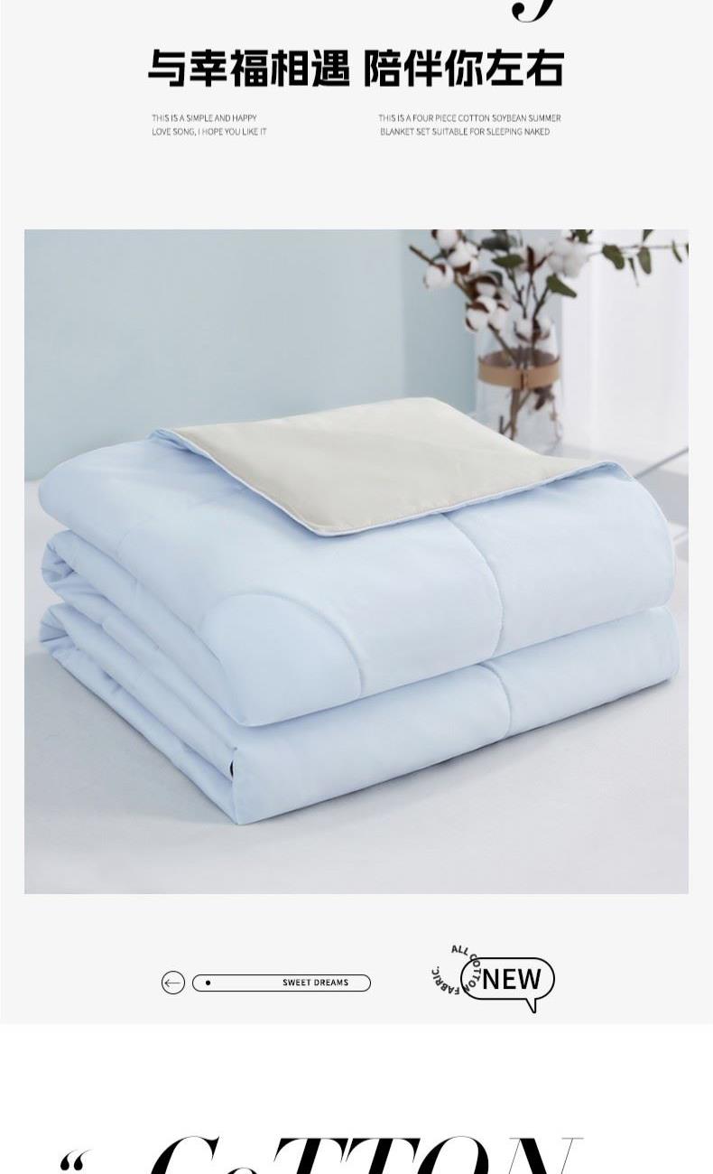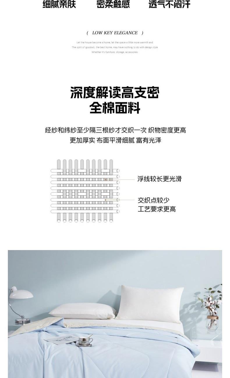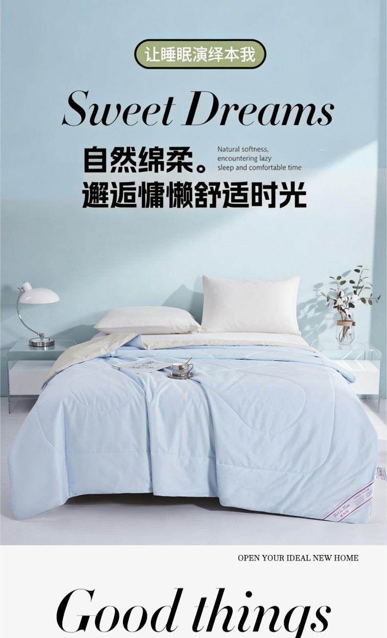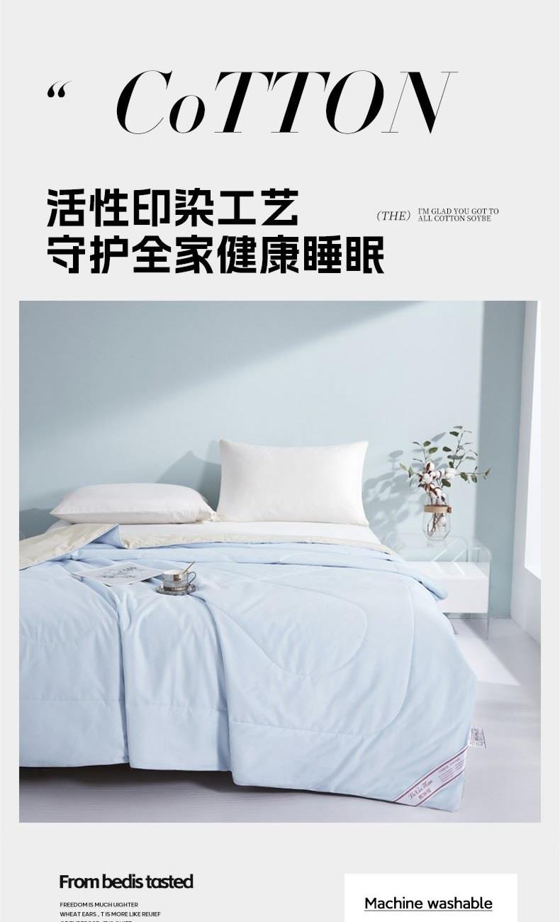 货 号:BGM-B2607 规 格:180*220cm 面料成份:棉 克 重:1300g 填充物:羽丝纤维/大豆纤维 1.133*76高支高密全棉面料 2.新一代锁牢活性印染,无染不褪色 3.AB版淡雅系双拼点绗麻绳锁边设计 4.比例大豆纤维填充,透气健康舒适