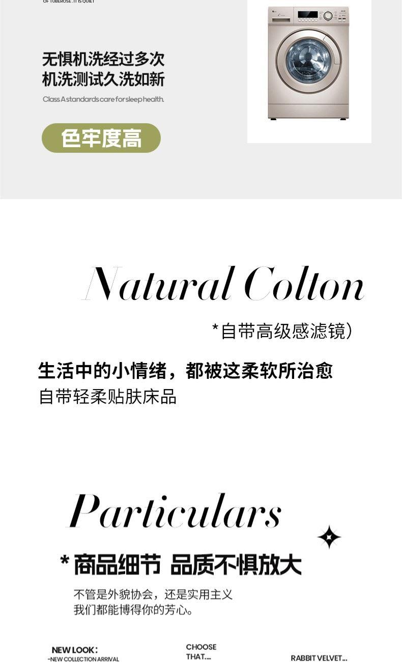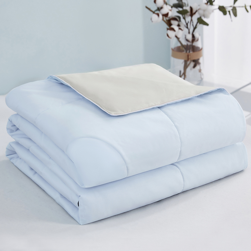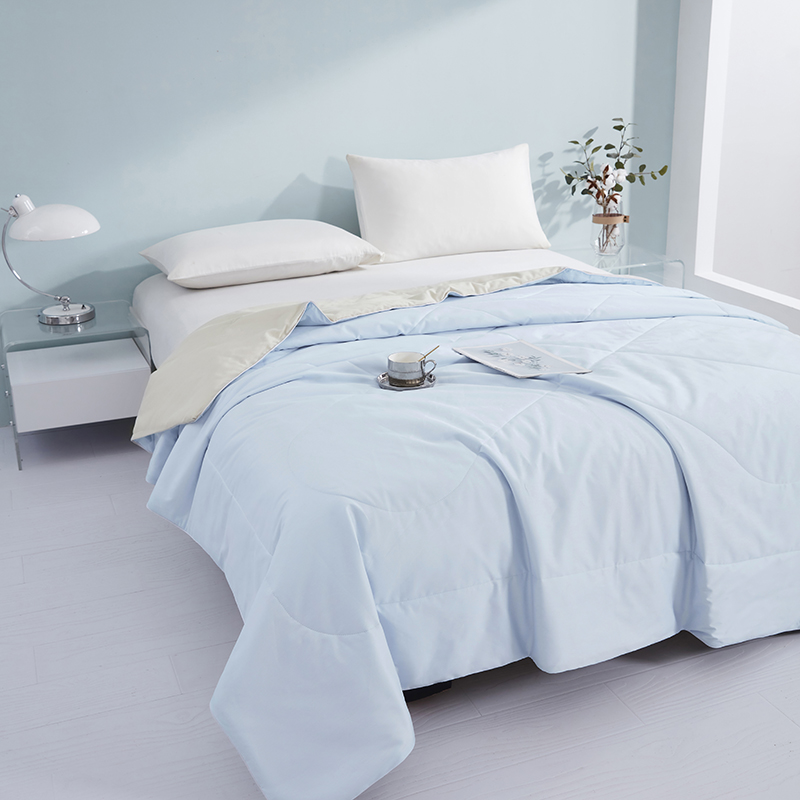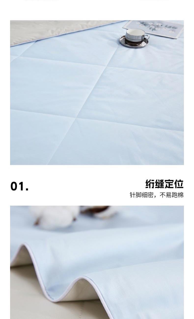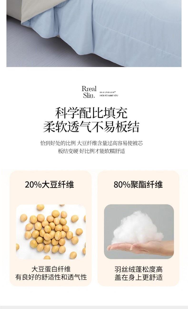 货 号:BGM-B2607 规 格:180*220cm 面料成份:棉 克 重:1300g 填充物:羽丝纤维/大豆纤维 1.133*76高支高密全棉面料 2.新一代锁牢活性印染,无染不褪色 3.AB版淡雅系双拼点绗麻绳锁边设计 4.比例大豆纤维填充,透气健康舒适