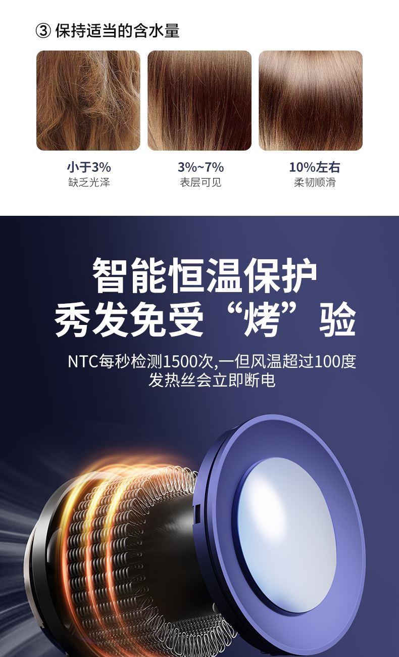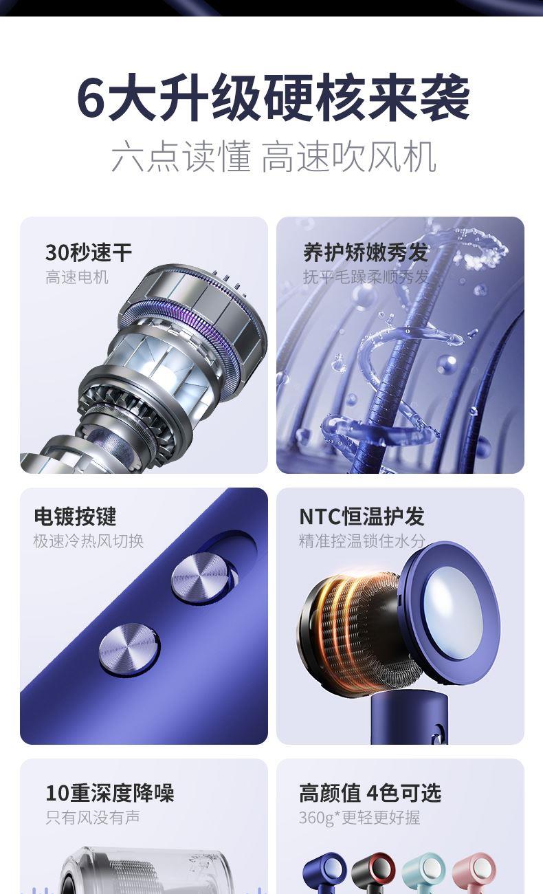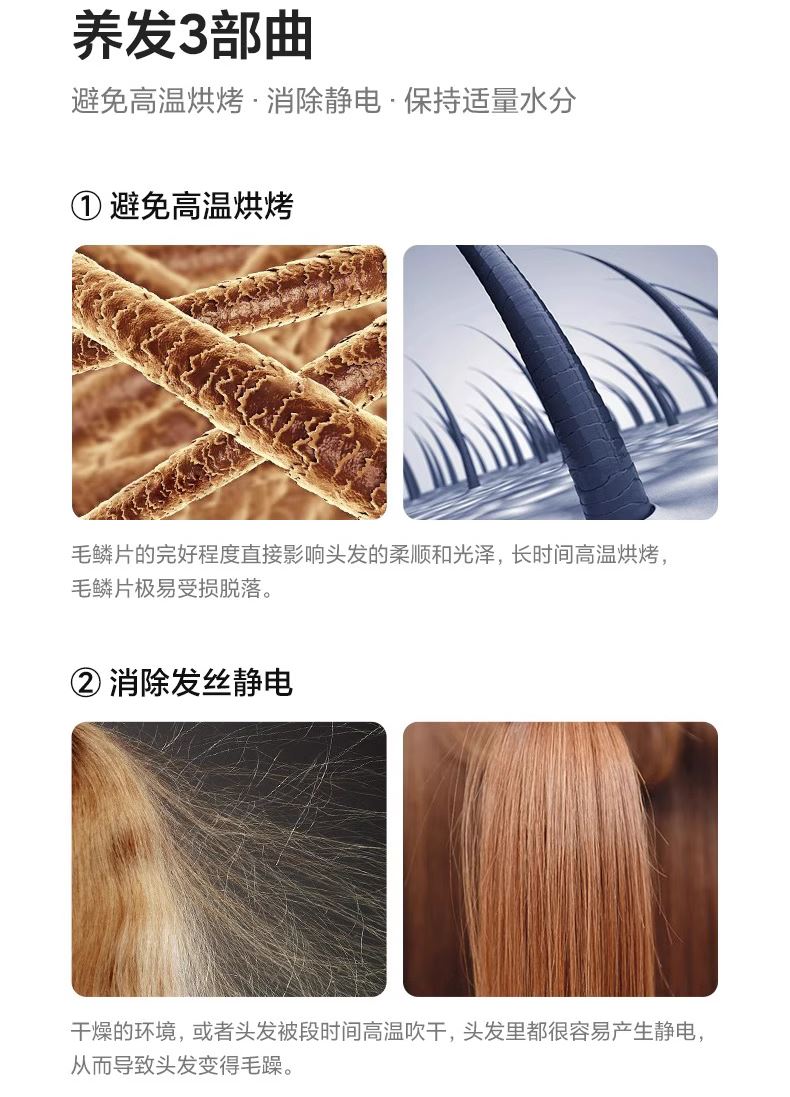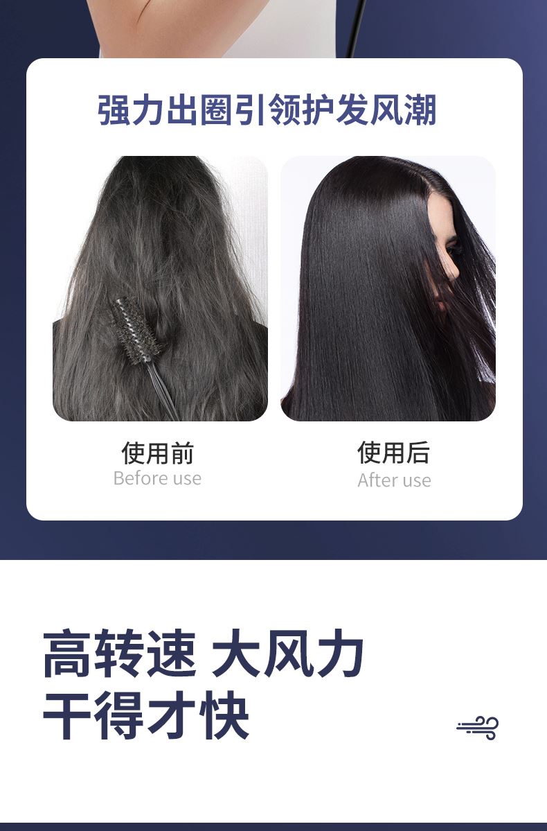 电压:220V 电源线长:1.8M 额定功率:1600W 极速干发:65M/S 高风速,强劲气流直达发根,30 秒快速干发,顷刻告别湿发烦恼 柔顺亮泽:强效修复 发质,修复力,吹完发丝顺滑有光泽 轻巧便携:仅 360g 机身,360° 轻松握持,随身携带无负担 智能护发:智能温控,恒温出风,温柔守护头皮健康不烫伤 高效省心:快速干发 + 护发修复一步到位,居家出行皆适用