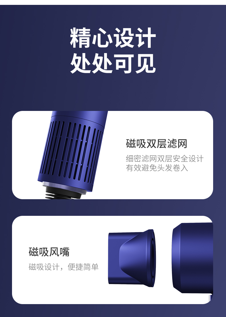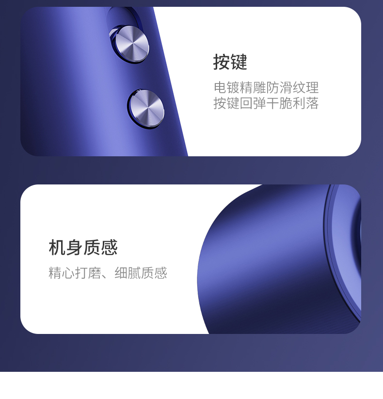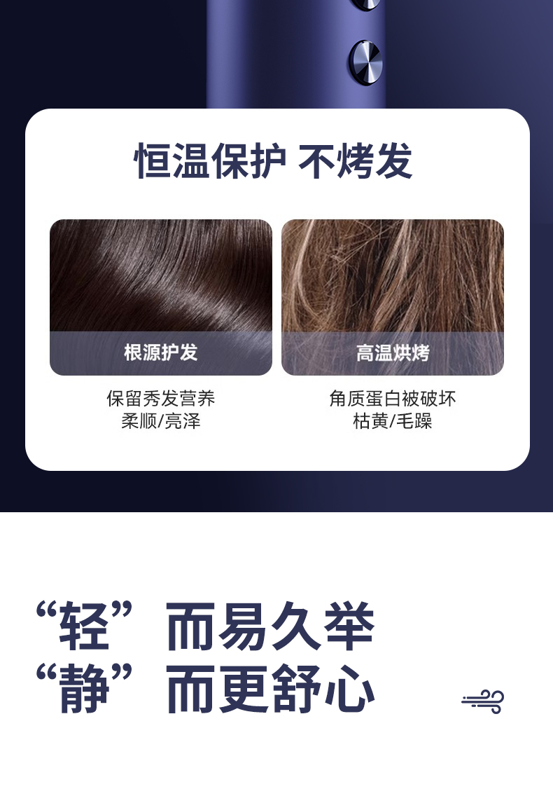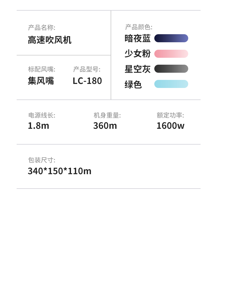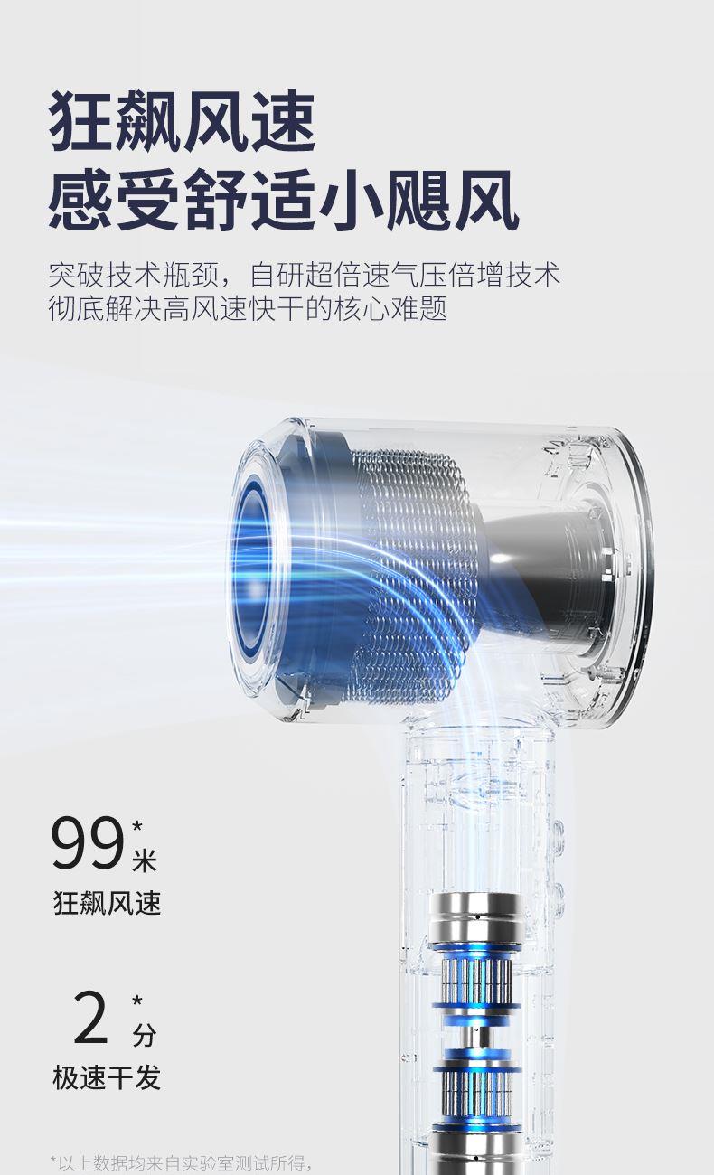 电压:220V 电源线长:1.8M 额定功率:1600W 极速干发:65M/S 高风速,强劲气流直达发根,30 秒快速干发,顷刻告别湿发烦恼 柔顺亮泽:强效修复 发质,修复力,吹完发丝顺滑有光泽 轻巧便携:仅 360g 机身,360° 轻松握持,随身携带无负担 智能护发:智能温控,恒温出风,温柔守护头皮健康不烫伤 高效省心:快速干发 + 护发修复一步到位,居家出行皆适用