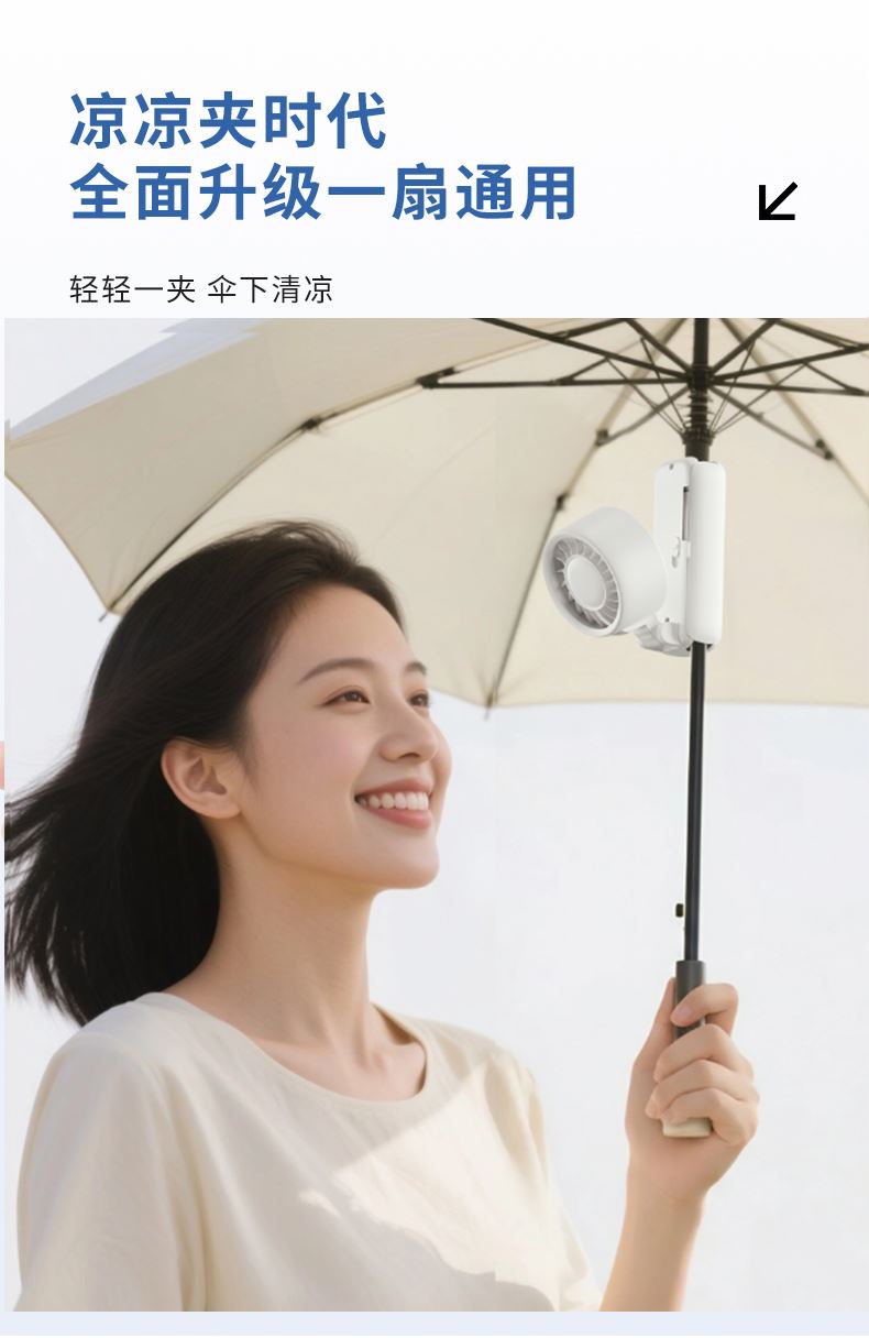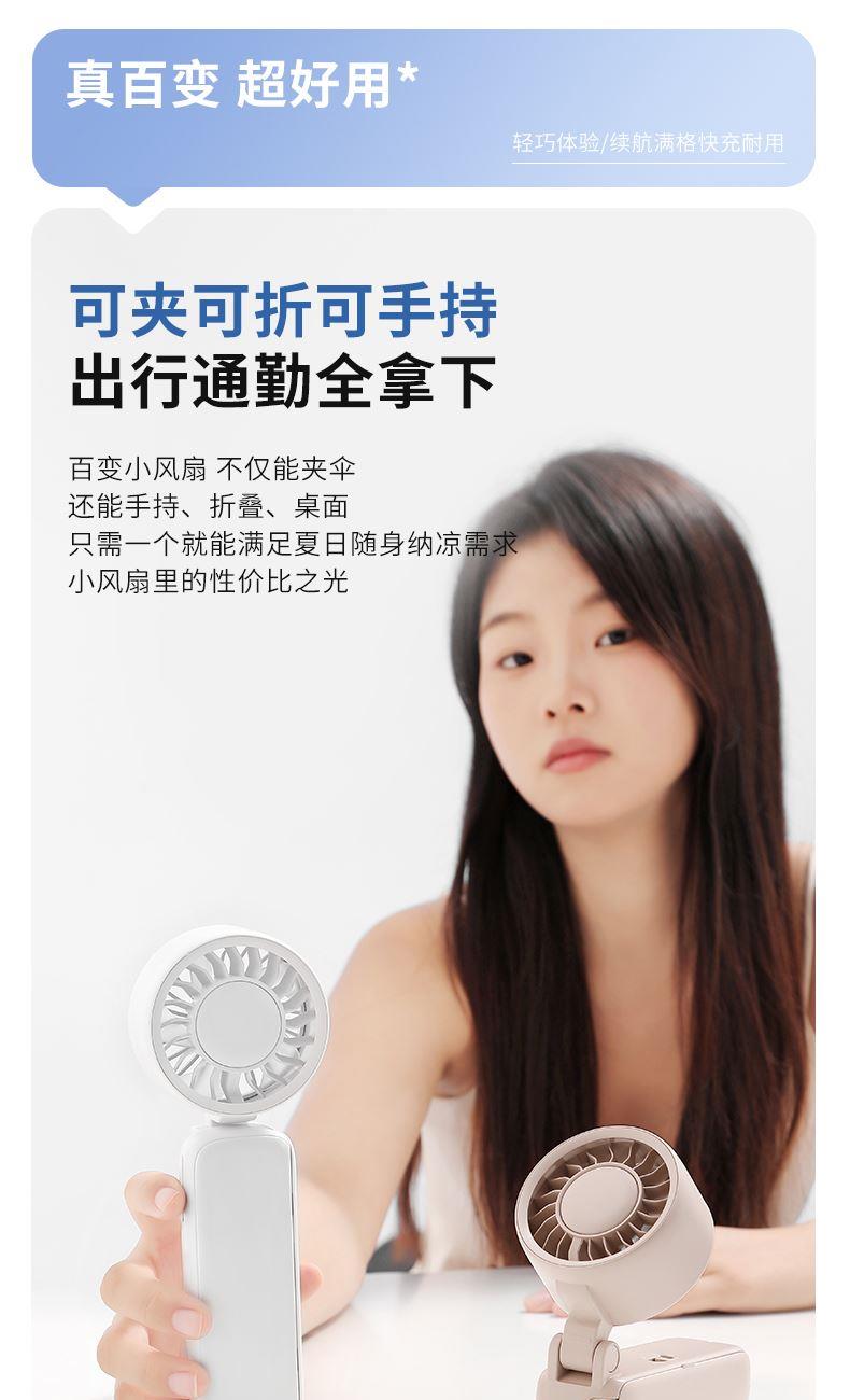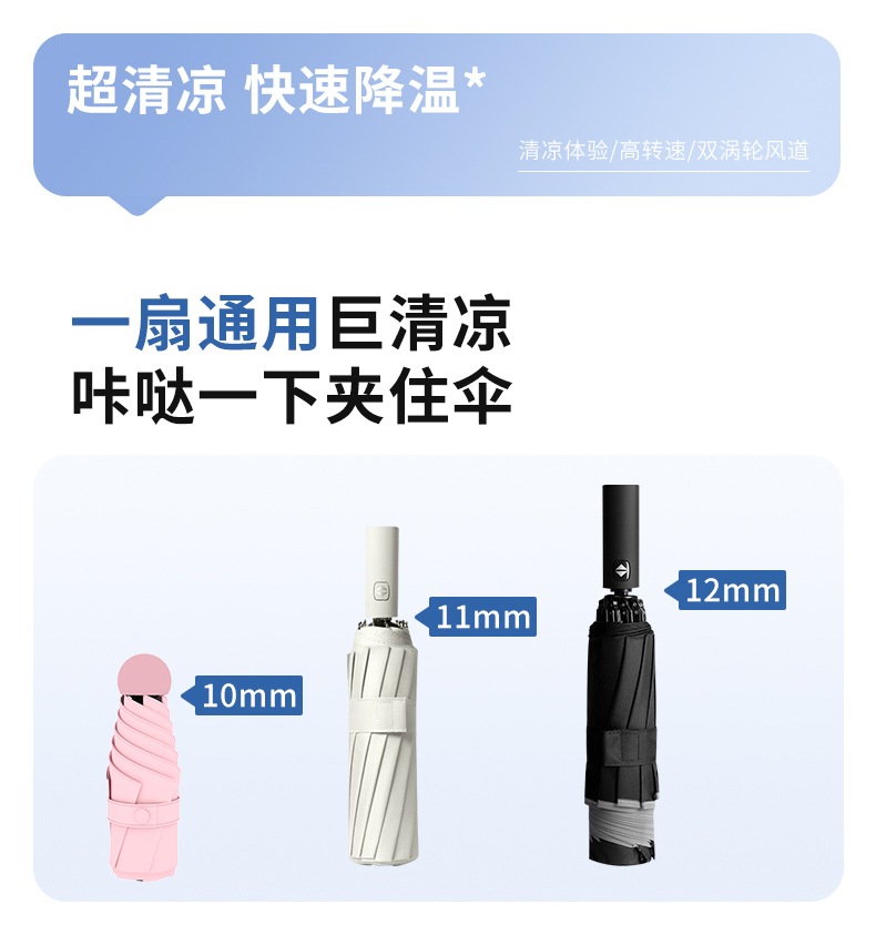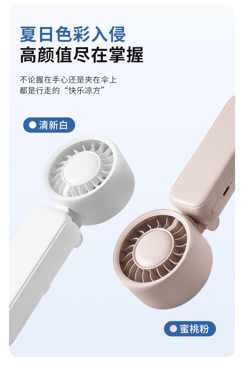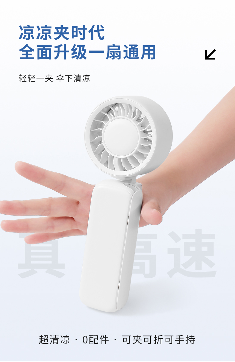 *6500RMP大风力,3档自由调节 *可手持、可夹雨伞、可折叠,等多实用场景 *支持小批量定制LOGO