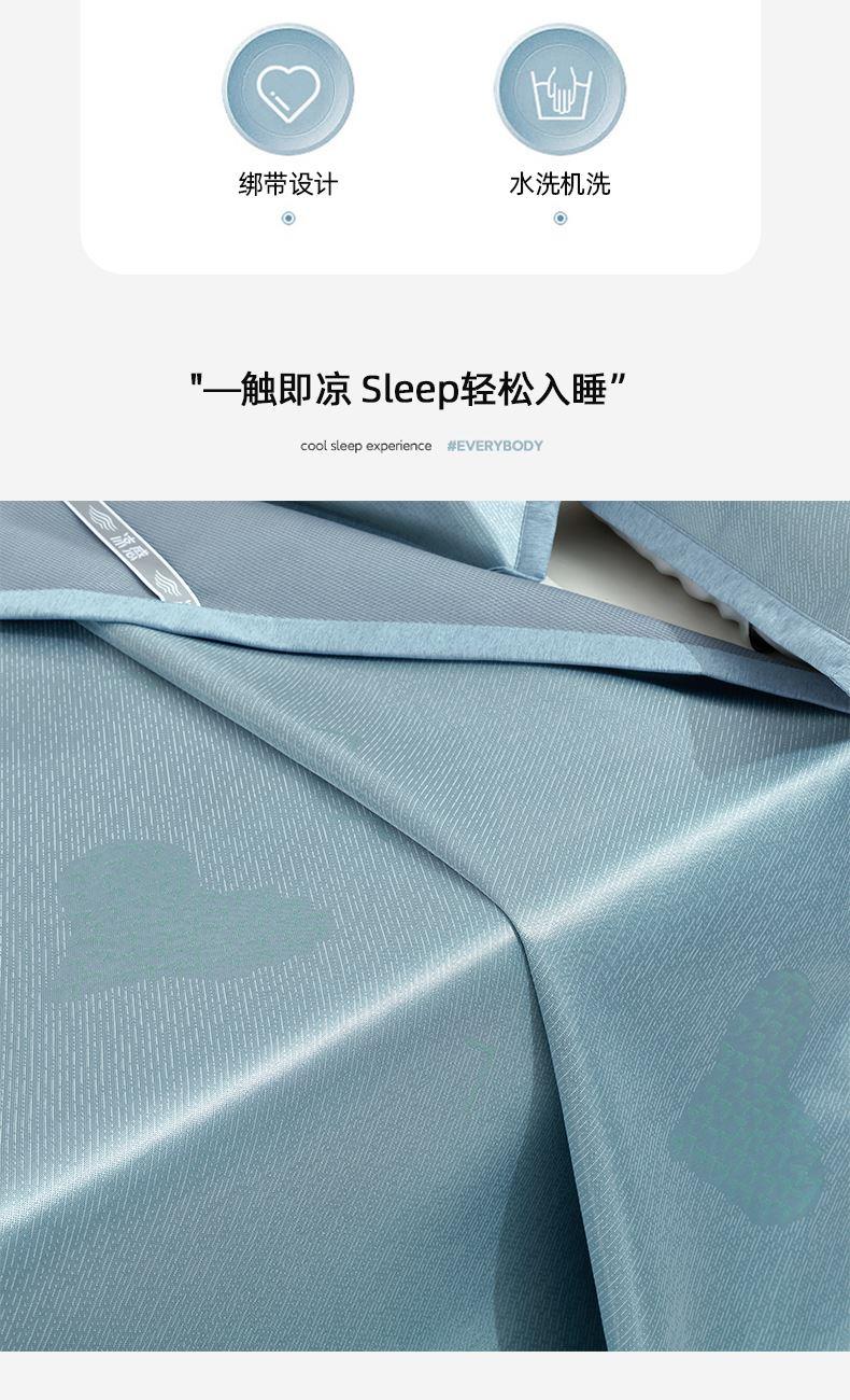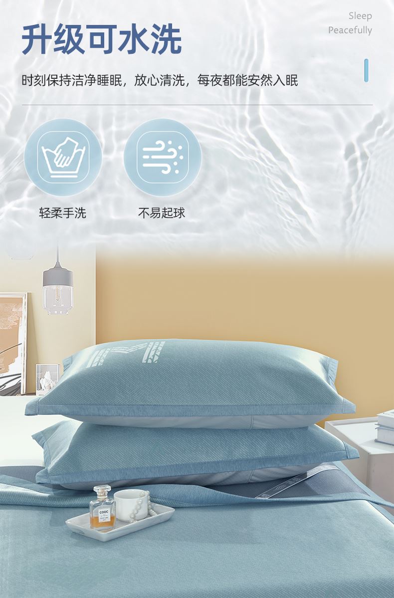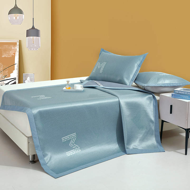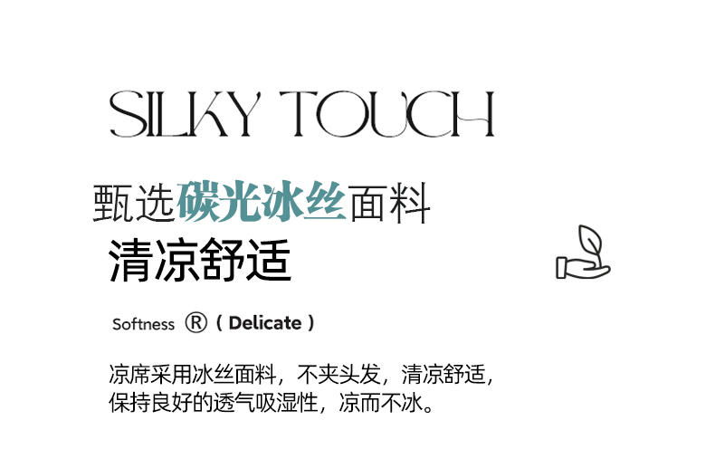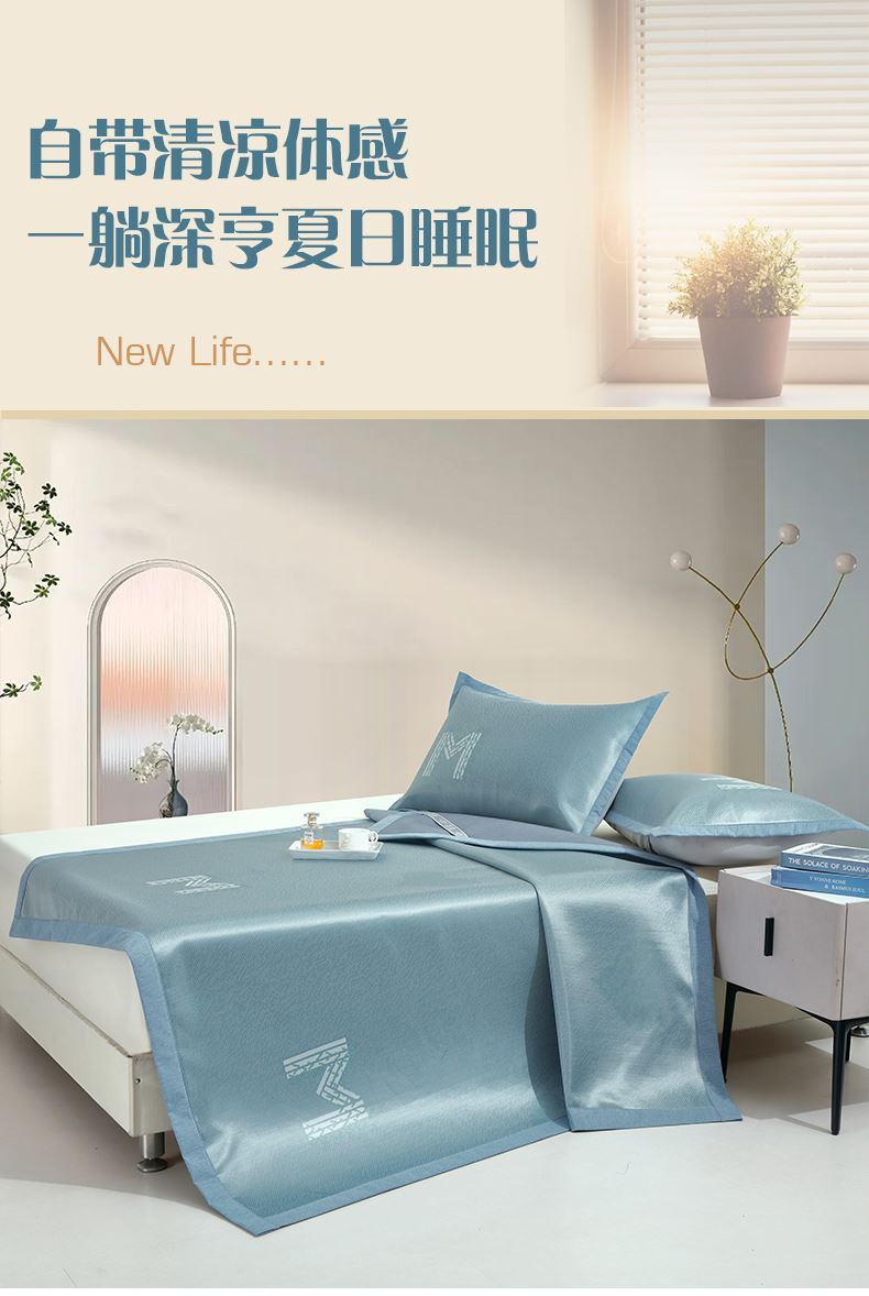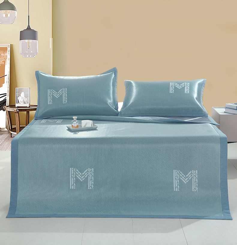 格:180*200cm 枕套:48*74cm*2 面料:碳光冰丝 复合料:三明治 执行标准:Q/TDY 01-2016 安全类别:GB18401-2010 B类 1.高密碳光冰丝席,自然清凉,凉而不冰,久睡不粘。 2.碳光凉感冰丝纤维织物本身经过处理,可以破坏细菌的寄生环境,有效防止细菌滋生进入,切断它们的食物链,洁净卫生,适合裸睡。