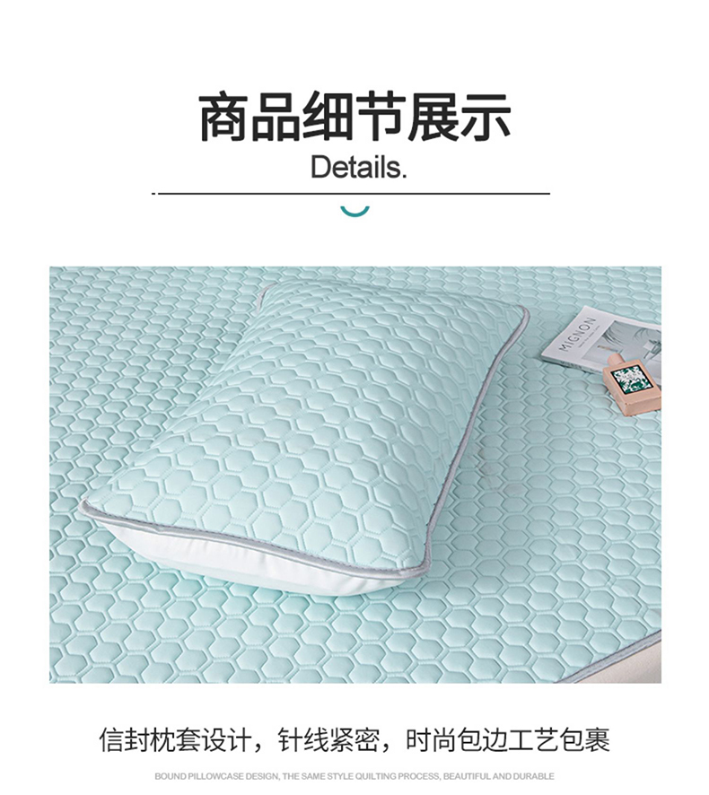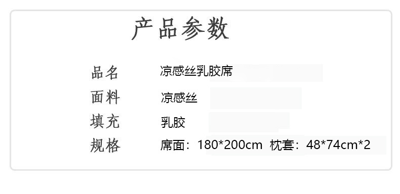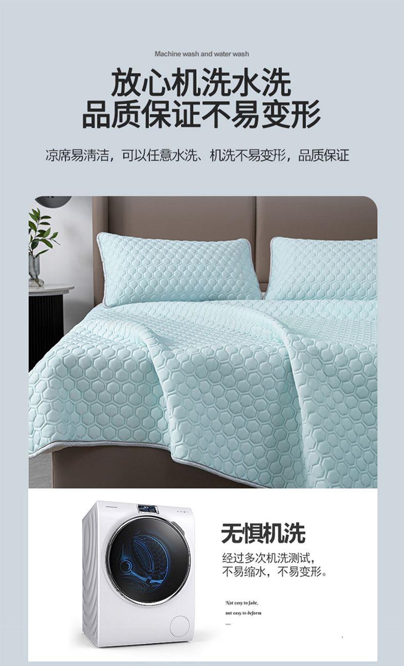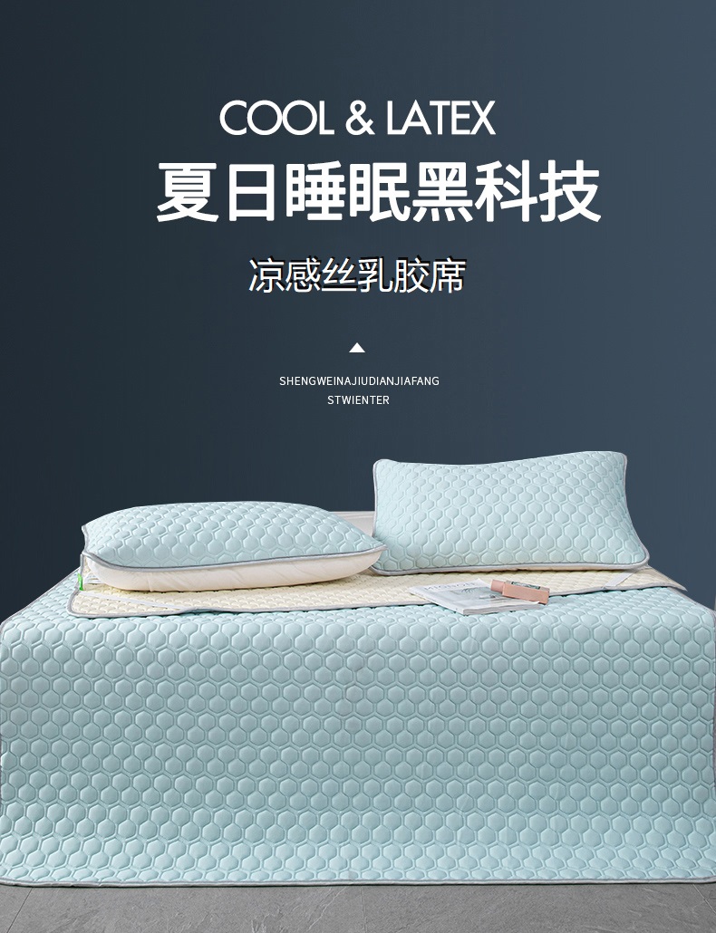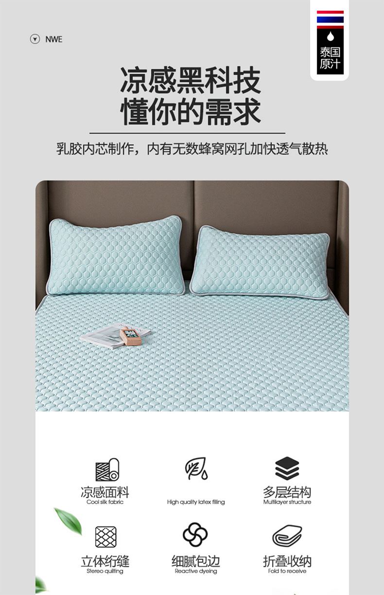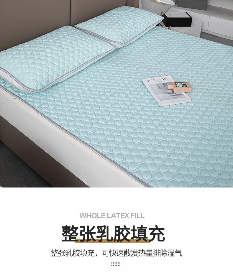 规格:180*200cm*1 枕套:48*74cm*2 面料:凉感丝 填充:乳胶 产品特点: 1.凉感丝凉感面料,不闷不燥不粘腻。 2.采用绗缝工艺,有效固定内部纤维填充,久用不易变形。 3.采用乳胶填充,舒适度高,可以减少细菌和螨虫,乳胶凉席回比较好,可以水洗,比较耐用。