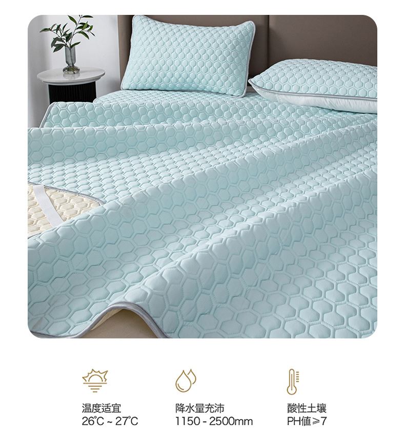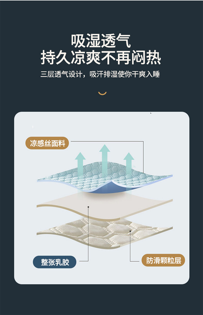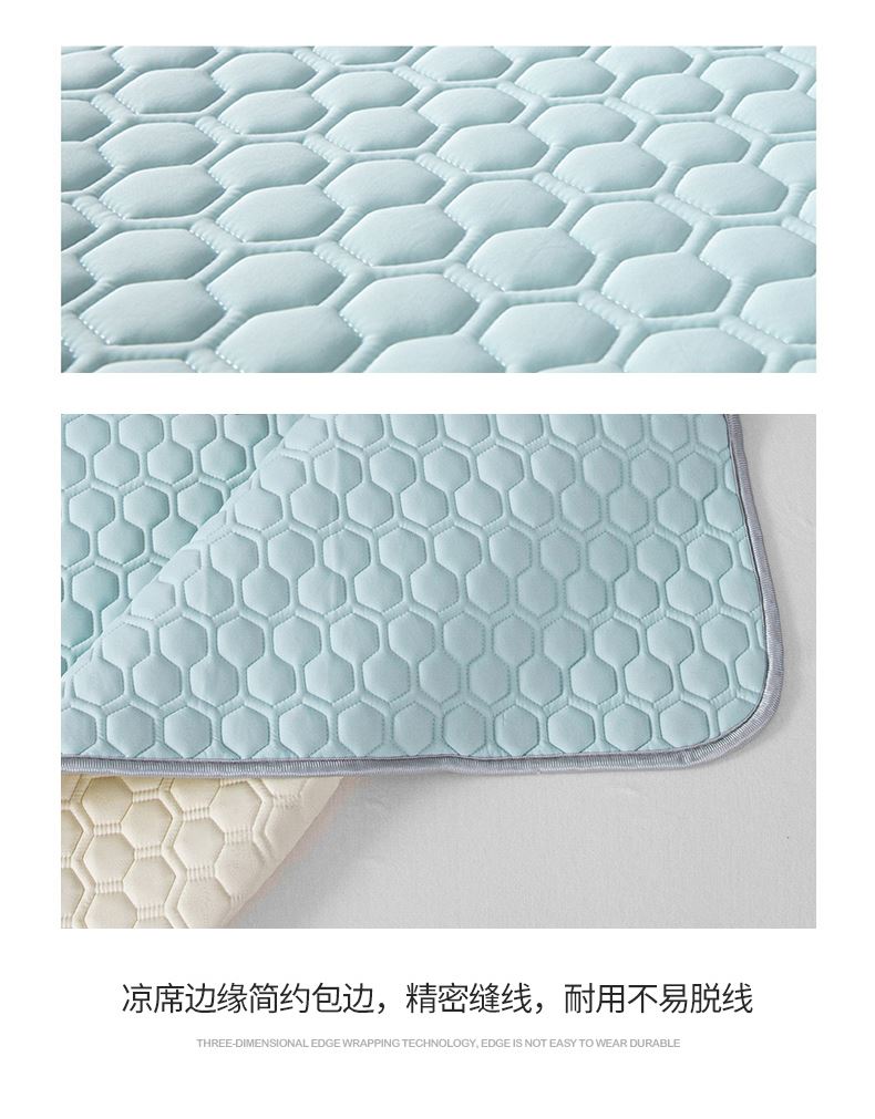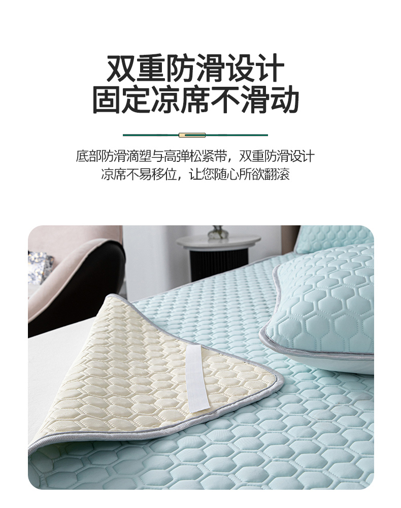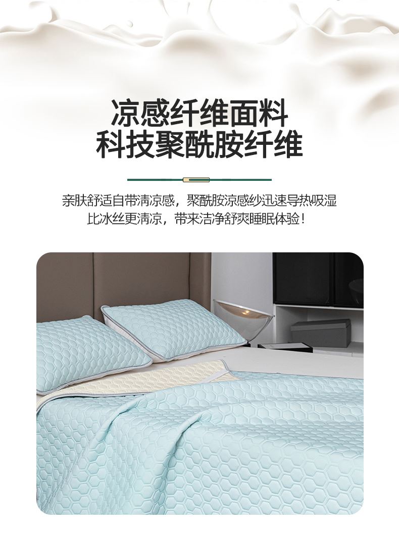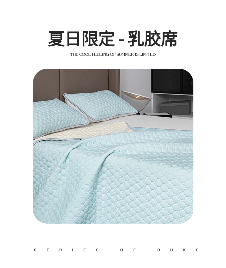 规格:180*200cm*1 枕套:48*74cm*2 面料:凉感丝 填充:乳胶 产品特点: 1.凉感丝凉感面料,不闷不燥不粘腻。 2.采用绗缝工艺,有效固定内部纤维填充,久用不易变形。 3.采用乳胶填充,舒适度高,可以减少细菌和螨虫,乳胶凉席回比较好,可以水洗,比较耐用。