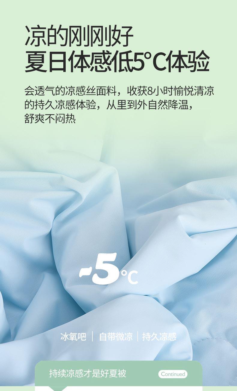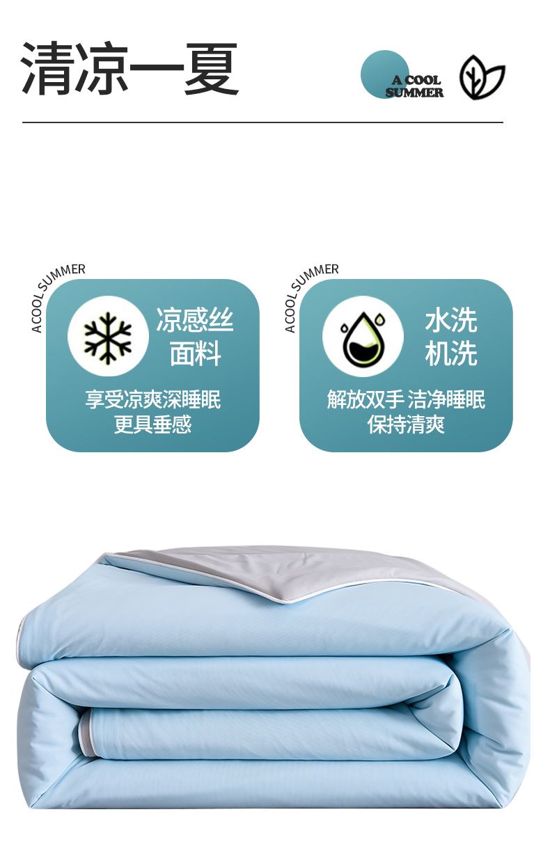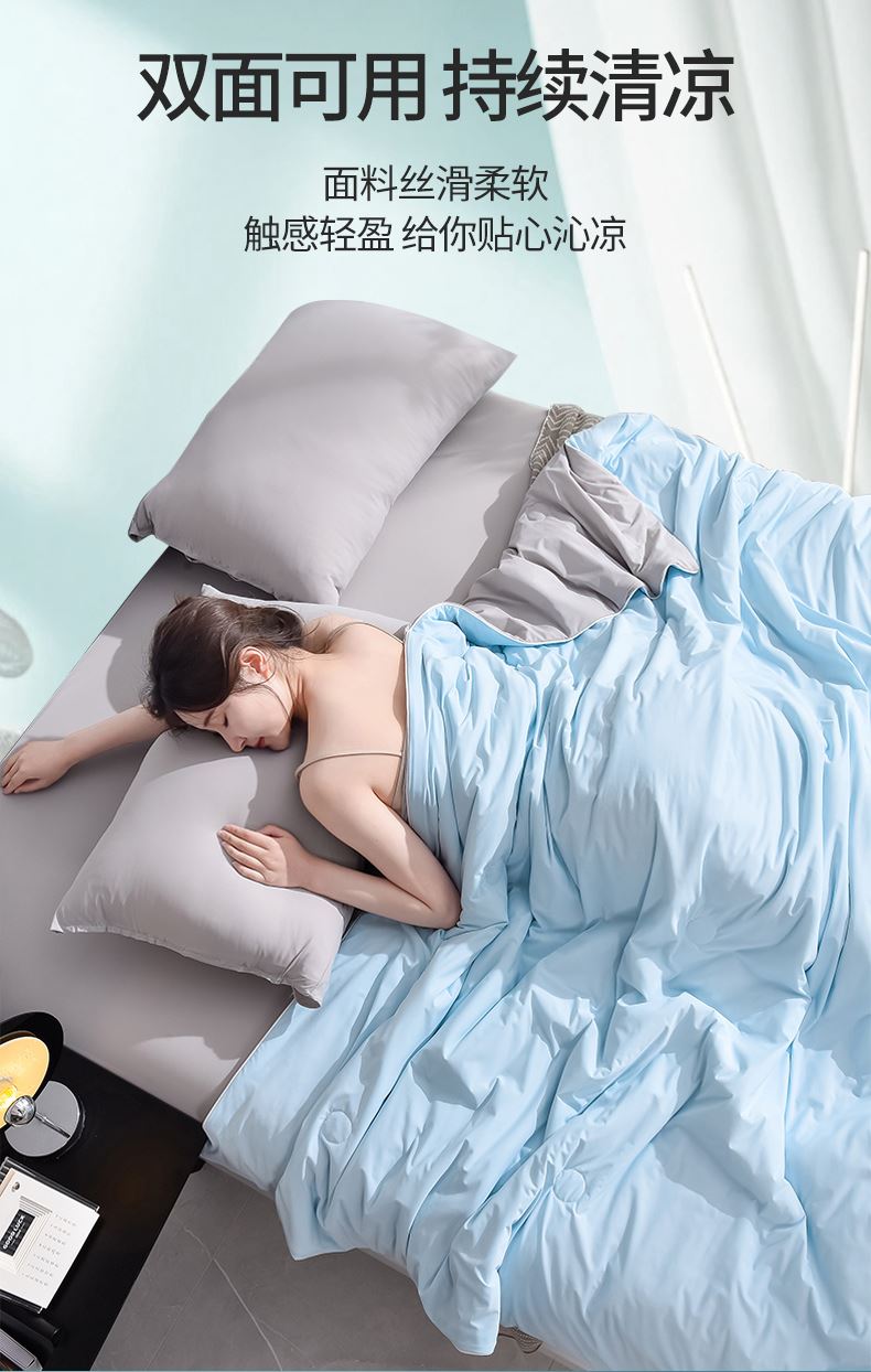 规格:200*230cm 面料:凉感丝(聚酯纤维) 填充:羽丝棉 重量:1500g 执行标准:GB/T22796-2021 安全类别:GB18401-2010 B类 1.凉感丝是一种科技纤维,这种纤维的吸湿性、透气性比普通纤维要好得多,同时还具有比较好的保型性和悬垂性。 2.凉感丝的含湿率符合人体皮肤的生理要求,具有光滑凉爽、透气、抗静电、防紫外线,色彩绚丽的特点。且具有棉的本质,丝的品质是地道的生态纤维,源于天然而优于天然。
