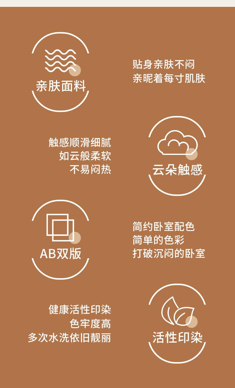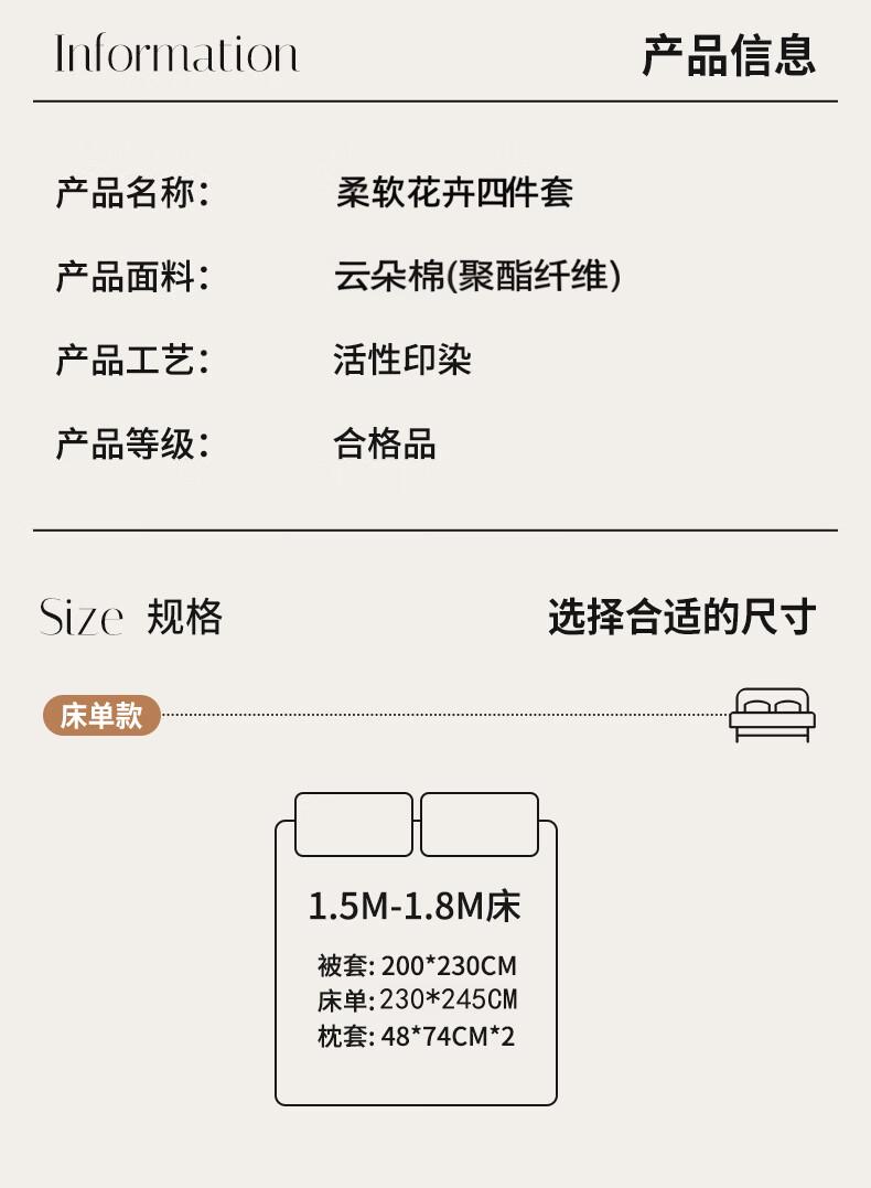 被套:200*230cm 床单:230*245cm 枕套:48*74cm*2 面料:云朵棉(聚酯纤维) 执行标准:GB/T22796-2021 安全类别:GB18401-2010 B类 1.优质云朵棉面料,纤维韧性强,拉力强度高,透气舒适贴身。种植物纤维织物,手感柔软,舒适质感丰厚,而且有厚重感,不褪色,不缩水,容易打理。 2.做工精制细腻,美观大方,朴实耐用,是您享受健康科技睡眠的必选佳品。