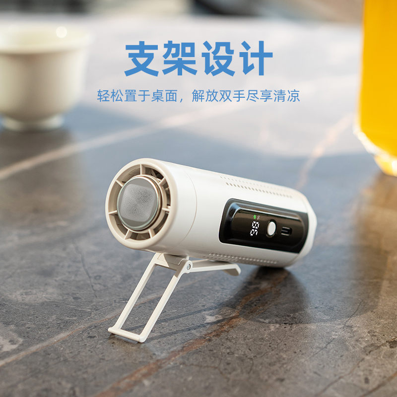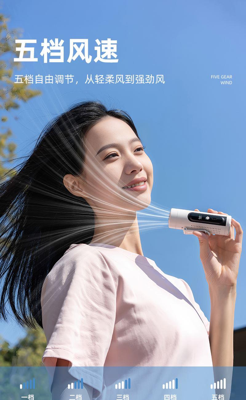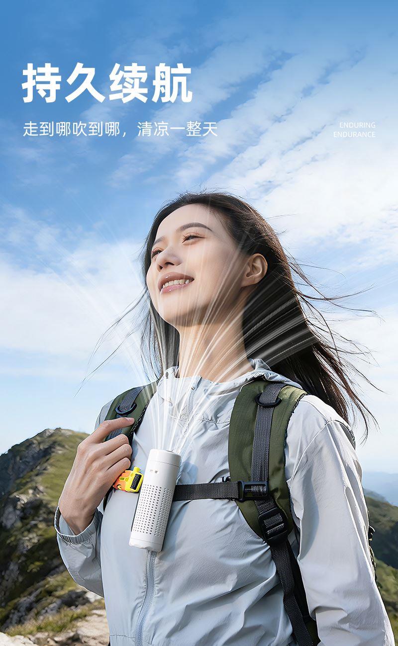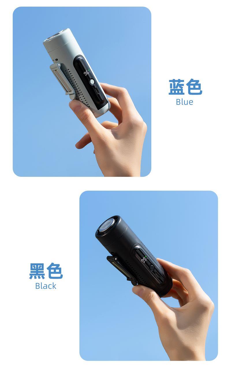 *多功能超轻制冷小风扇,仅140g *智能数显,20000转速真高速无刷电机 *高亮度LED手电筒,3000毫安 *5档大风力,可挂脖、可挂腰、可桌面、可手持 *360°进风口手心也降温