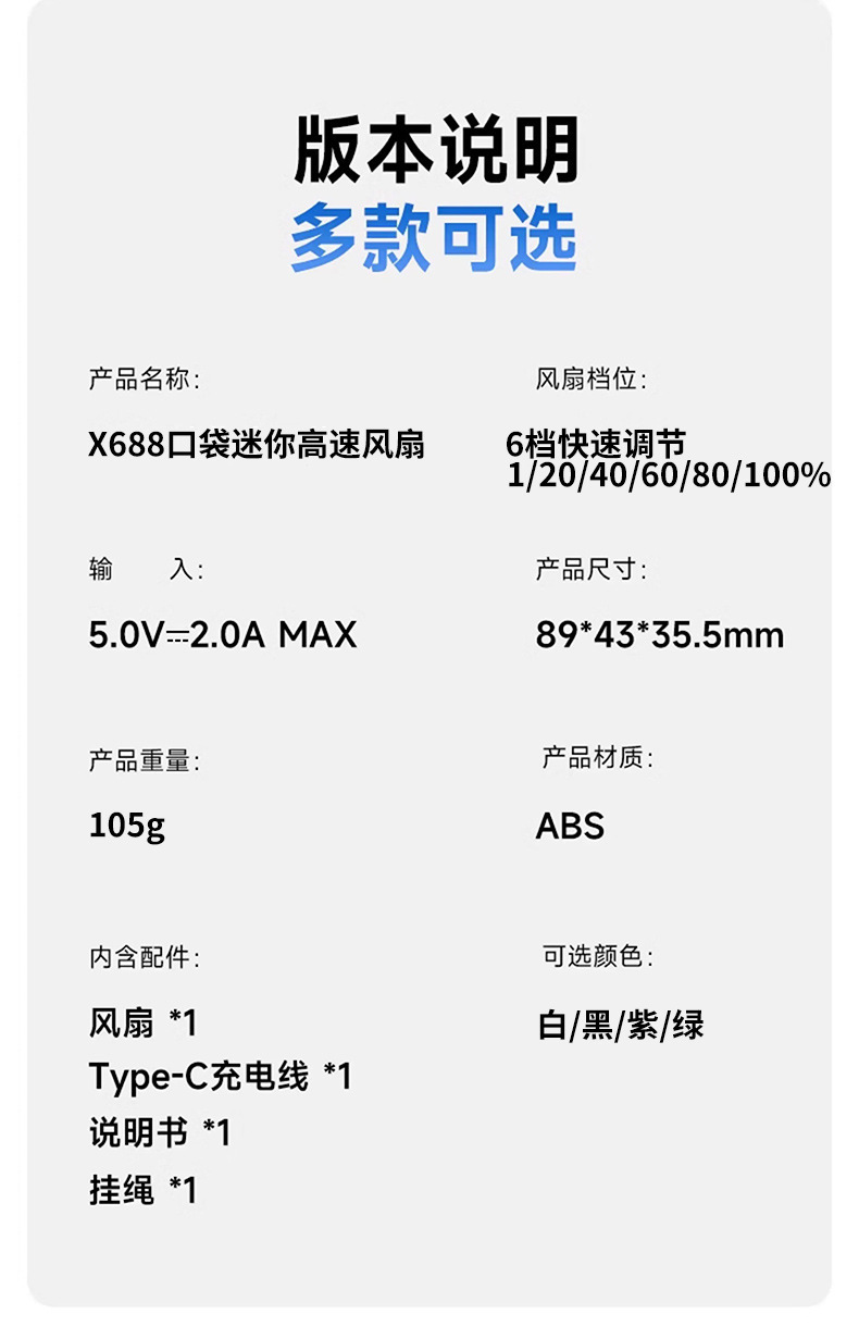 MINI高速手持小风扇X688 颜色:米色 绿色 紫色 灰色 整箱数量:100PCS 外箱:41*31.5*22cm 单个重量:107g 彩盒尺寸:59*39*99mm 整箱重量:13.5kg 尺寸:35.5*43*89mm 材质:ABS材质 容量:500mAh 包装:彩盒包装 【推荐理由】: 迷你精致小巧,方便携带高速风扇 5档数显可调节高速风扇 桌面/手持/户外多种使用方法 500毫安大容量电池待机更长