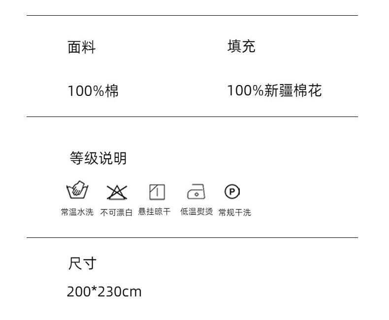 产品编码:JLY25513 产品规格:200*230cm 面料材质:棉 填充材质:新疆棉 净 重:1600g 礼盒 尺寸:520*400*120mm