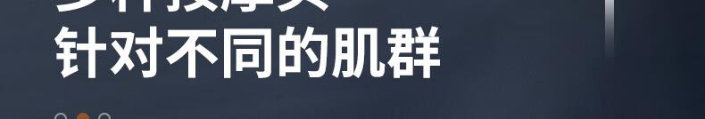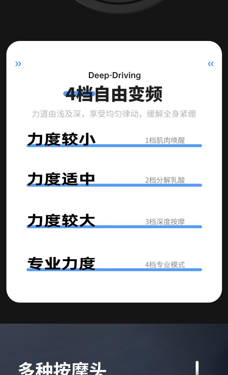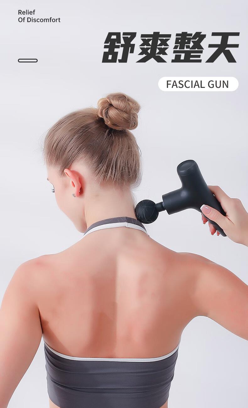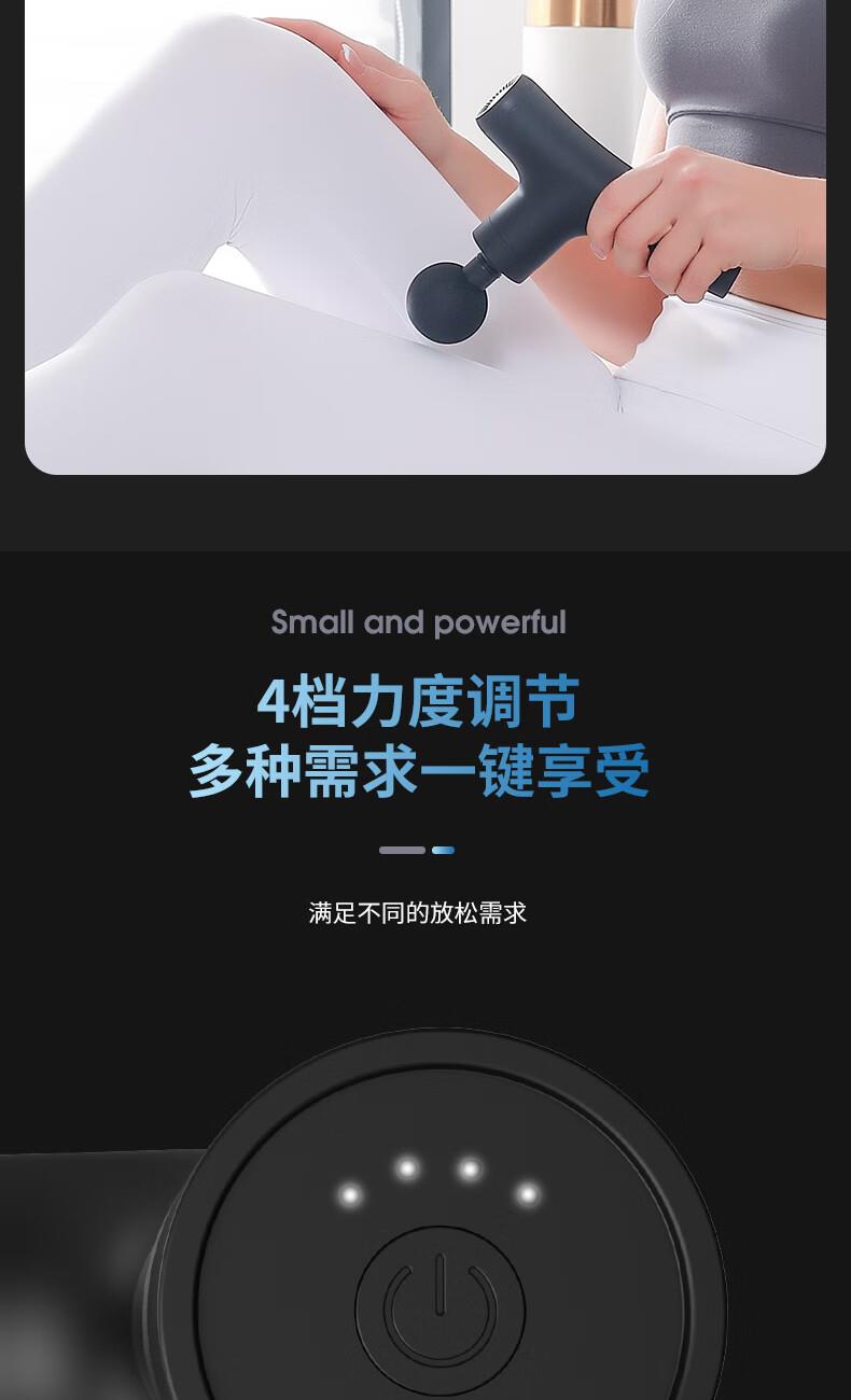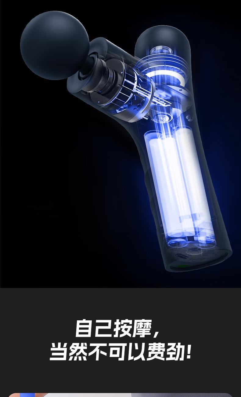 产品尺寸:12*12.4*3.6cm 产品克重:390g 输入电压:5V/2A 电压功率:20w 电机类型:有刷电机 机身材质:ABS 电池:1200mah 充电时间:2h 续航时间:2h 转速:3200转 按摩头:4个按摩头 档位:6档调节 包装:彩盒包装 颜色:黑色 1.耐摔防滑,降低噪音 2.高扭矩大功率无刷电机安全耐用 3.按摩头可以随意切换 4.小巧精致,便于携带