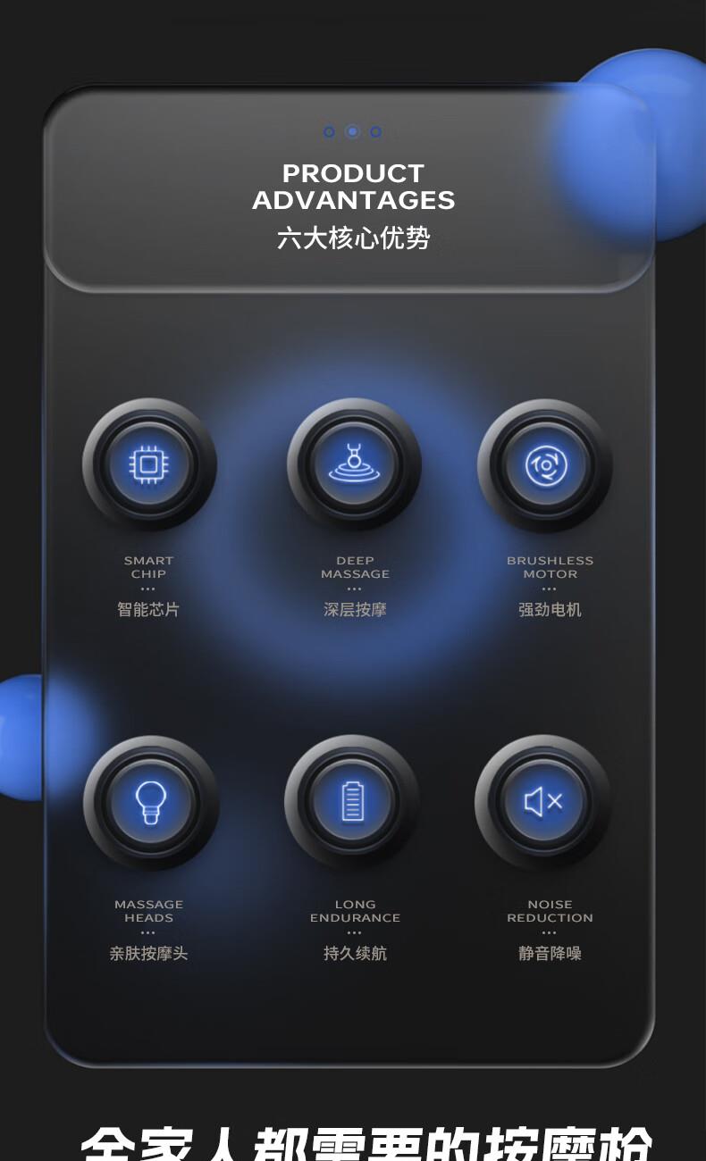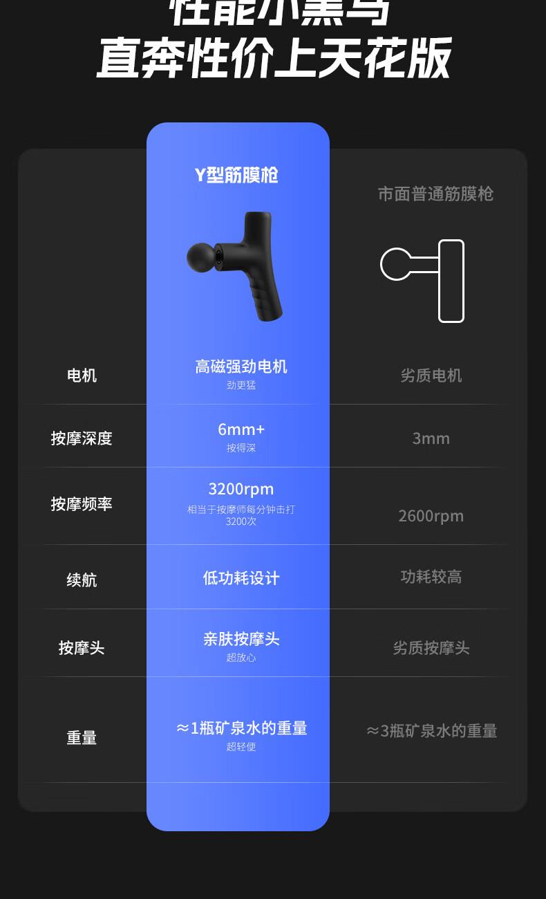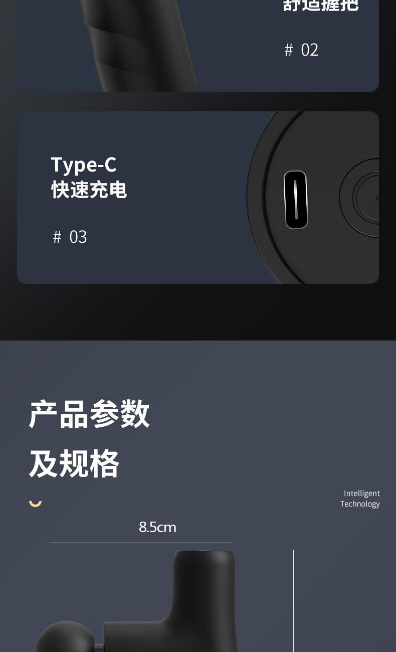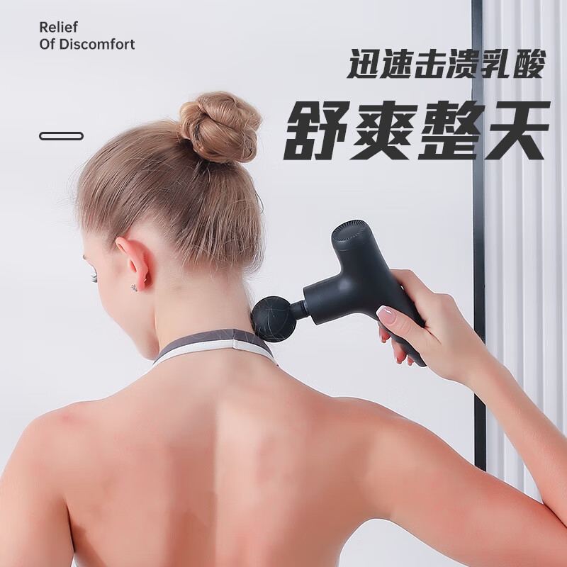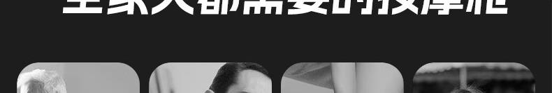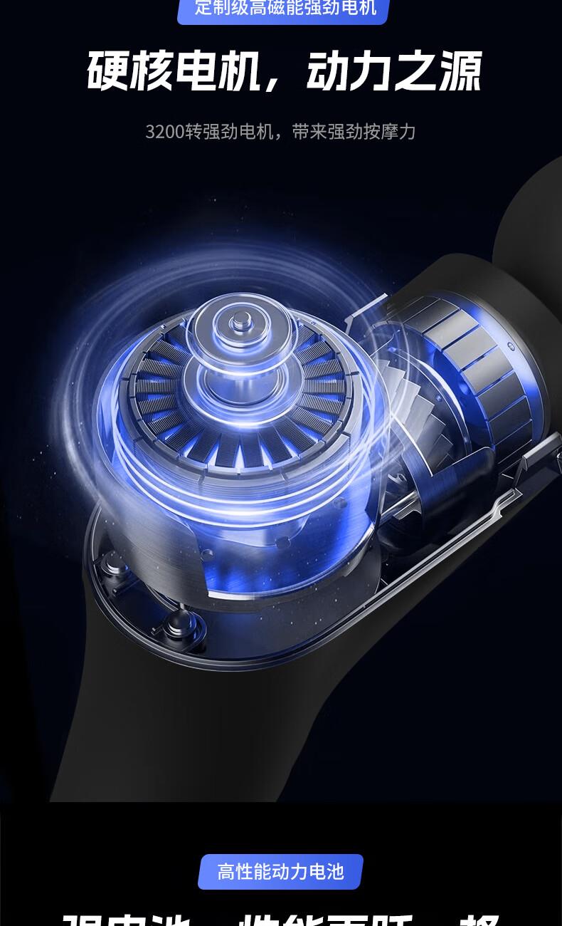 产品尺寸:12*12.4*3.6cm 产品克重:390g 输入电压:5V/2A 电压功率:20w 电机类型:有刷电机 机身材质:ABS 电池:1200mah 充电时间:2h 续航时间:2h 转速:3200转 按摩头:4个按摩头 档位:6档调节 包装:彩盒包装 颜色:黑色 1.耐摔防滑,降低噪音 2.高扭矩大功率无刷电机安全耐用 3.按摩头可以随意切换 4.小巧精致,便于携带