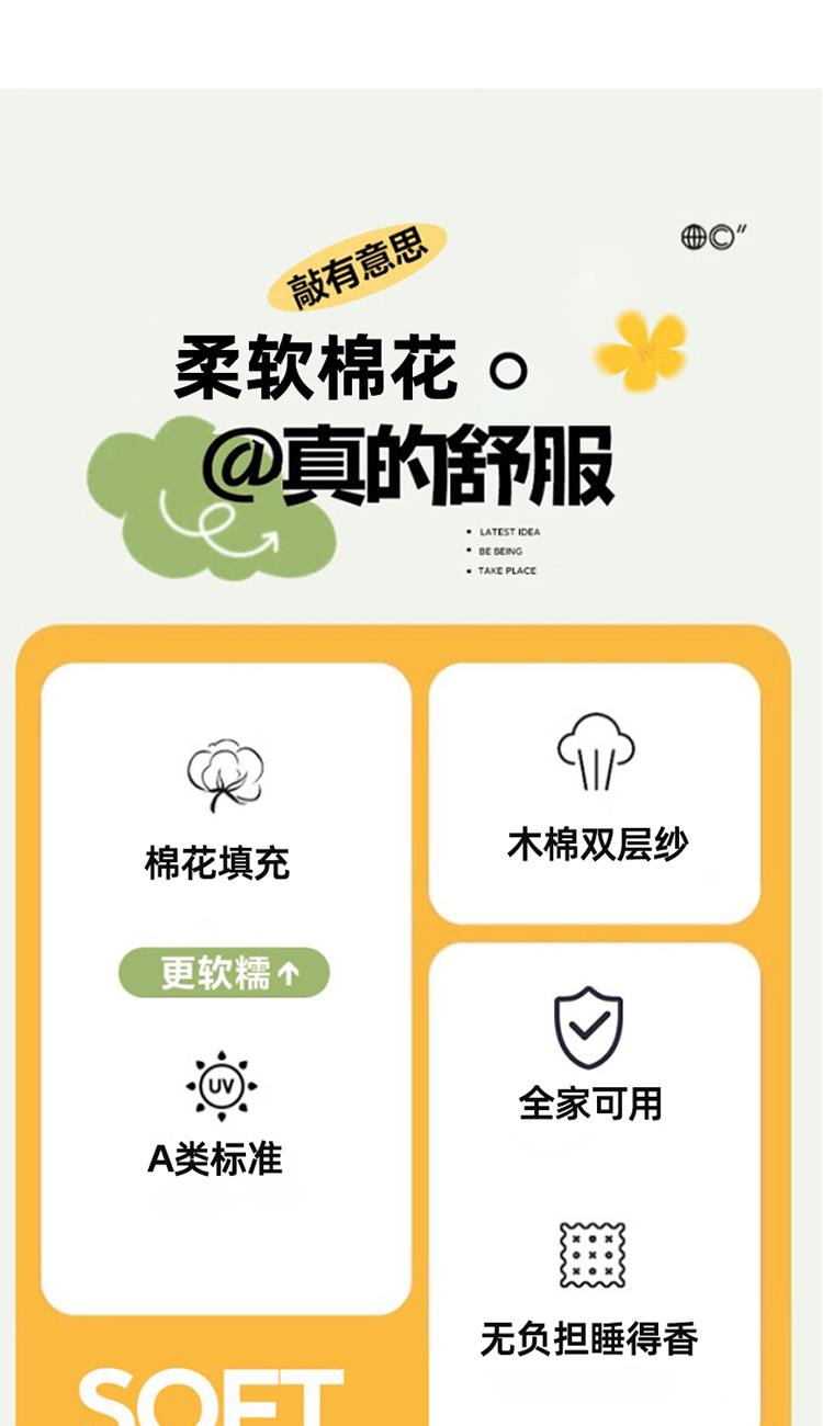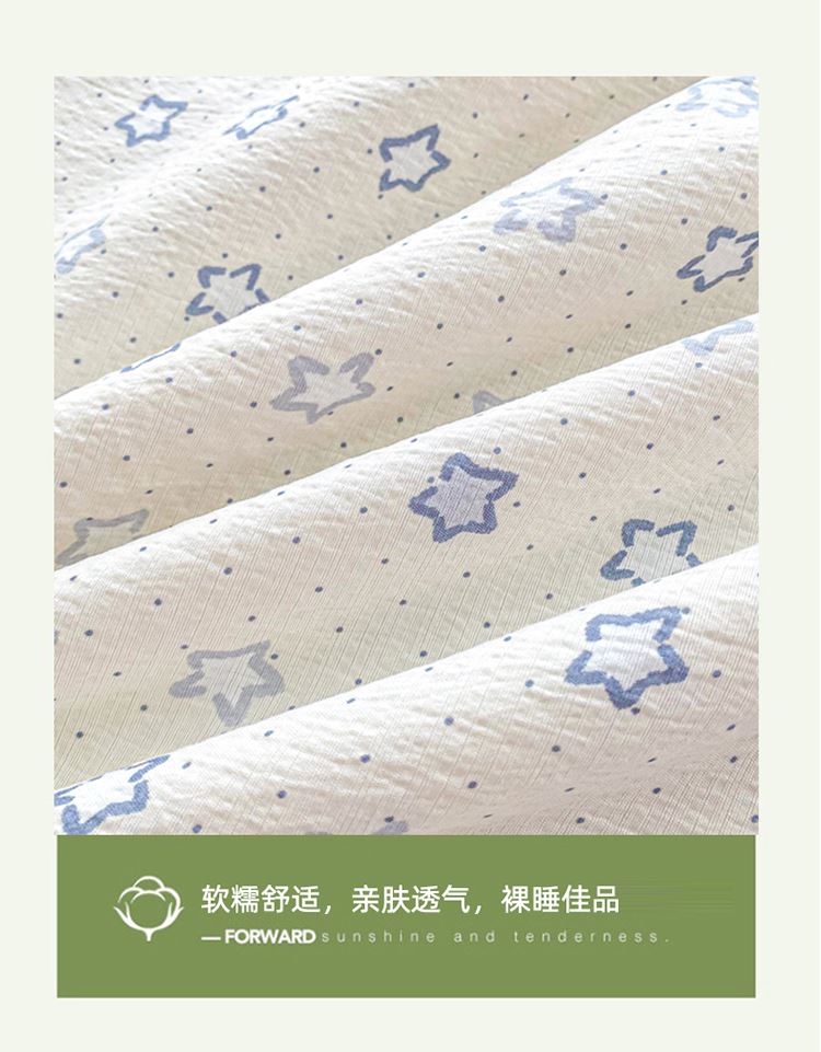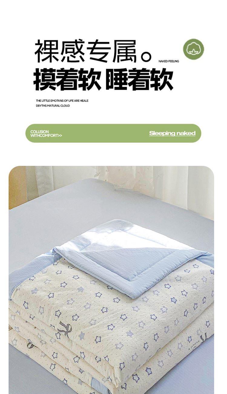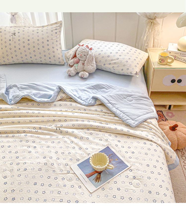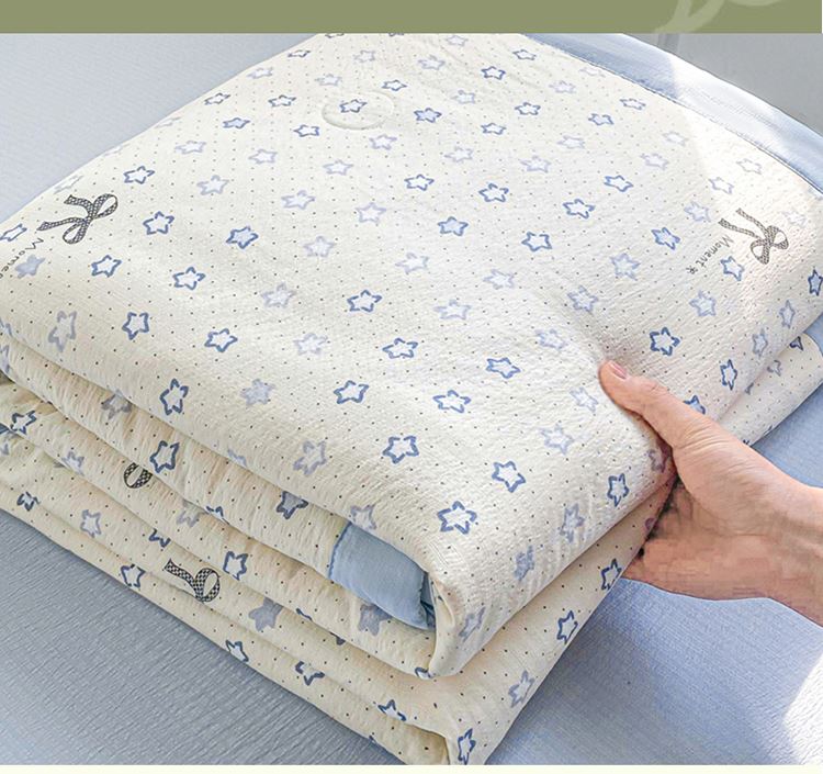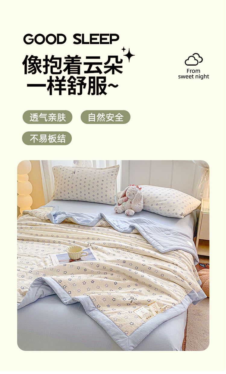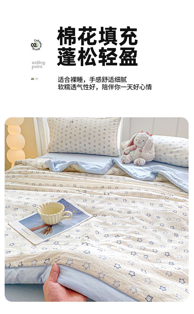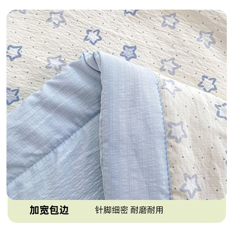 规格:150*200cm 面料:双层纱/聚酯纤维 填充:10%棉花+90%羽丝棉 花型:蓝点点、春日小猫、动感星星、繁花-蓝、花影、花之兔、苹果猫、小熊猫、星星小马、云感-蓝 ✅ 甄选双层纱面料,自带空气感蓬松肌理,摸起来软而不塌,像云朵裹身 ✅ 透气不闷汗,空调房不凉、常温不闷,敏感肌、裸睡党友好 ✅ 10% 棉花 + 90% 整张棉黄金填充,既有棉花的天然温润,又有整张棉的蓬松回弹 ✅ 加宽包边工艺,锁边更牢固,耐洗耐造