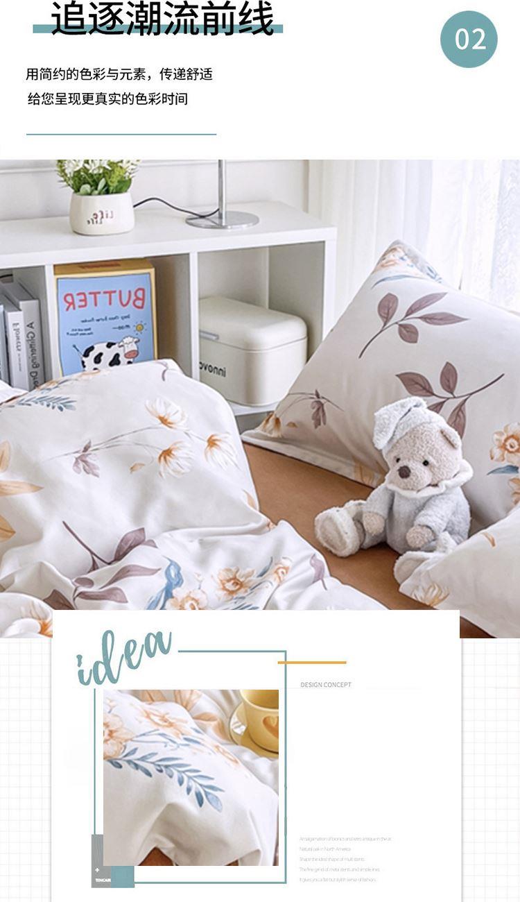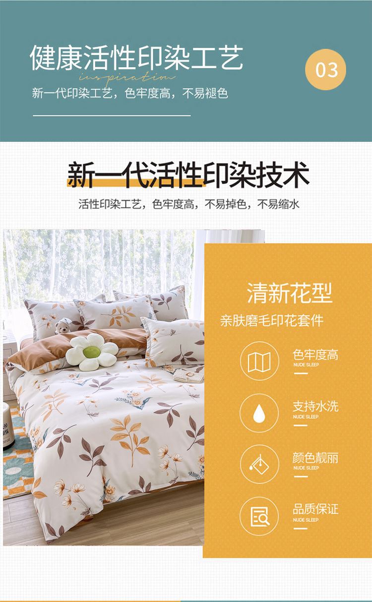被套:200*230cm 床单:230*235cm 枕套:48*74cm*2 面料:磨毛棉 执行标准:GB/T22796-2021 安全类别:GB18401-2010 B类 1.面料采用生态亲肤棉,新型环保浆料活性印染,不褪色,不缩水,其生态环保理念在很大程度上满足了消费者对床品舒适度的高要。 2.生态棉面料,手感柔软,舒适质感丰厚,而且有厚重感,容易打理。整体套件,色彩丰富自然,阵线细致密实,错落有序,更显档次。
