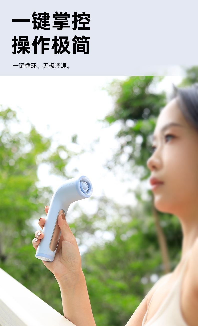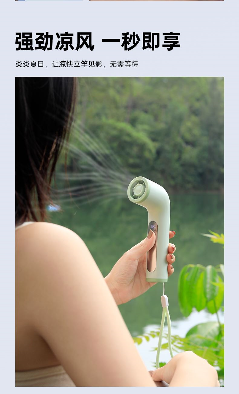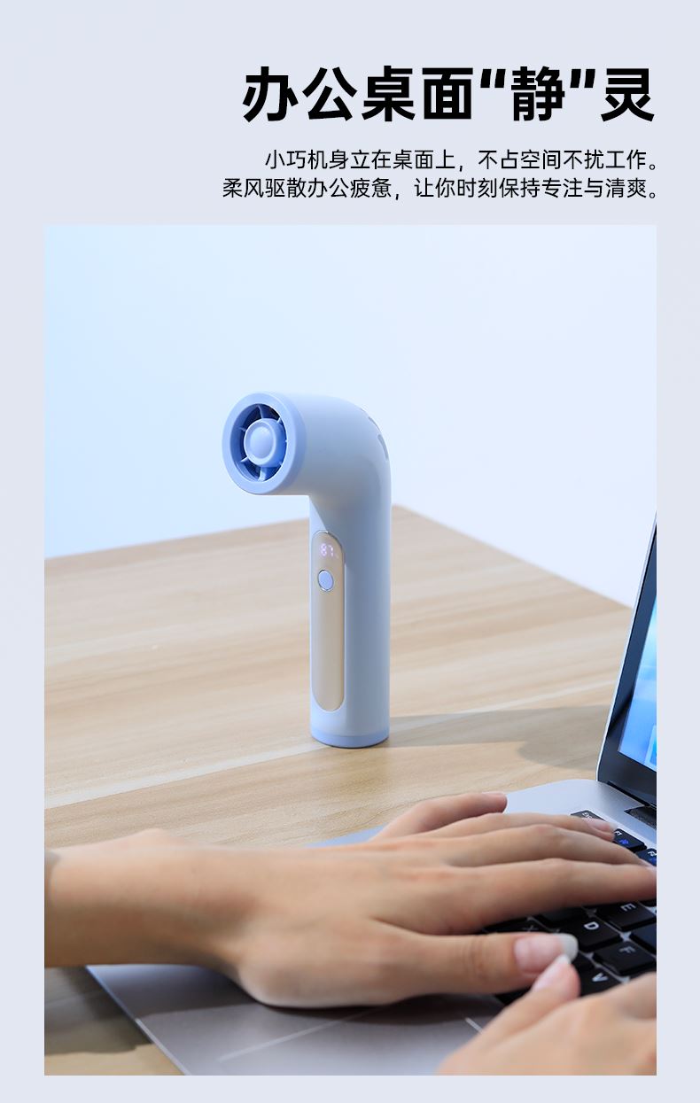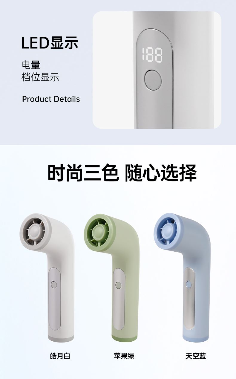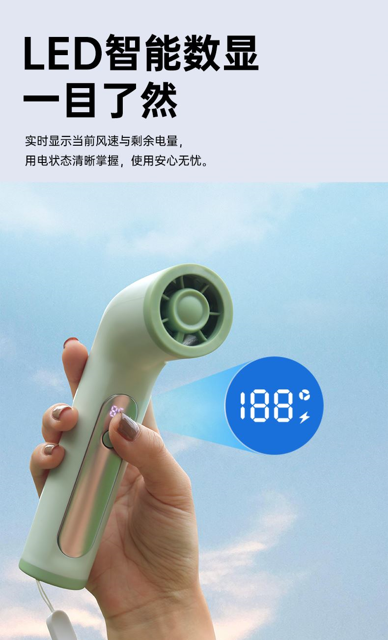 *17500RMP大风力,100档风力调节 *LED数显,配手绳,可立在桌面使用 *迷你小巧,出行方便携带