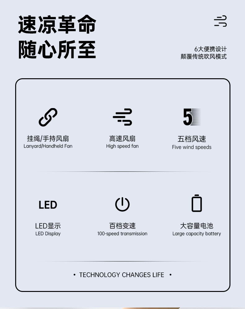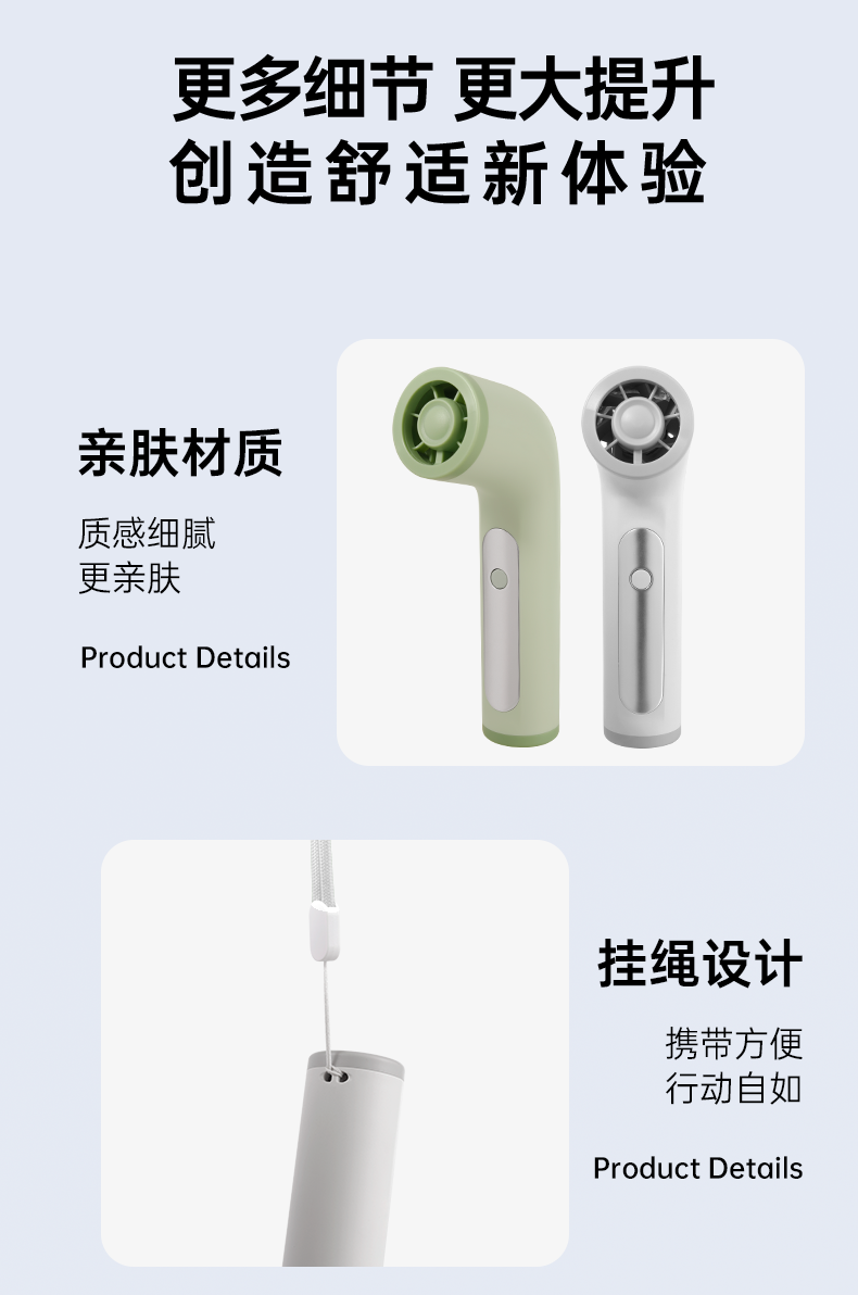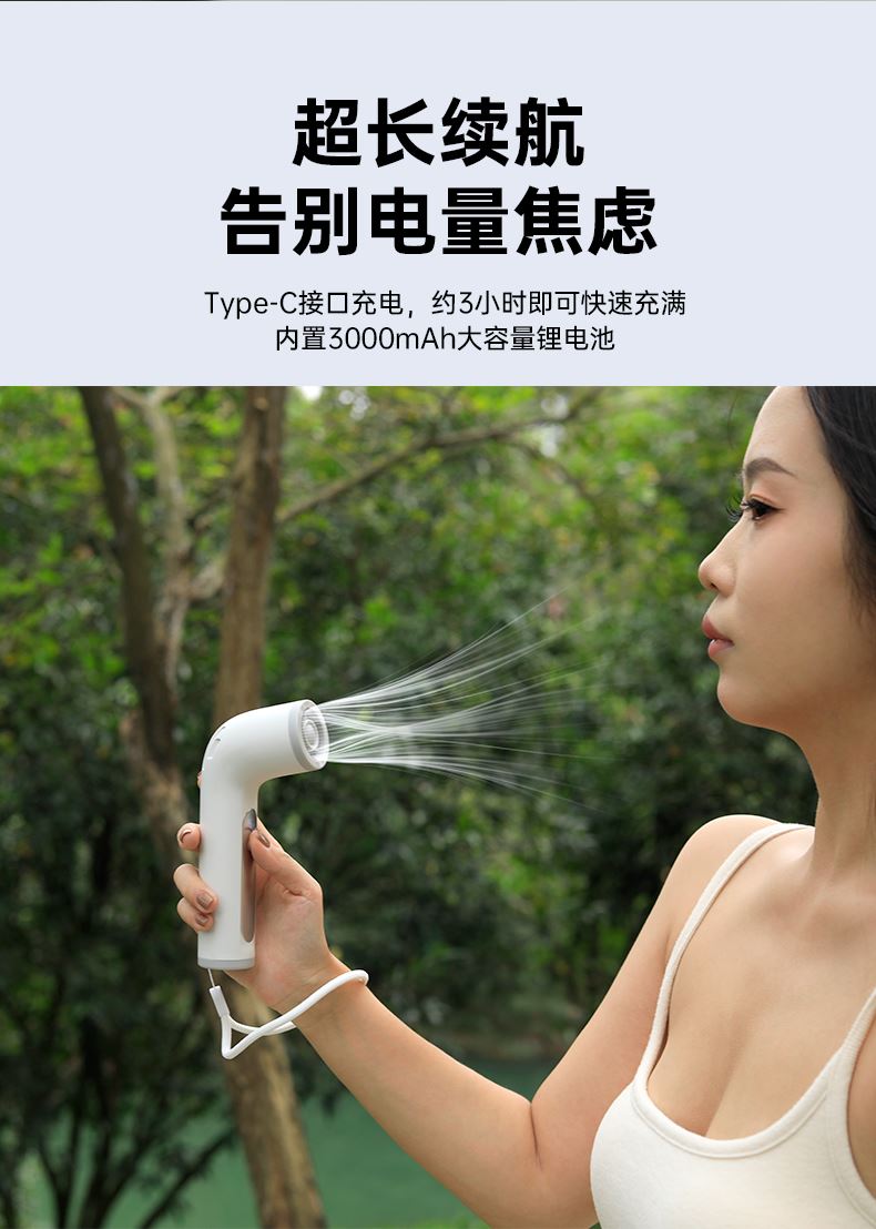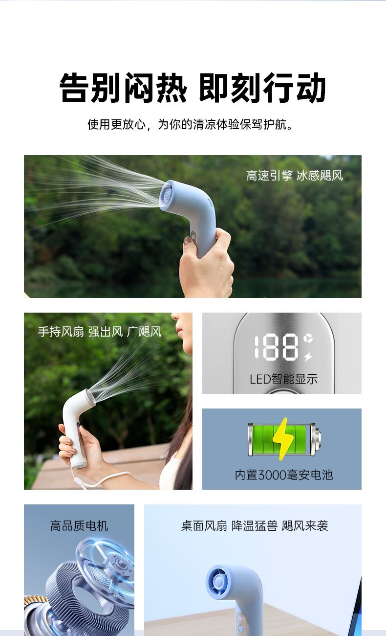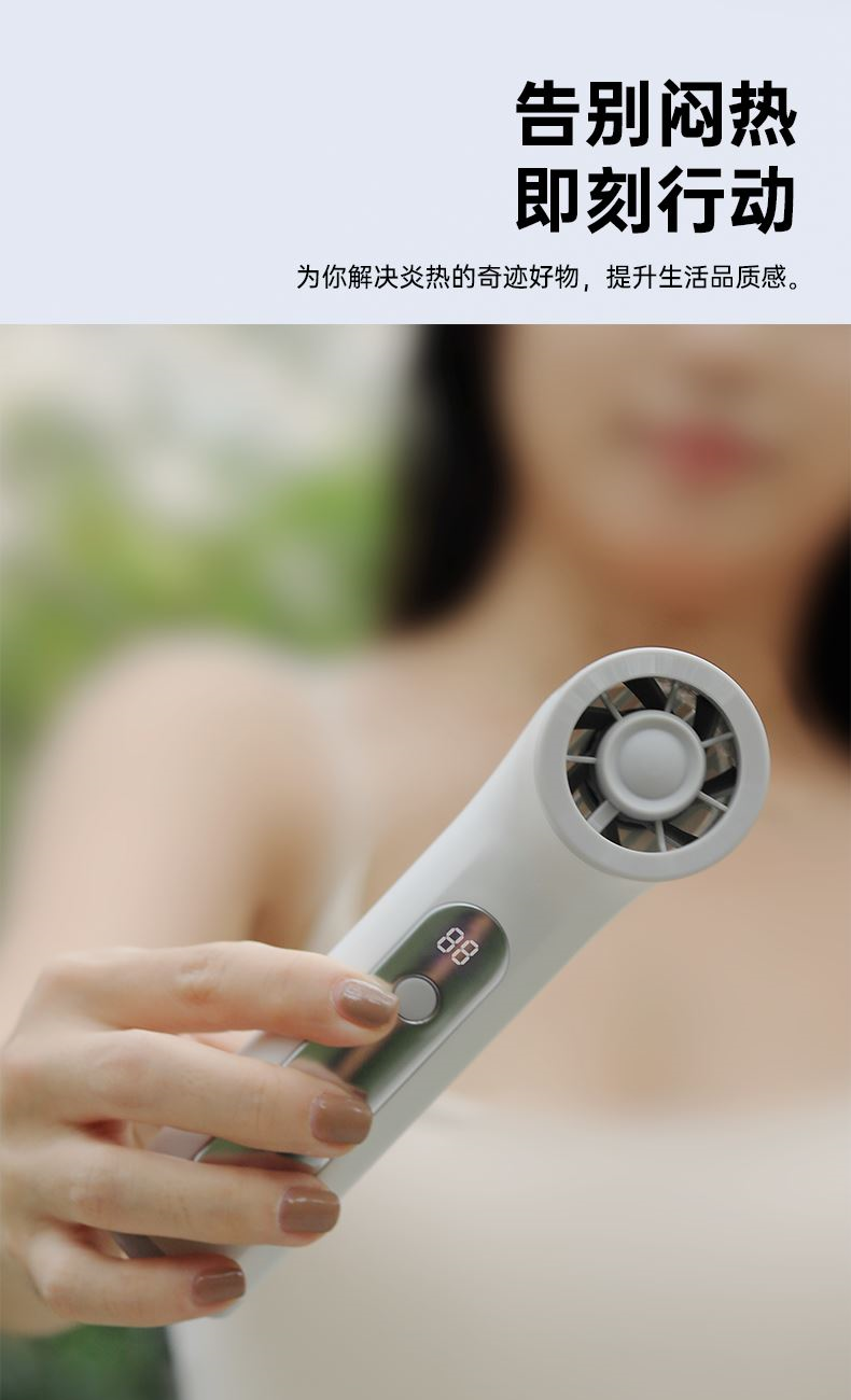 *17500RMP大风力,100档风力调节 *LED数显,配手绳,可立在桌面使用 *迷你小巧,出行方便携带