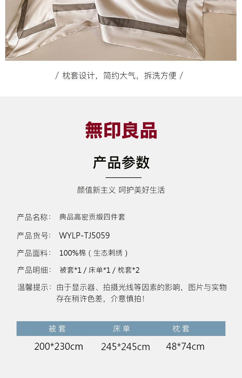 规 格:被套-200×230cm×1 床单-245×245cm×1 枕套-48×74cm×2 面 料:棉(生态刺绣) “無印良品”大染无印,优良品质的产品是年轻人喜欢的,“無印”设计, 优雅 , 质朴 , 自然 , 是無印良品的初心与追求。让体验更舒适。享受简约健康生活,走进無印,上善若水,大爱无疆,创新让生活更精彩。