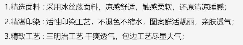 货 号 :HLX-XZ2512 面 料 :植物纤维+凉感纤维 规 格 :180*200cm 重 量 :净重约1900g 包装尺寸 :48*36*13.5cm 装 箱明细 :8套 /箱或50条/包 1.精选面料 : 采用冰丝藤面料,凉感舒适,触感柔软,还原清凉睡感; 2.精湛印染 : 活性印染工艺,不退色不缩水,图案鲜活靓丽,亲肤透气; 3.精致工艺 : 三明治工艺 干爽透气,包边工艺尽显大气;
