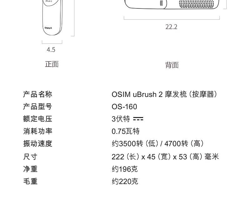 尺寸:22.2*5.3*4.5厘米 电压:3伏特 净重:约196克 内附 两节5号电池(可替换) 1、超舒缓的震动按摩 2、可变化的 2 个不同按摩强度 3、易携带的设计,小巧轻便 4、可清洗的齿梳(容易取出并清洗干净)