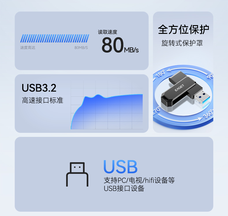 接口采用USB3.2, 高速接口协议传输文件高效稳定 Flash 芯片高速版 360°旋转保护安全堡垒 锖色电镀金属效果,坚固耐用 产品尺寸:63.8x15x9.35 mm 单品重量:22g