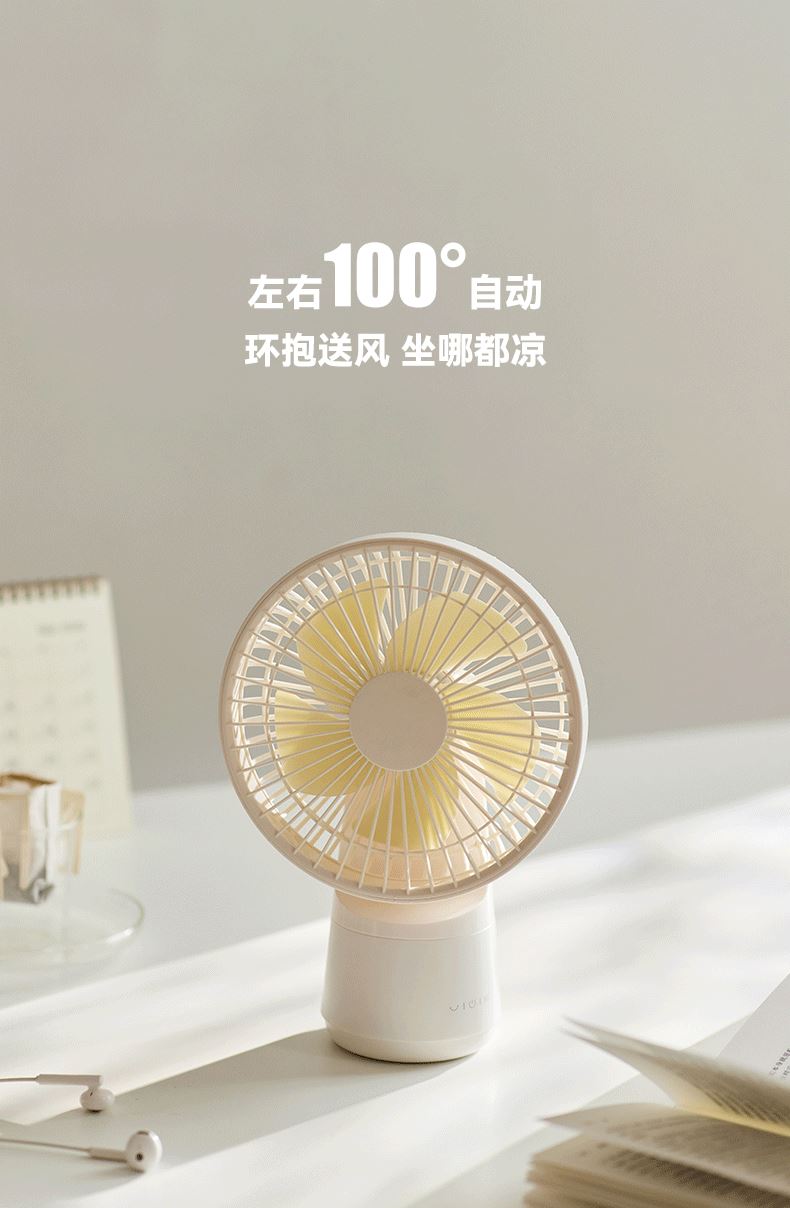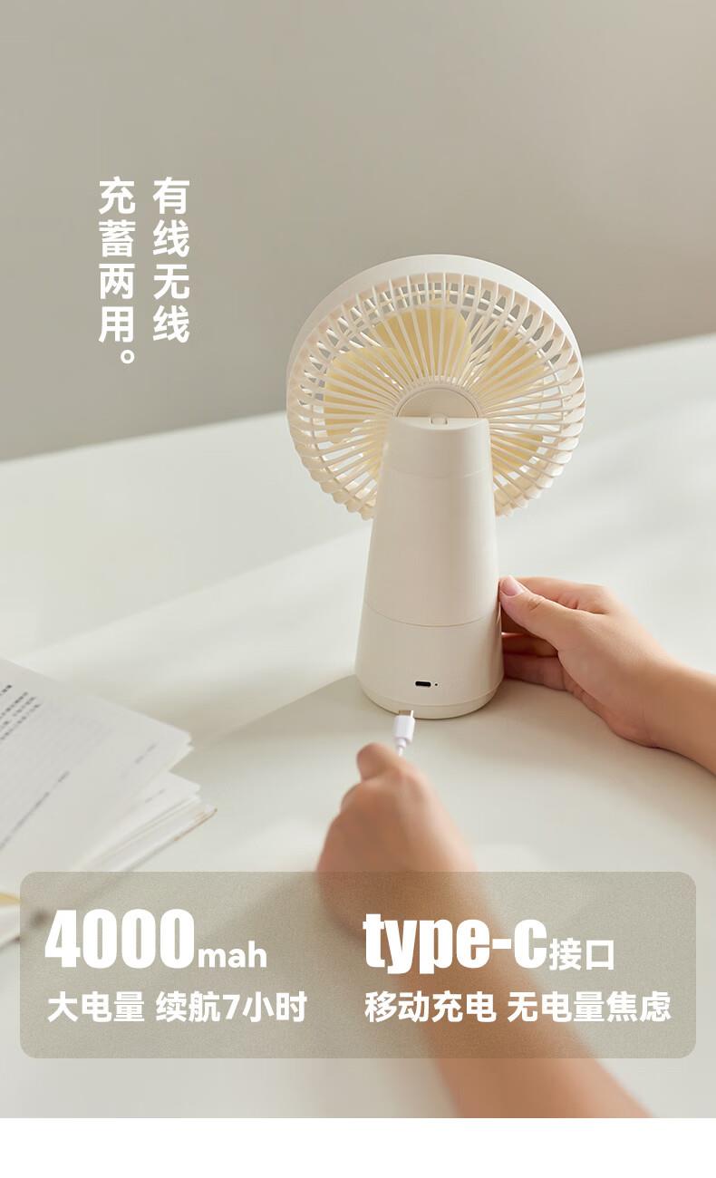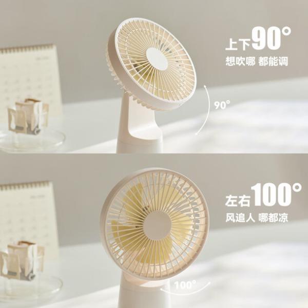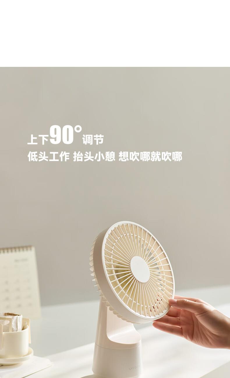 颜色:陶白色 电池容量:3000mAh 额定功率:5W 毛重:0.7kg 包装尺寸:275*190*110mm 条码:6977735714141 1. 立体大广角出风,上下90°,左右100° 2. 3档风速快速消暑,风感细腻 3. 3000mAh大容量,充插两用 4. 轻音低噪轻风,直流电机