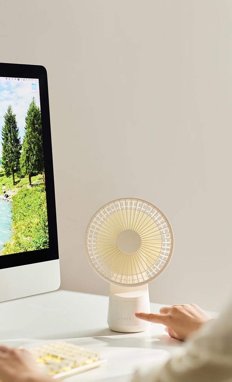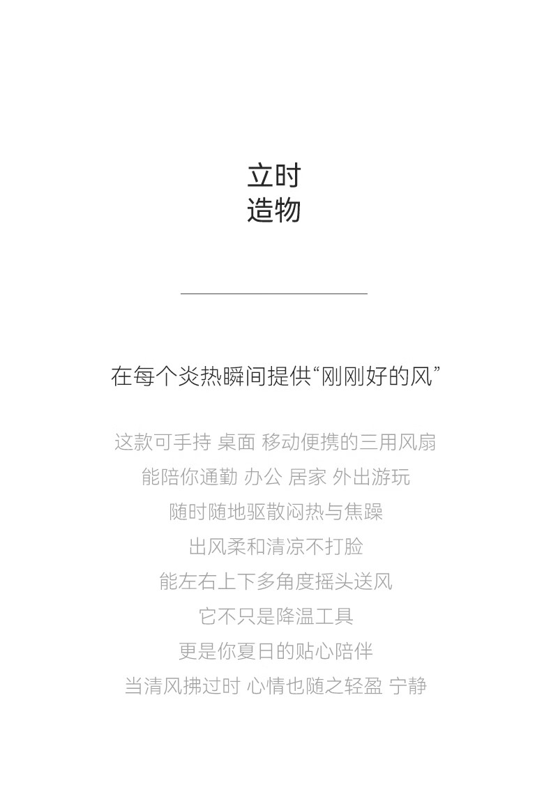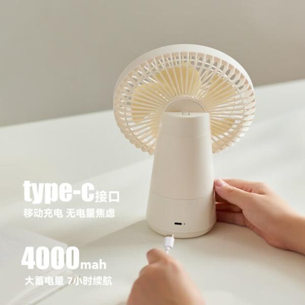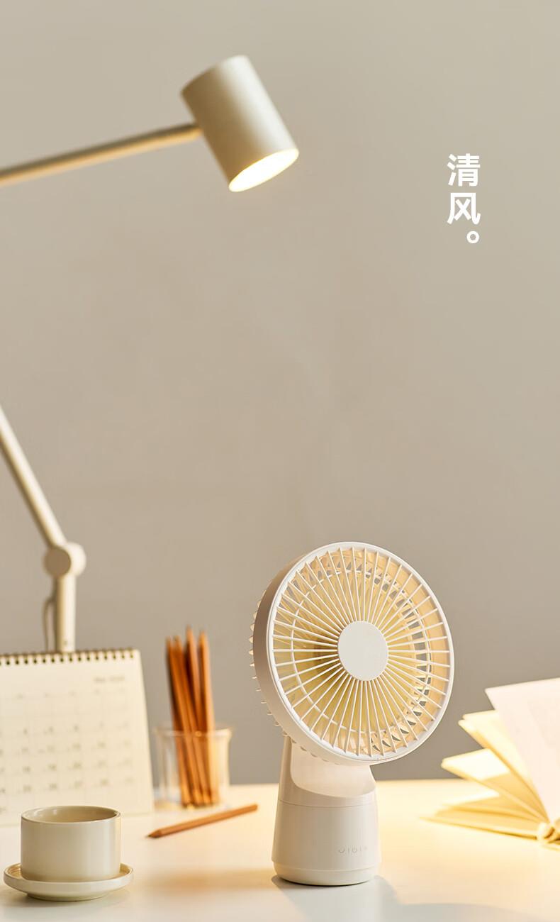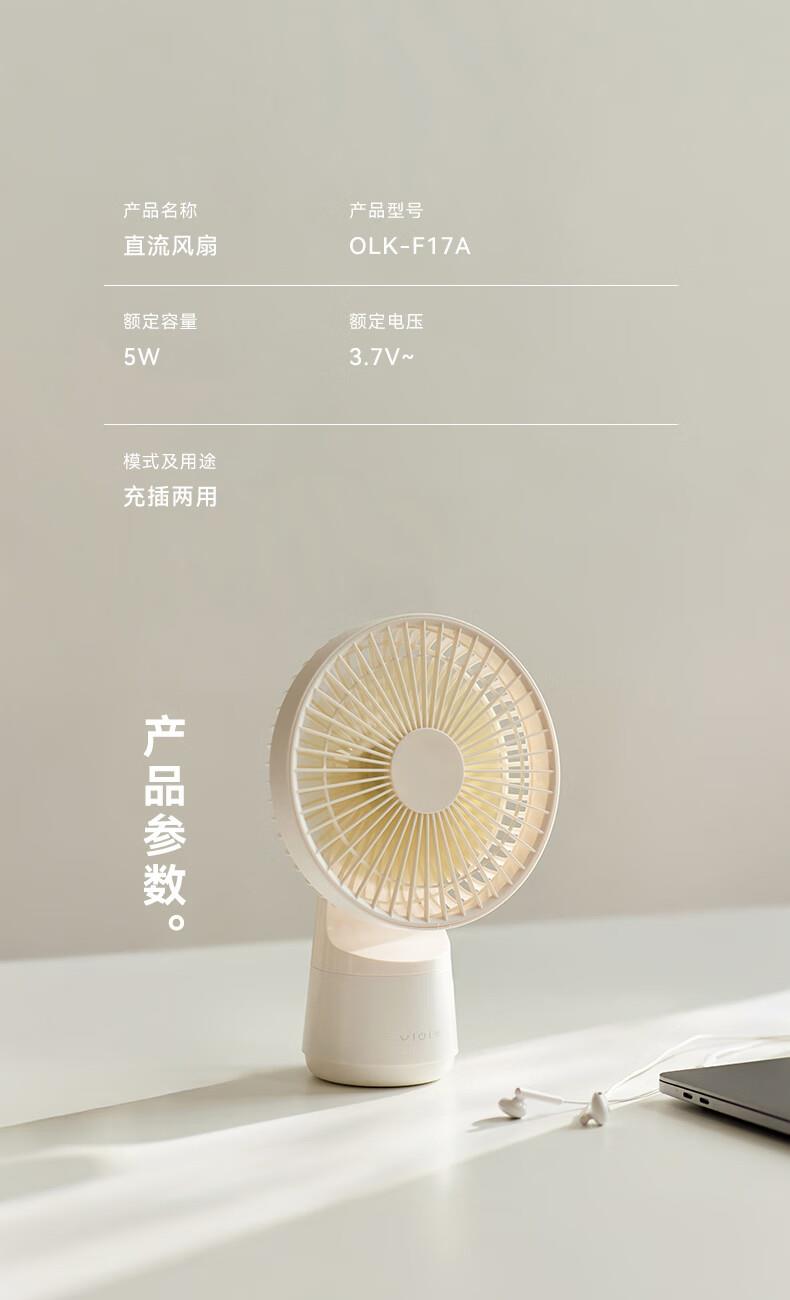 颜色:陶白色 电池容量:3000mAh 额定功率:5W 毛重:0.7kg 包装尺寸:275*190*110mm 条码:6977735714141 1. 立体大广角出风,上下90°,左右100° 2. 3档风速快速消暑,风感细腻 3. 3000mAh大容量,充插两用 4. 轻音低噪轻风,直流电机