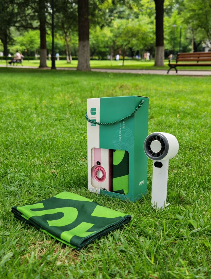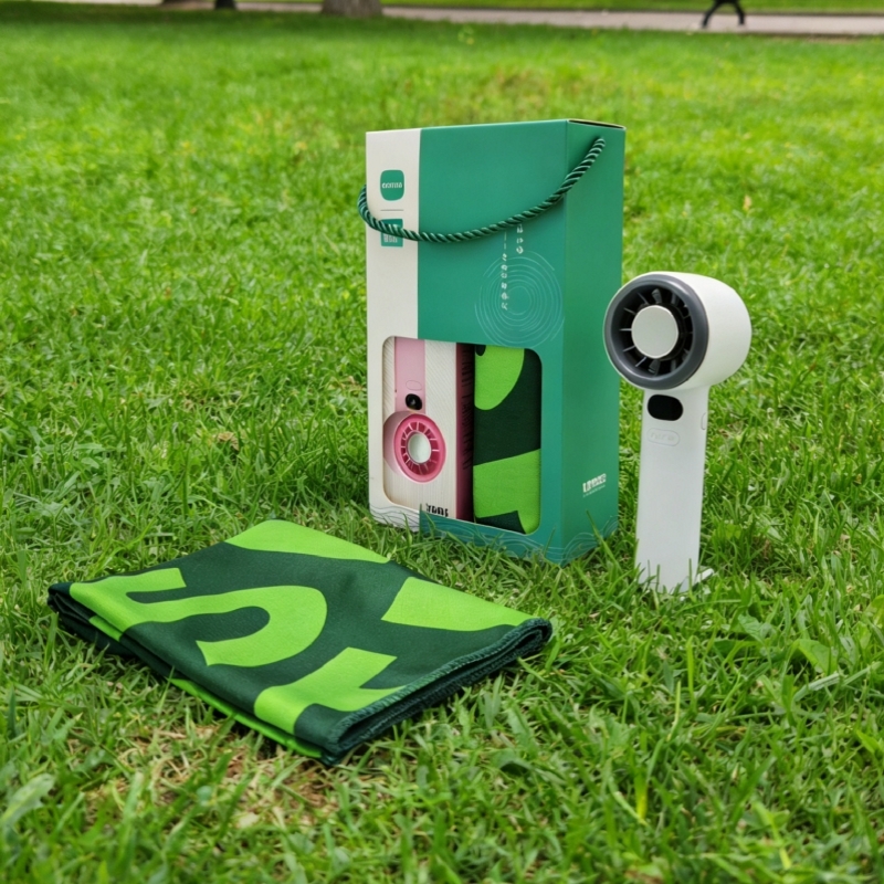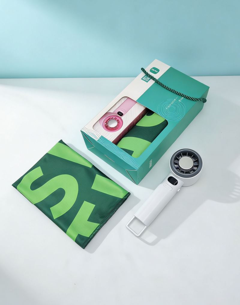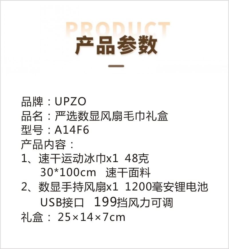型号:A14F6 产品内容: 1、速干运动冰巾*1 48克 规格:30*100CM 材质:速干面料 2、数显手持风扇*1 1200毫安锂电池 USB接口 (续航时间120分钟左右 199挡风力可调) 礼盒规格:25*14*7CM 数显风扇 1200毫安 199档可调 长续航 靓丽外观 七彩运动冰巾精选冷感面料结合数码印花工艺