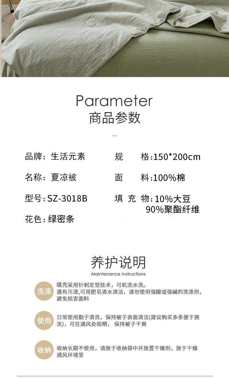 花色:绿密条 规格:150*200cm 面料:全棉 填充物:10%大豆 90%聚酯纤维 单套重量:KG(含包装) 包装方式:无纺布袋 包装尺寸:480*360*120mm 1、全棉活性印花面料,绿色环保,色泽自然靓丽,久用不掉色,细腻柔润舒适,亲肤性好,吸湿透气,让您享受一种清馨自然的舒适睡眠。 2、历经多道印染工艺,经精梳后纺织而成,贴身舒适,柔软亲肤质感。