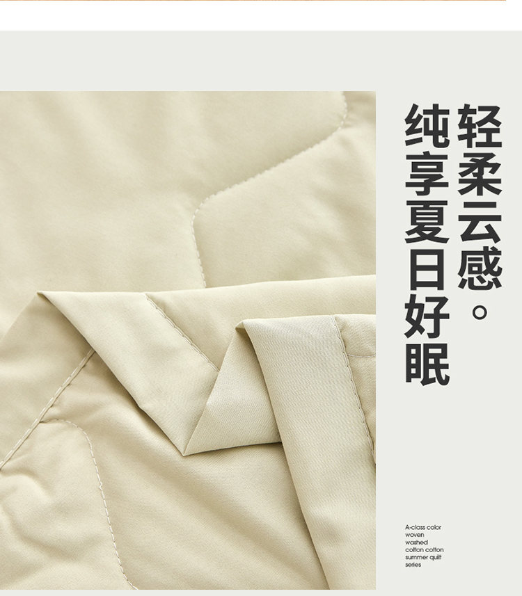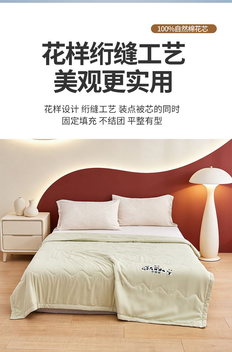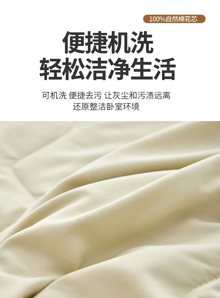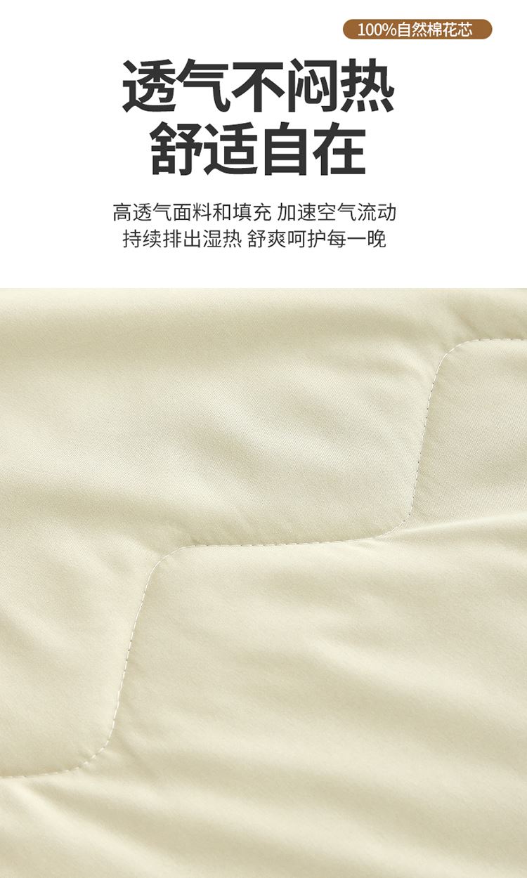 规格:150*200cm 面料:原棉(聚酯纤维) 填充:羽丝棉 重量:800g 执行标准:GB/T22796-2021 安全类别:GB18401-2010 B类 1.高支密原棉面料,源于自然的绵软触感 质感丰盈软糯与肌肤零距离接触,弹性更优良。新颖的纤陌结构,使得水汽自由流通,吸湿性,使得条被子舒适健康,给您一个精致睡眠。