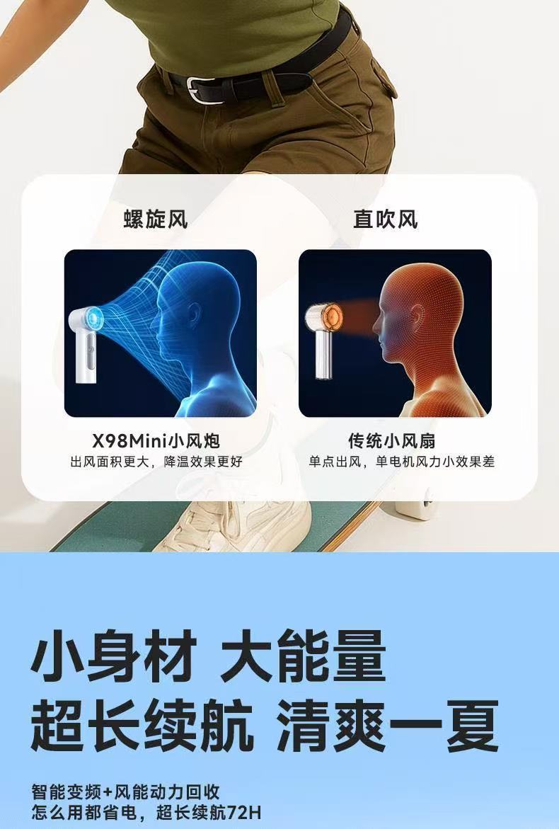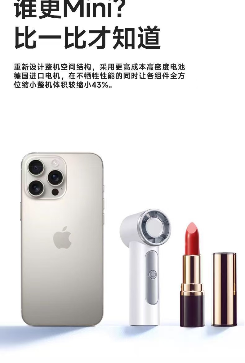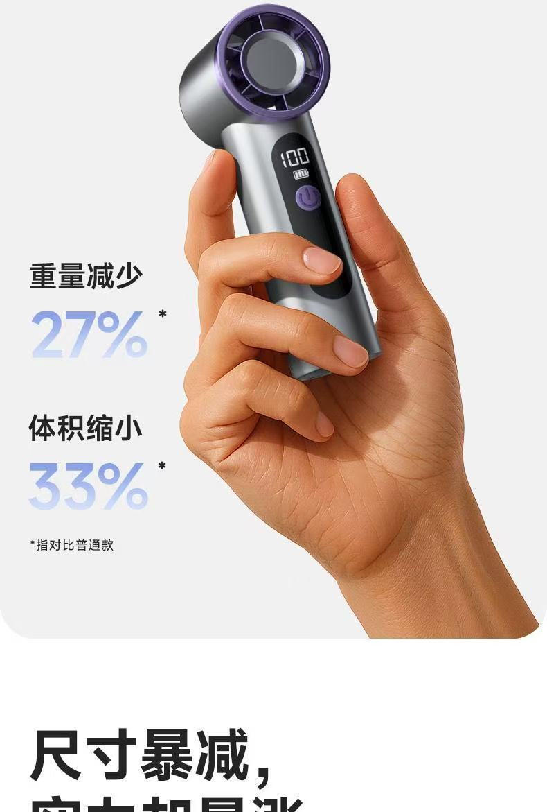 MINI高速手持小风扇X98 颜色:米色 绿色 紫色 灰色 整箱数量:100PCS 外箱:50*24*25.5CM 单个重量:114.5g 彩盒尺寸:50*50*115mm 整箱重量:15kg 尺寸:185*91*30mm 材质:ABS材质 容量:1200mAh 包装:彩盒包装 【推荐理由】: 迷你精致小巧,方便携带高速风扇 5档数显可调节高速风扇 桌面/手持/户外多种使用方法 1200毫安大容量电池待机更长