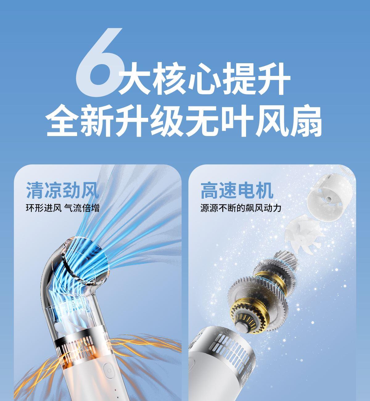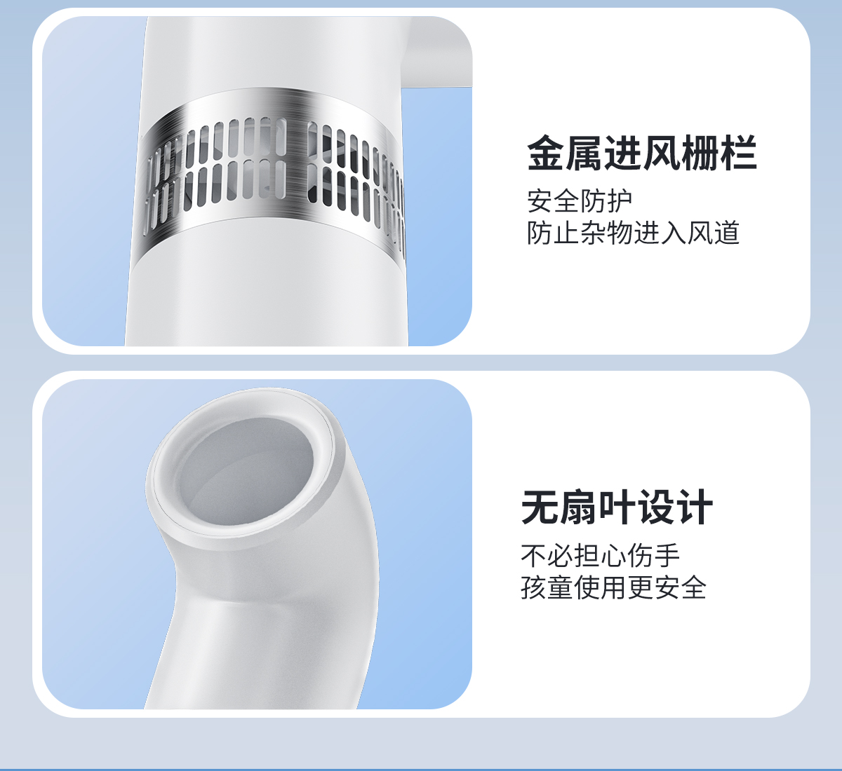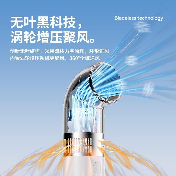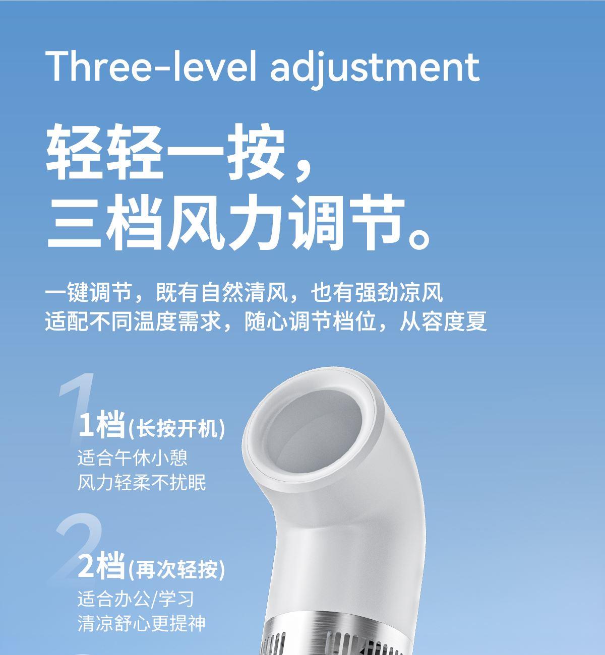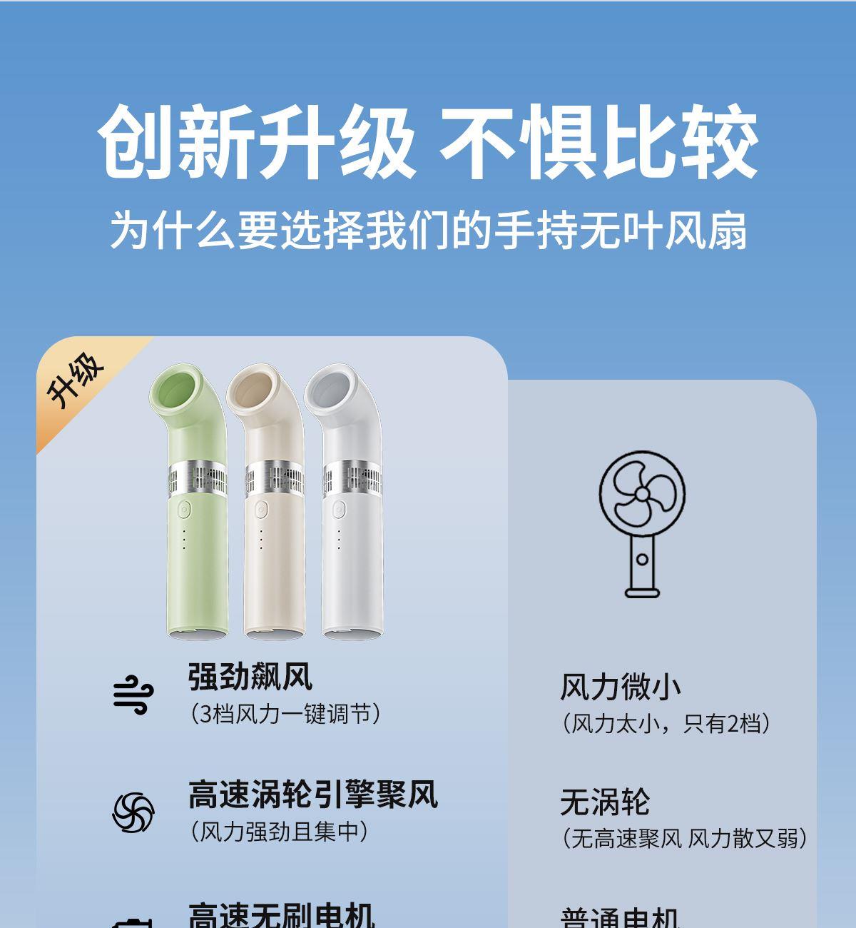 *18000RMP大风力,3档风力调节 *可立在桌面使用,无叶弯道凉风 *迷你小巧,出行方便携带