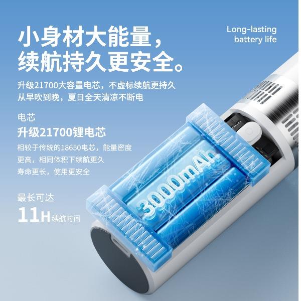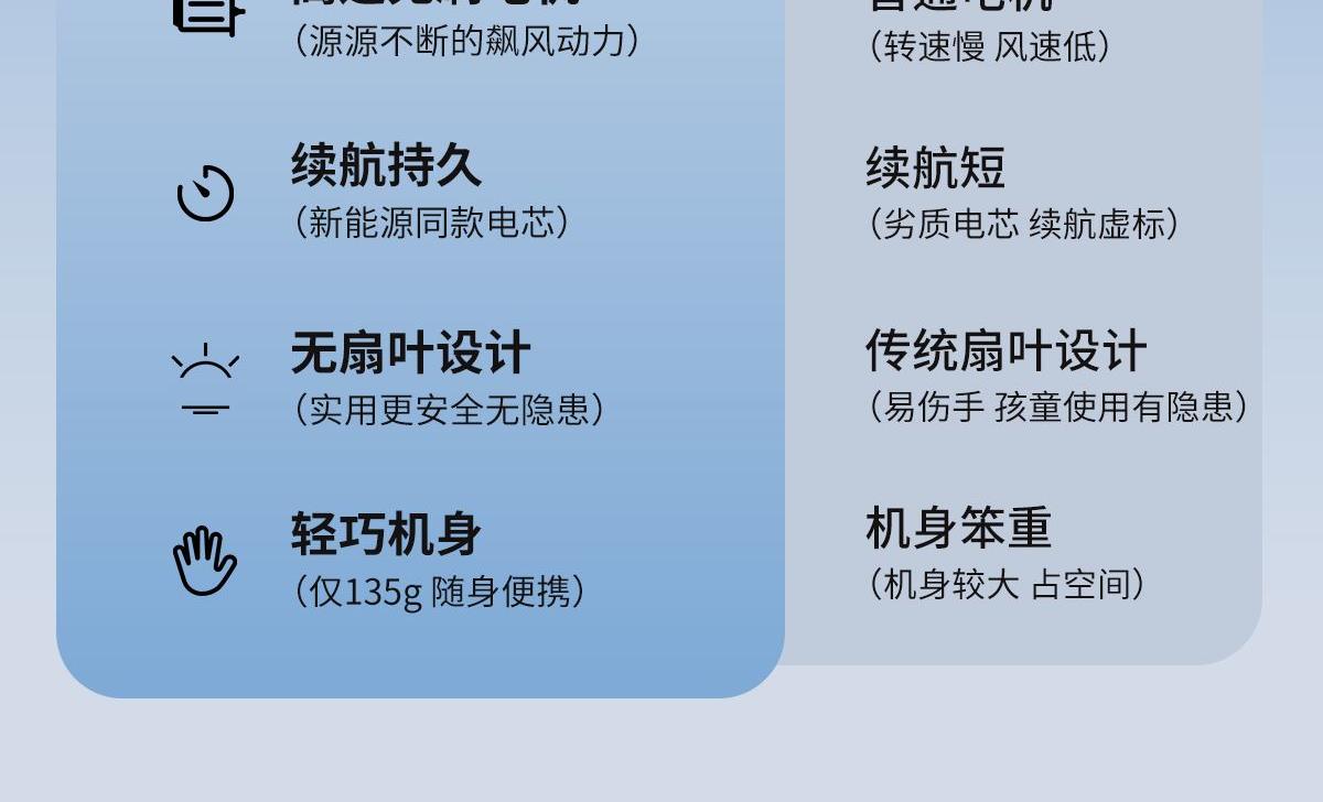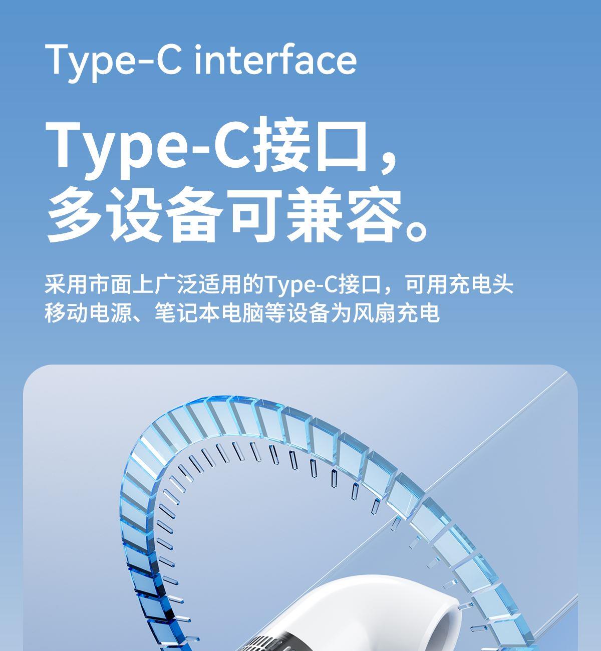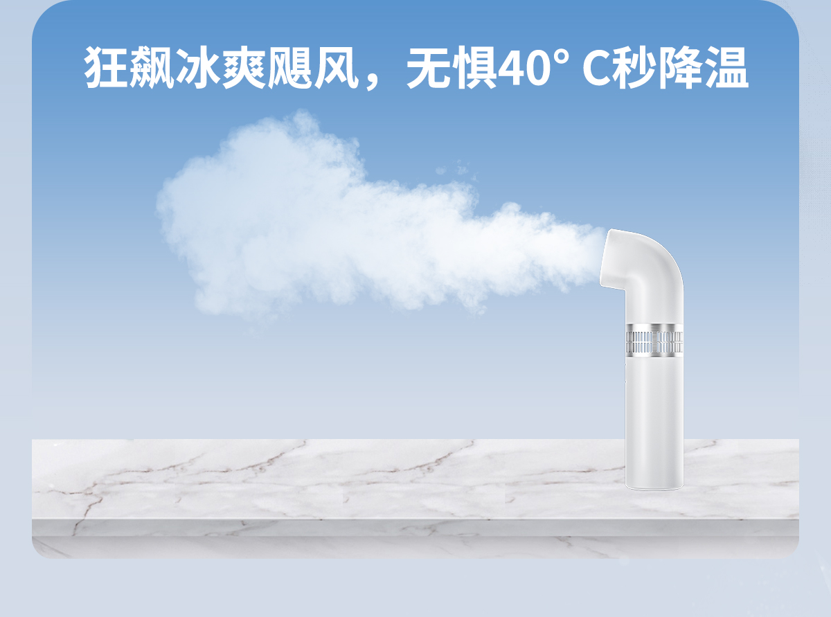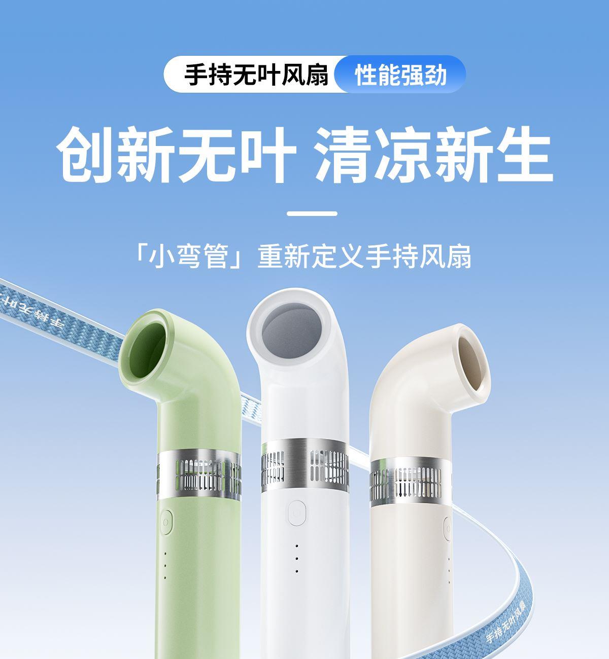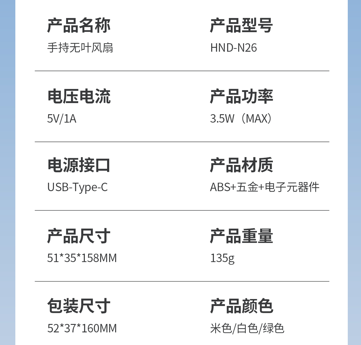 *18000RMP大风力,3档风力调节 *可立在桌面使用,无叶弯道凉风 *迷你小巧,出行方便携带