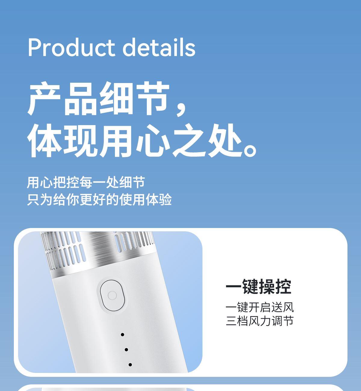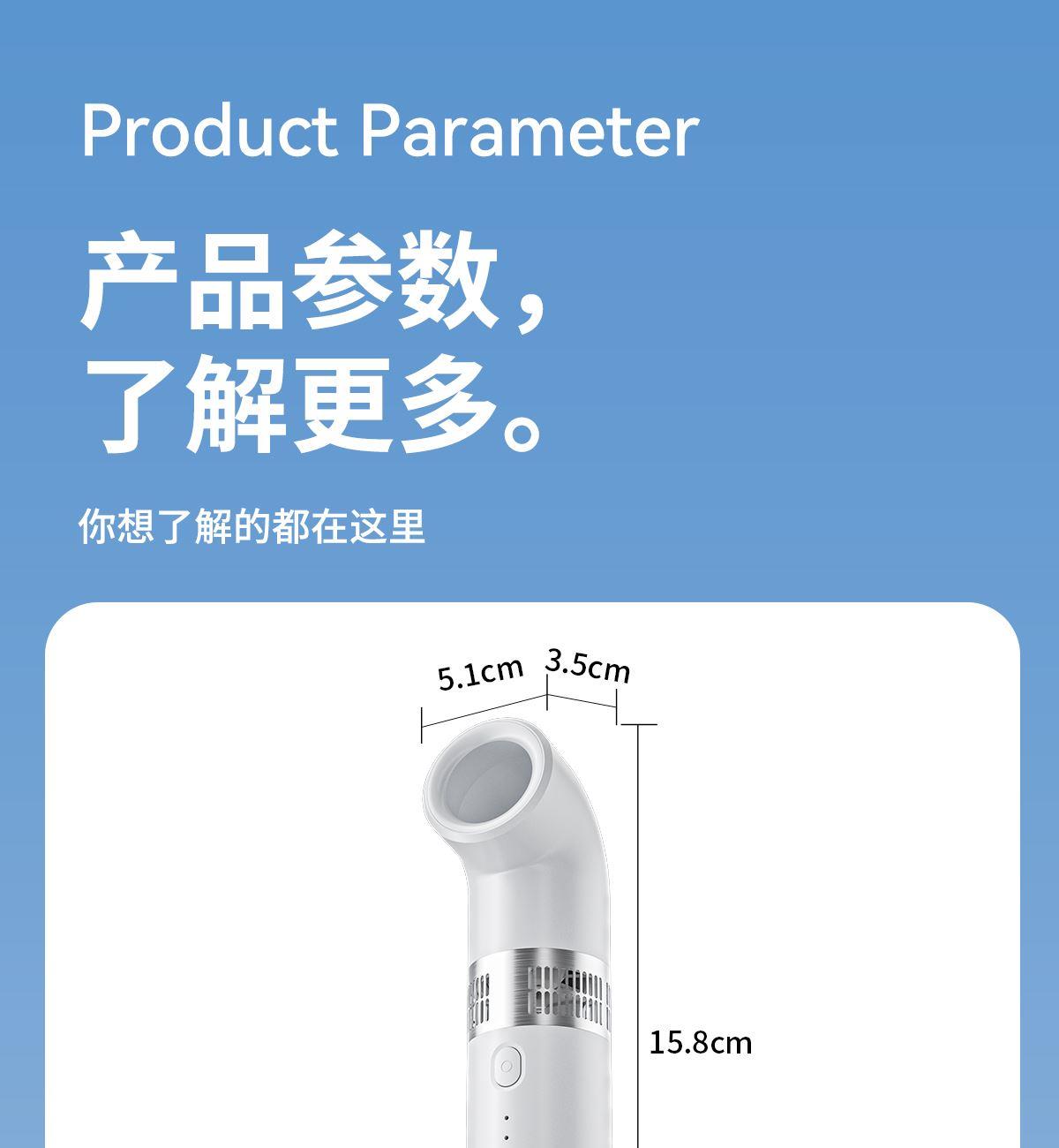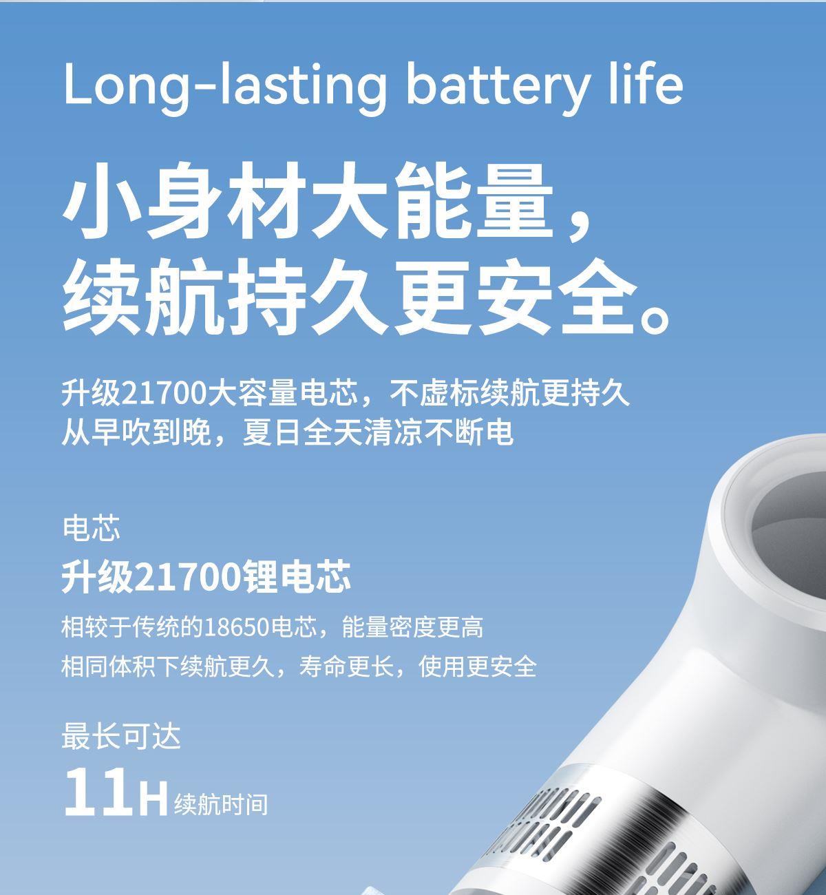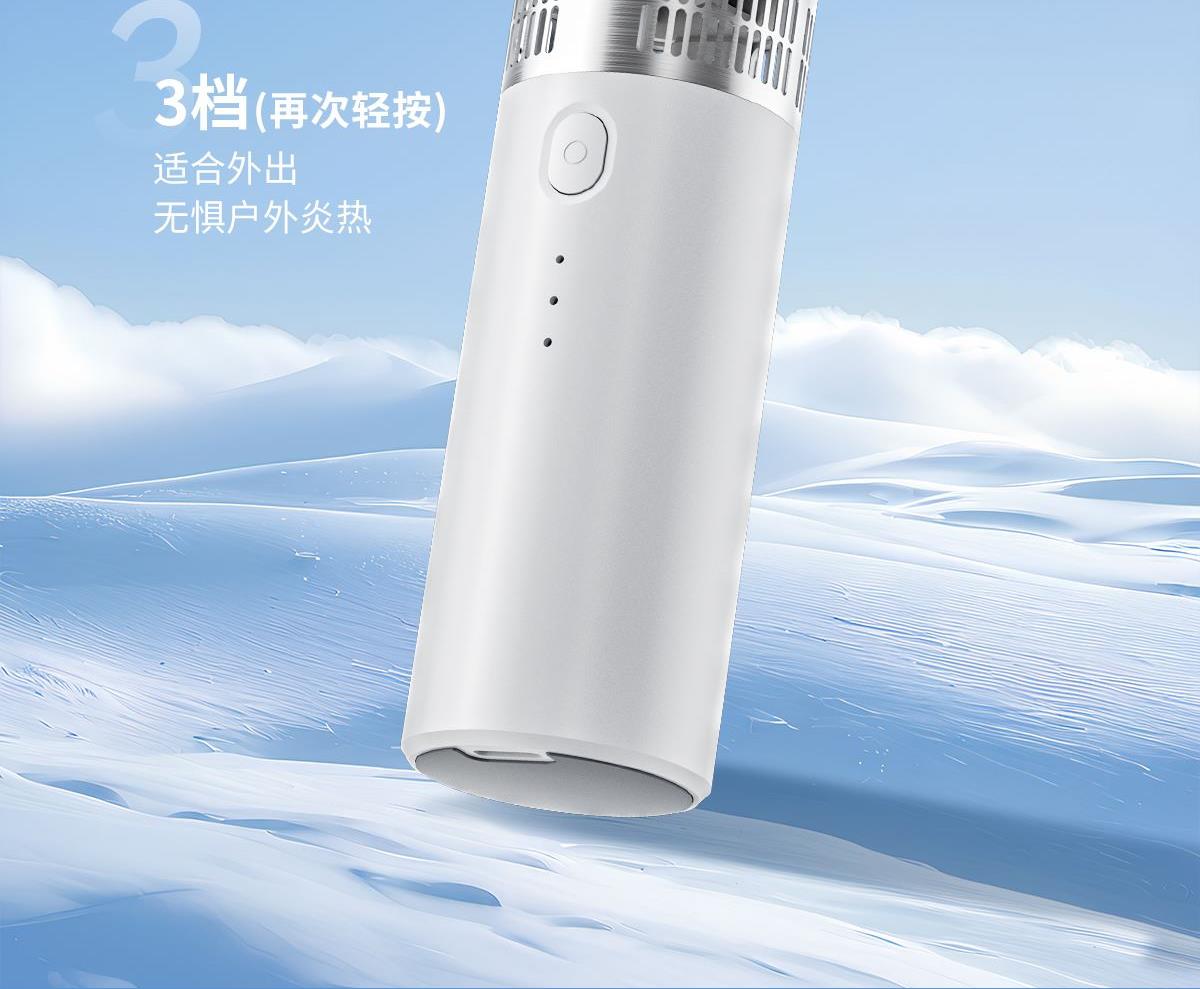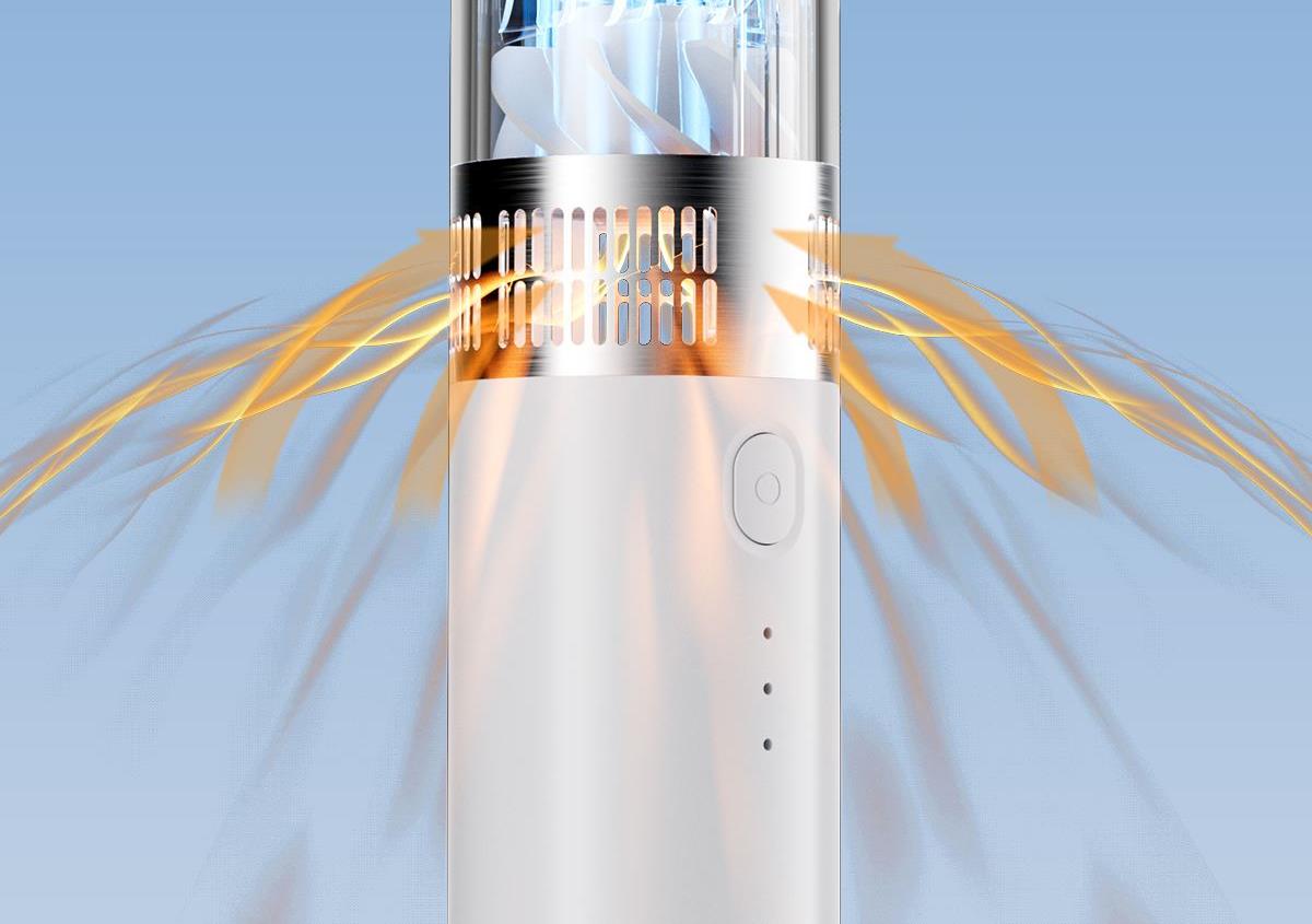 *18000RMP大风力,3档风力调节 *可立在桌面使用,无叶弯道凉风 *迷你小巧,出行方便携带