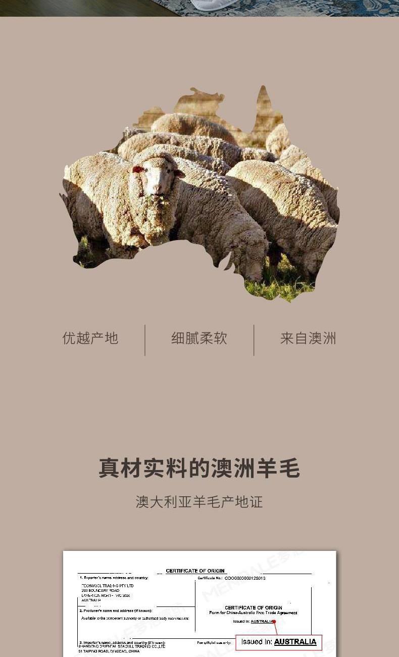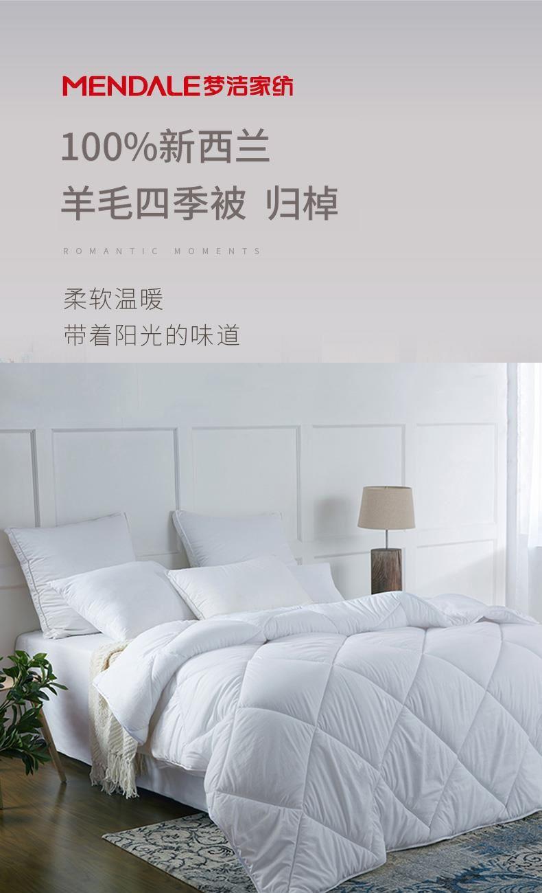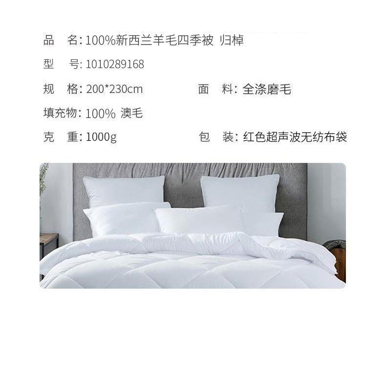 面 料:聚酯纤维 尺 寸:200×230cm 填充物 :羊毛 填充克重:1000g 填充:羊毛本身具有良好的吸、放湿性。澳洲进口羊毛,保暖性更佳,且无异味。 面料:手感细腻,亲肤柔软,舒适贴合; 工艺:细致包边,固定被芯。