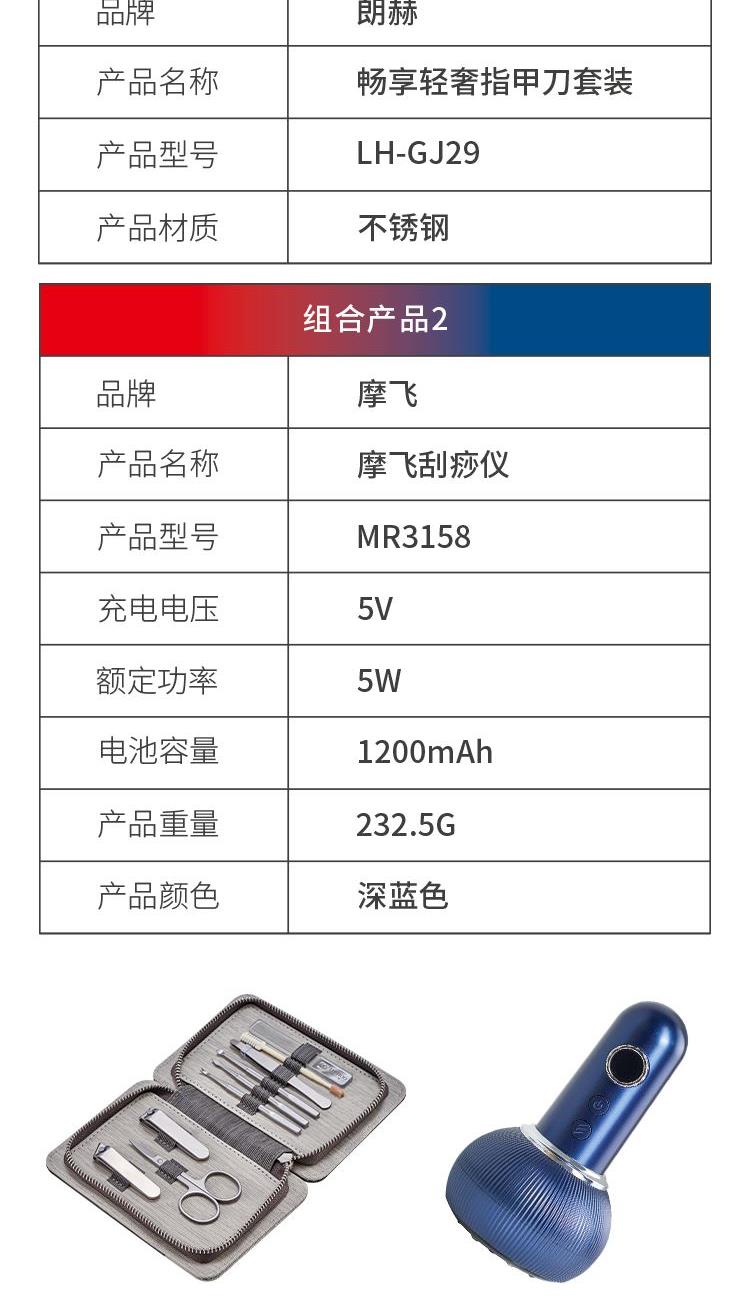 产品配置: 畅享轻奢指甲刀套装LH-GJ29*1套 摩飞刮痧仪MR3158*1套