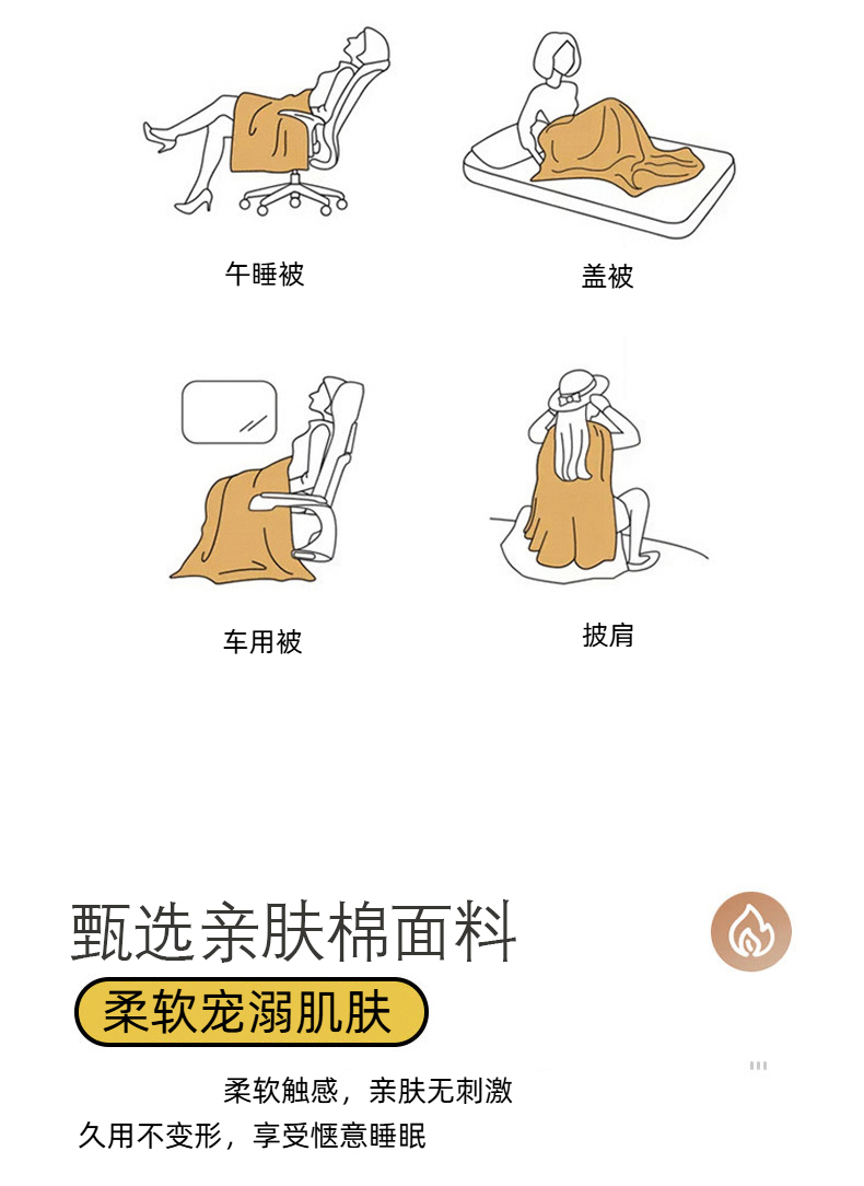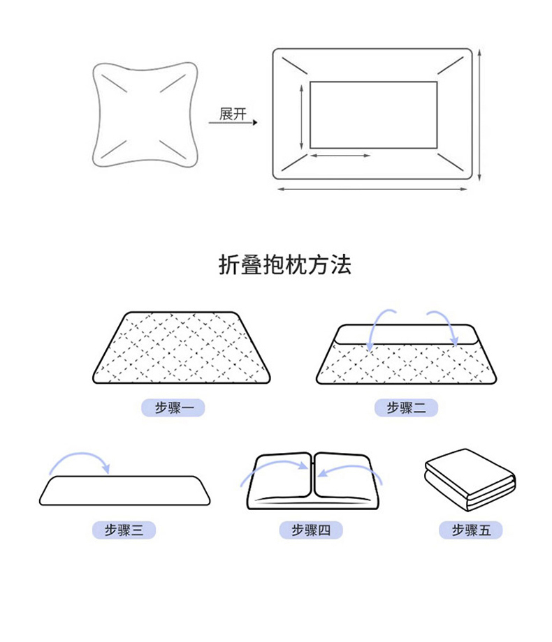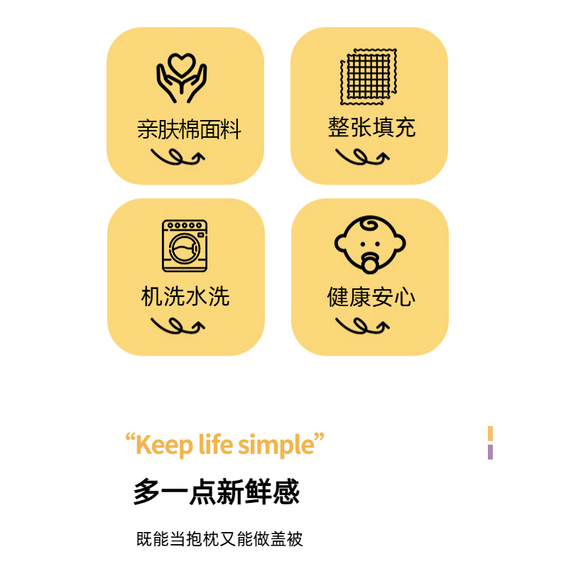 规格:40*40cm±5cm 展开:100*150cm±5cm 面料:亲肤棉 执行标准:GB/T22796-2021 安全类别:GB18401-2010 B类 1.采用亲肤棉面料,颜色鲜艳、丰富、美观大方,手感光滑流畅,洗涤后不收缩。 2.填充环保羽丝纤维,轻薄透气,简约而不简单,适合贴身覆盖, 3.抱枕被方便收纳,折叠后可作为家居抱枕