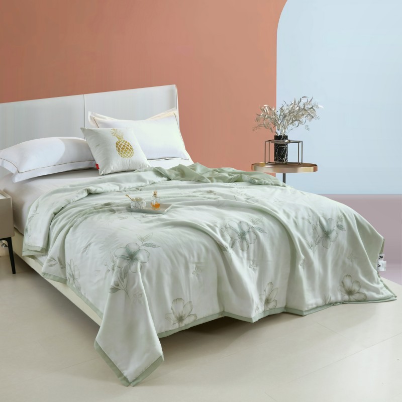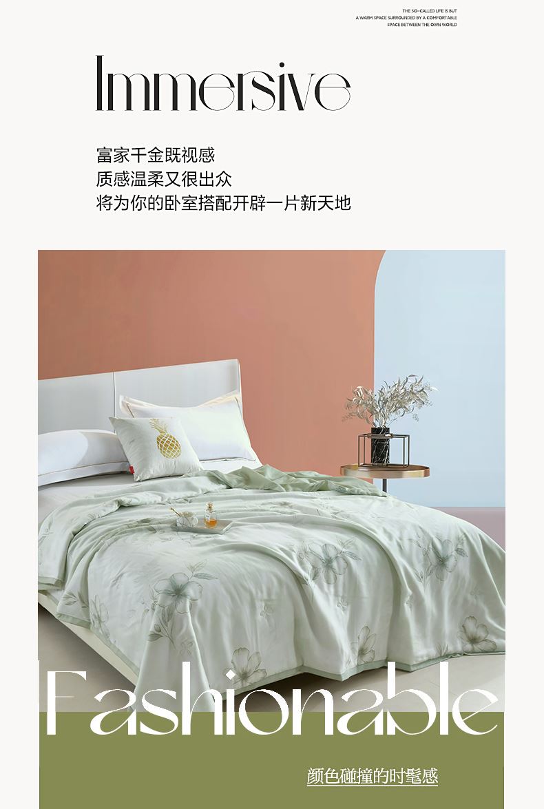 规格:200*230cm 面料:莱赛尔(植物纤维) 填充:羽丝棉 重量:1700g 执行标准:GB/T22796-2021 安全类别:GB18401-2010 B类 1.以再生纤维素纤维为原料,经过精梳工艺处理,面料手感柔软如贴身内衣,睡感舒适,透气。凉而不冰,触感舒适不粘身,有着棉的柔软与丝的冰滑,灵感加持,吸湿透气不闷热。 2.面料缩水率低,色牢度高,经洗耐用。