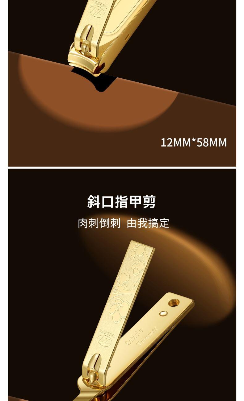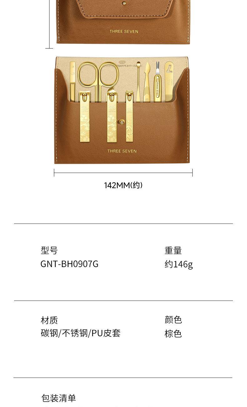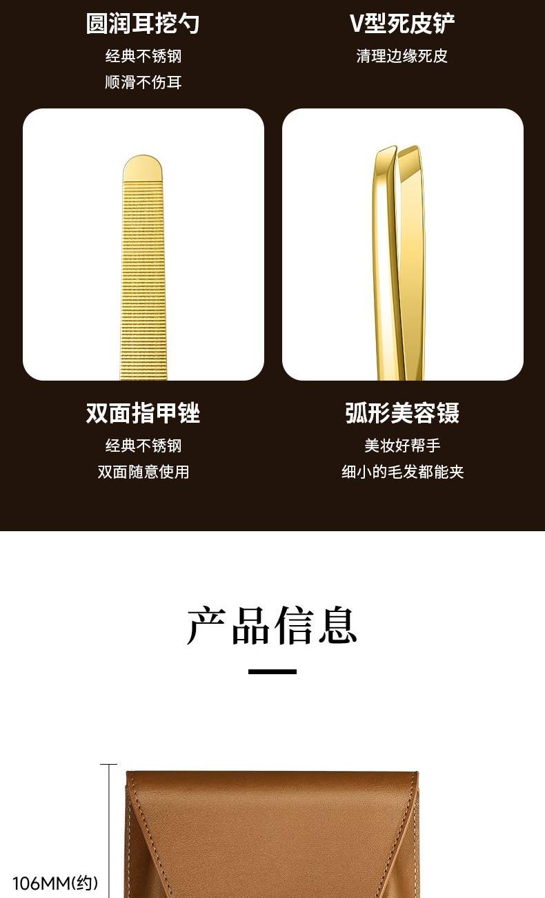 型 号:GNT-BM101G 材 质:14K金电镀优质碳钢+PU皮套 规 格:105*130*22mm 产品颜色:棕色 套装内容:10件套 平口指甲刀 | 斜口指甲刀 | 大号指甲刀 | 眉毛剪 |鼻毛剪 | 指甲锉 | 双头死皮铲 | 眉夹 | 死皮推 | 耳挖