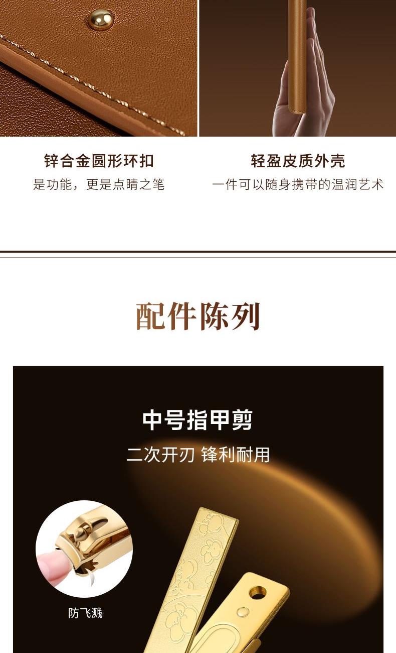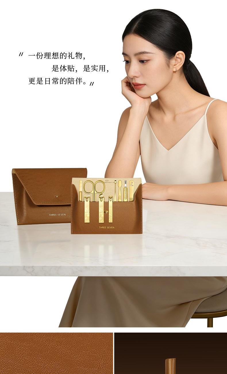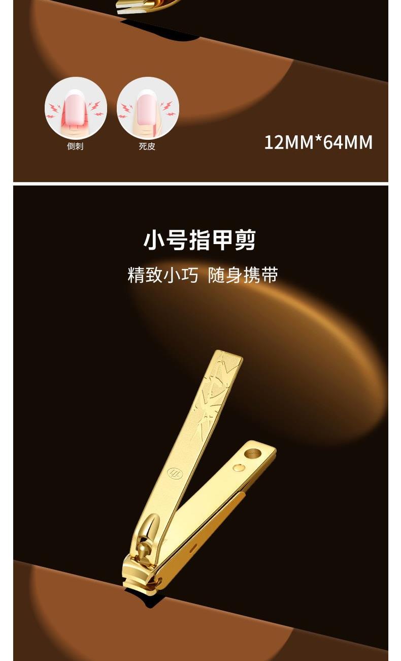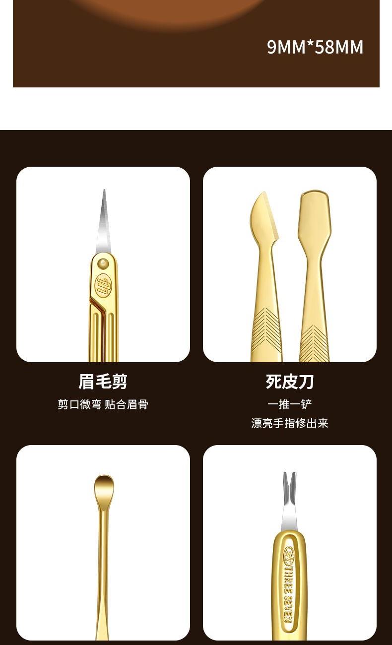 型 号:GNT-BM101G 材 质:14K金电镀优质碳钢+PU皮套 规 格:105*130*22mm 产品颜色:棕色 套装内容:10件套 平口指甲刀 | 斜口指甲刀 | 大号指甲刀 | 眉毛剪 |鼻毛剪 | 指甲锉 | 双头死皮铲 | 眉夹 | 死皮推 | 耳挖