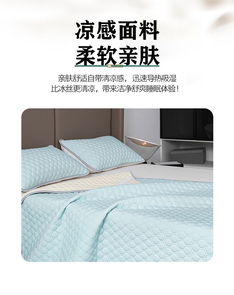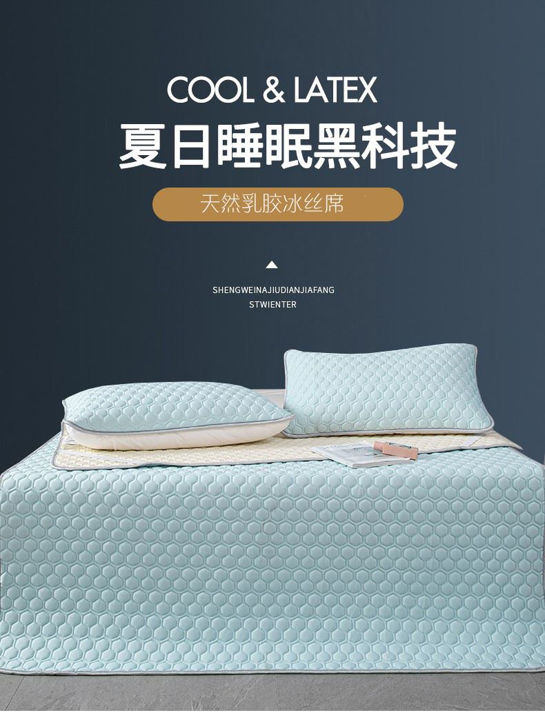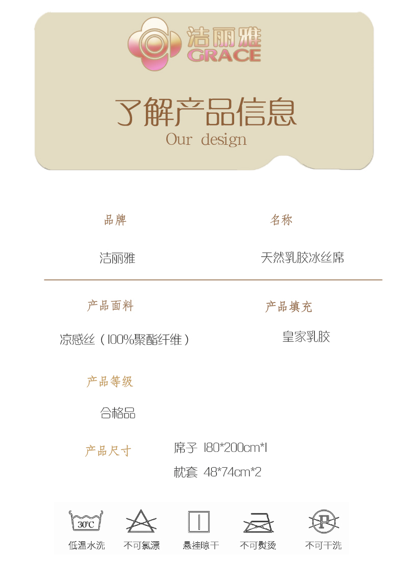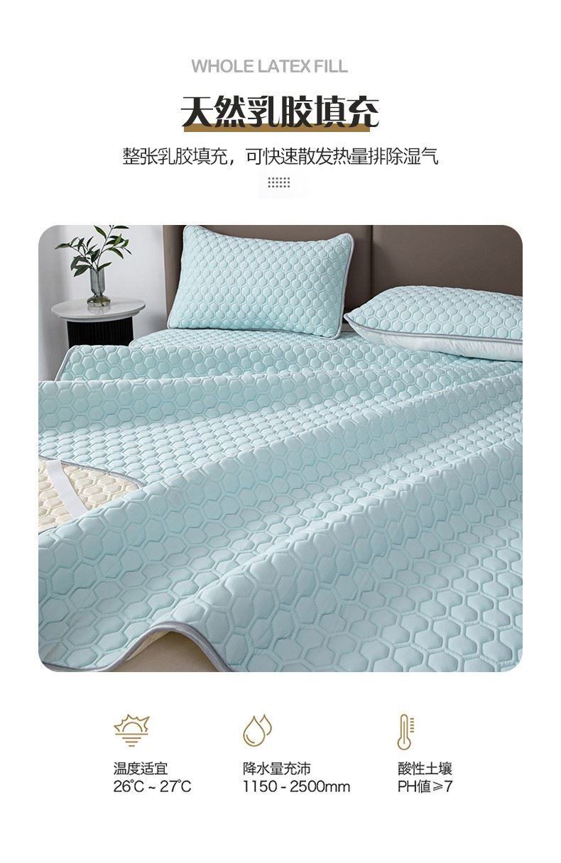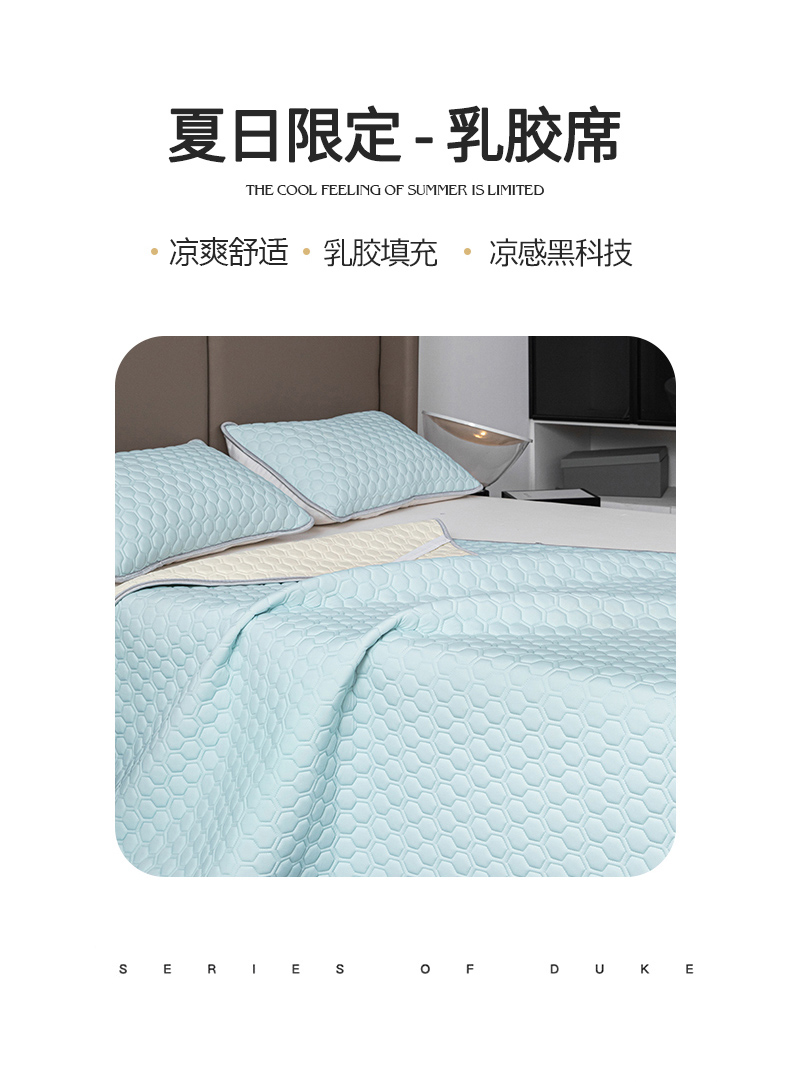 规格:180*200cm 枕套:48*74cm*2 面料:凉感丝 填充:皇家乳胶 执行标准:G8/T22796-2021 安全类别:GB18401-2010 A类 1.乳胶寝具的特点为自然通风散热快,使空气流动,散发体内的闷热,保持清凉舒服。 2.内芯由天然乳胶制成,无毒性,软硬适中,不易变形。透气,分布平均,透气性佳,具通气效果,能使空气自动流通,迅速散发热气