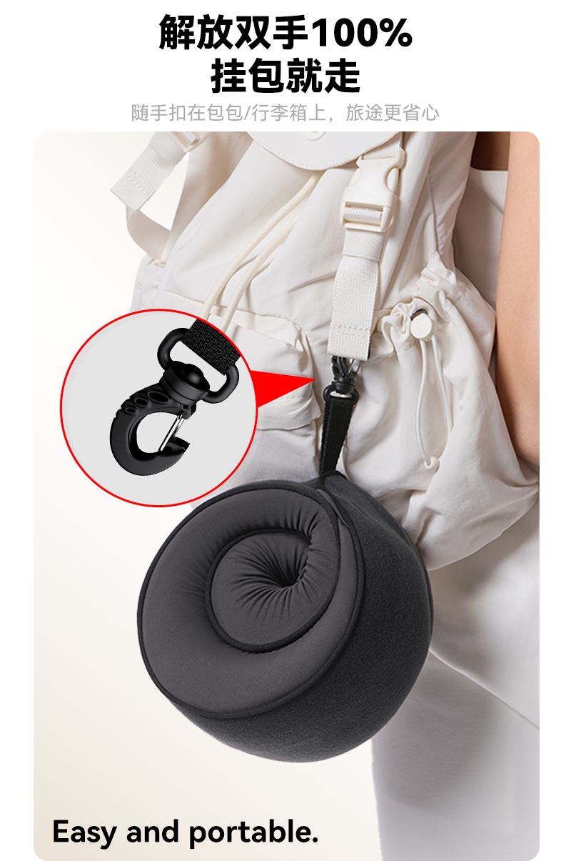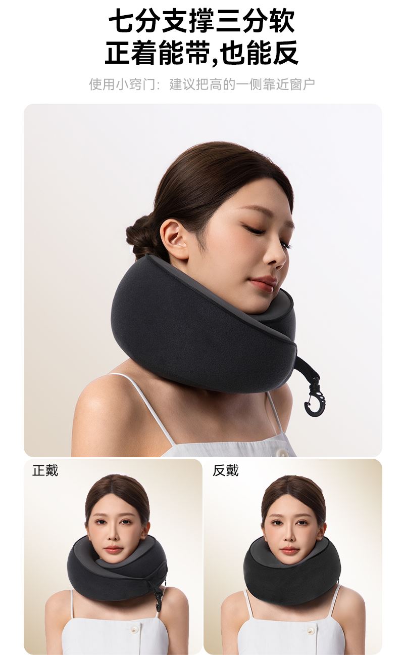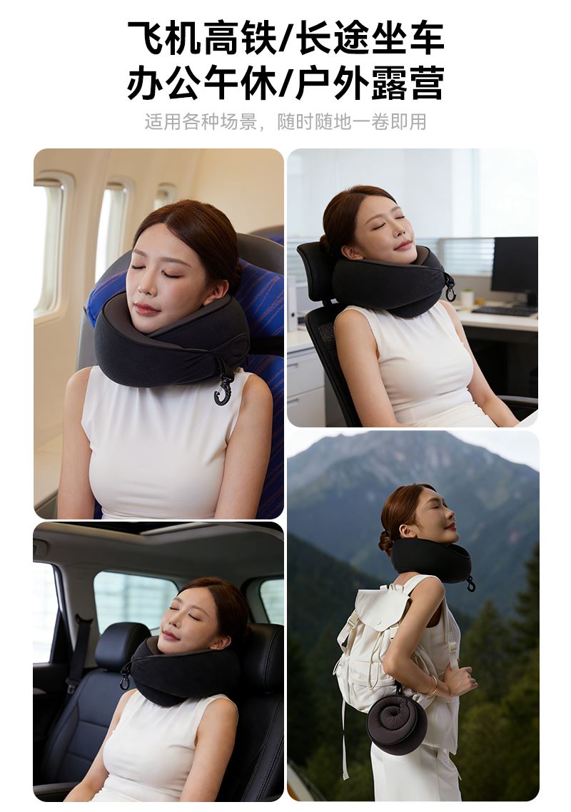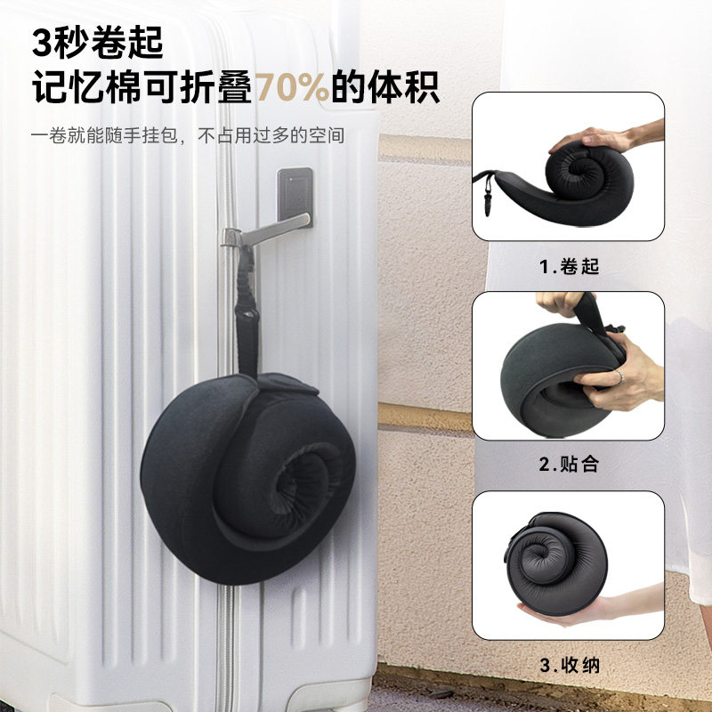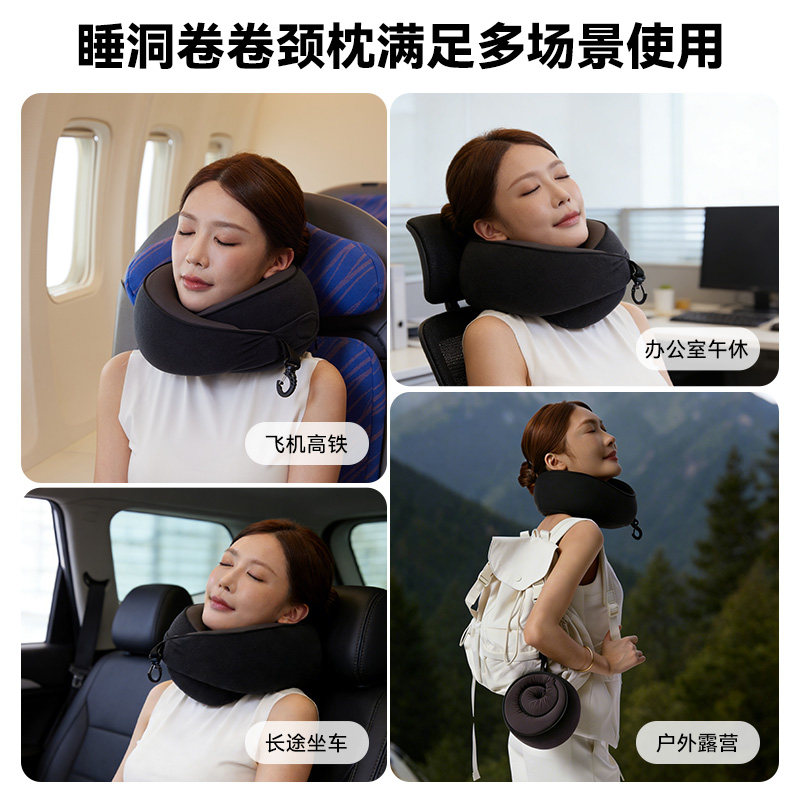 睡洞升级款卷卷颈枕,高弹记忆棉,支撑性更强 挂钩收纳设计,一卷就能随手挂包,不占用过多的空间。 可正戴、反戴,适合不同的支撑需求 分区支撑,贴合护颈,加高护颈支撑面 慢回弹舒压记忆棉枕芯,兼顾舒适度、支撑力、易折叠 全面魔术贴设计,不挑脖围 V型包裹设计,告别“睡觉点头”