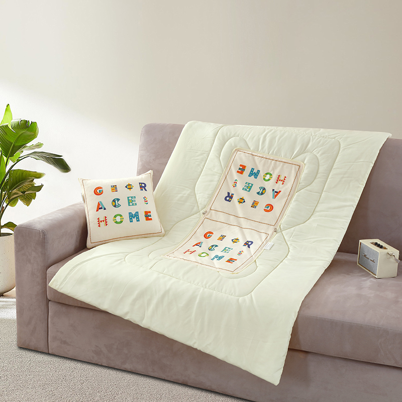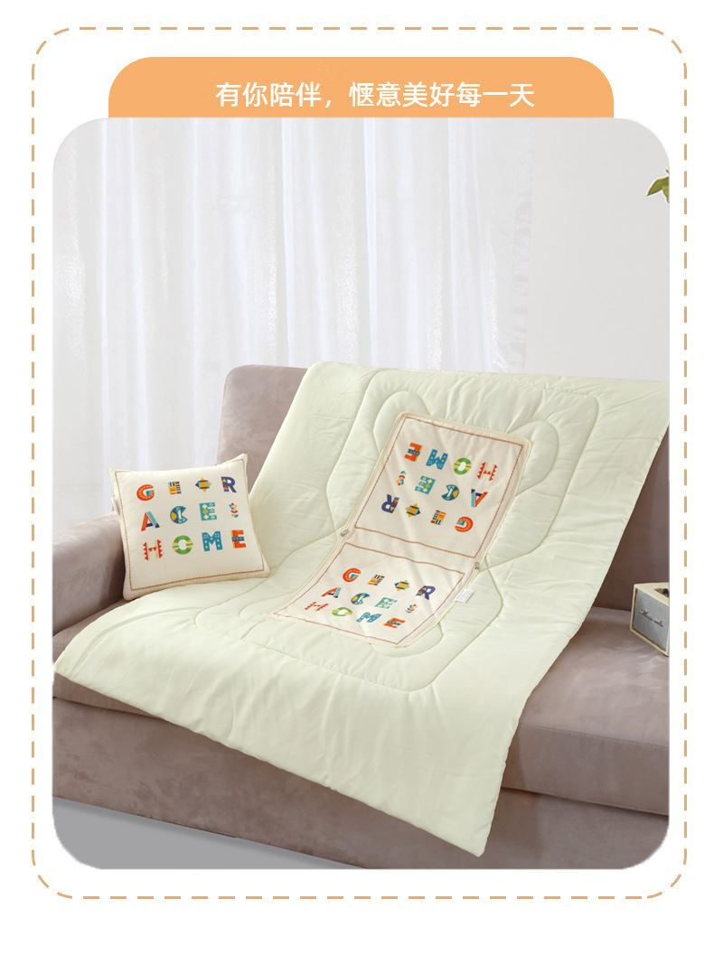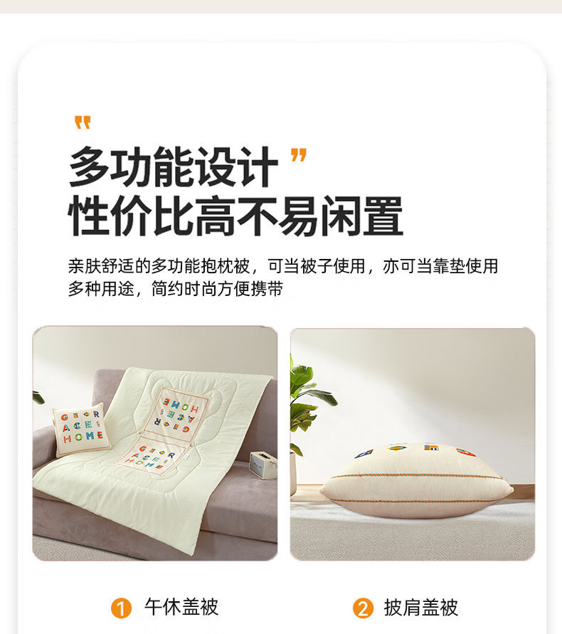 规格:40*40cm±5cm 展开:100*150cm±5cm 面料:宝宝绒 执行标准:GB/T22796-2021 安全类别:GB18401-2010 B类 1.采用宝宝绒面料,颜色鲜艳、丰富、美观大方,手感光滑流畅,洗涤后不收缩 2.填充环保羽丝纤维,轻薄透气,简约而不简单,适合贴身覆盖, 3.抱枕被方便收纳,折叠后可作为家居抱枕。