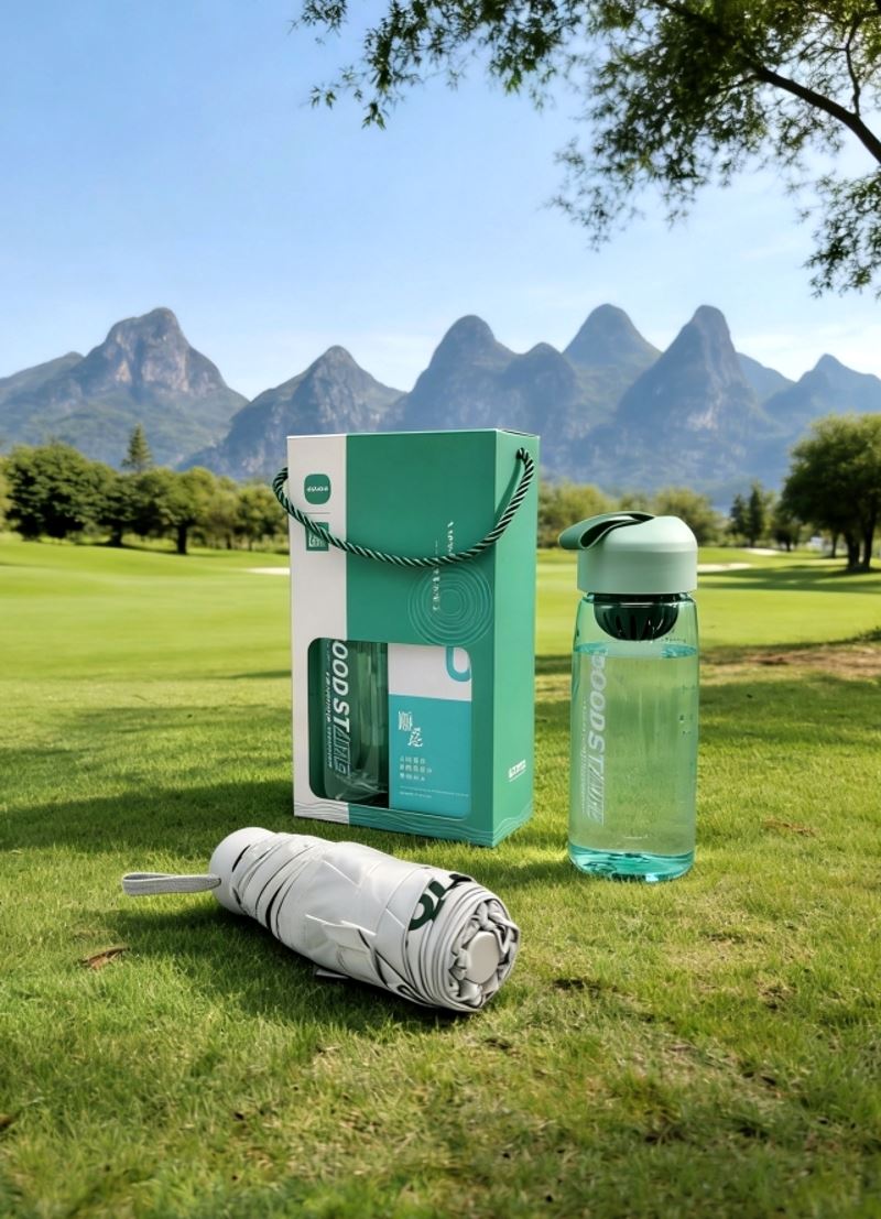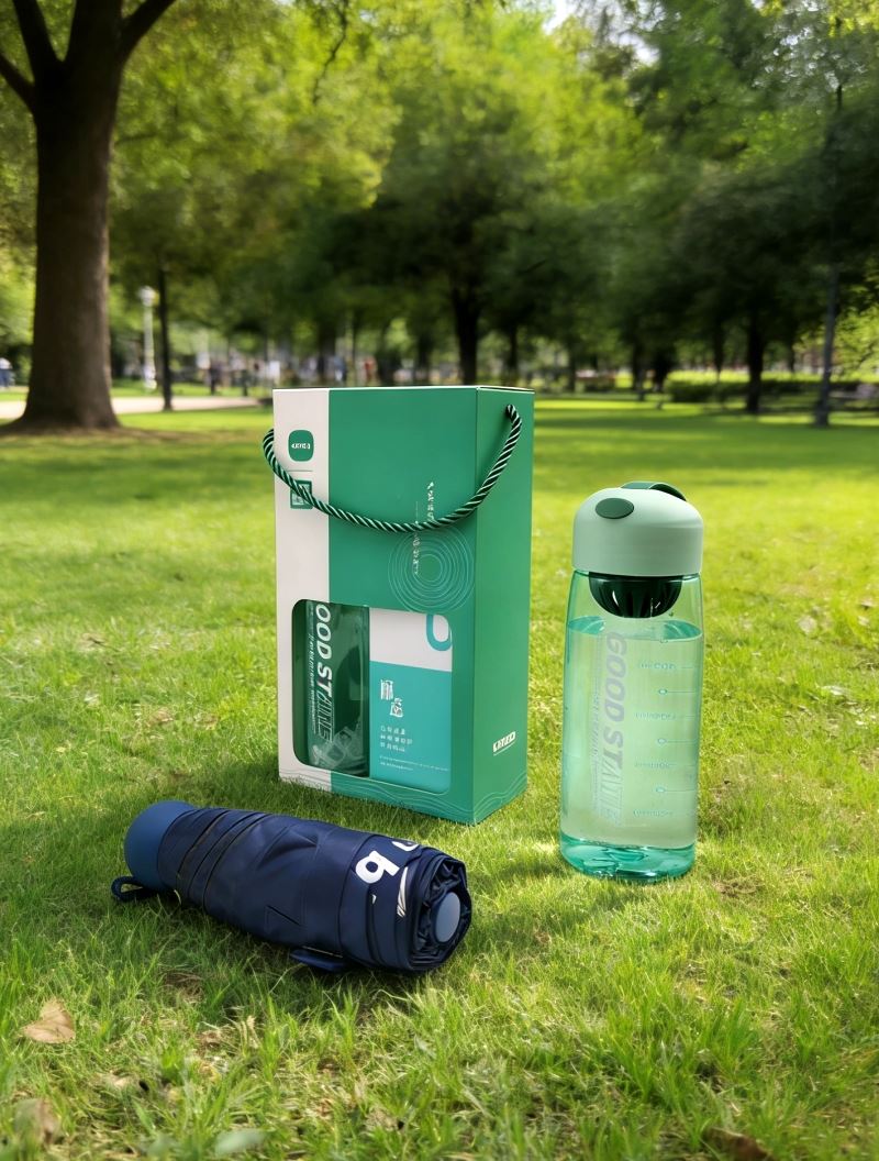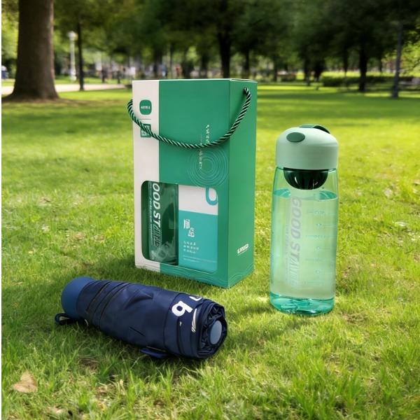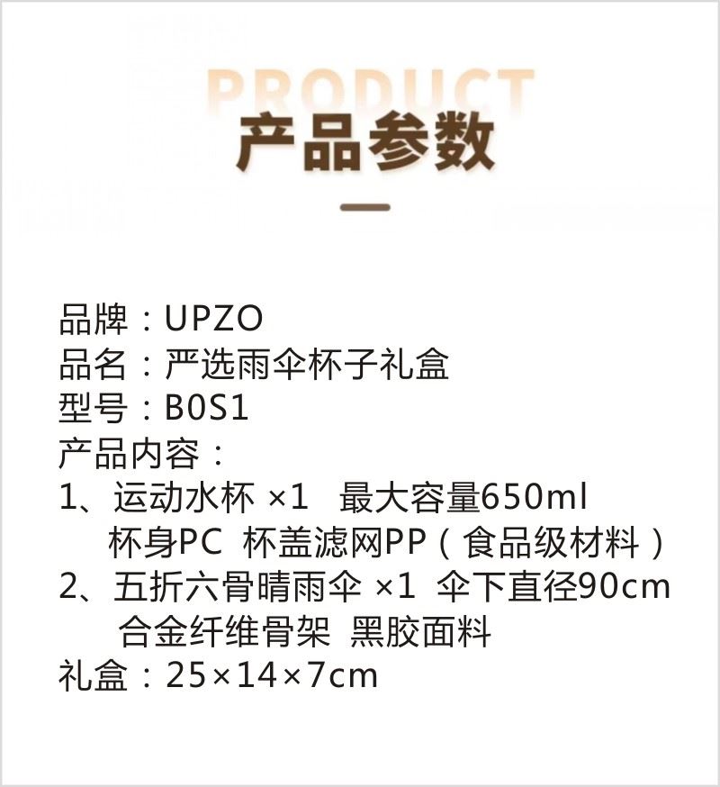 型号:B0S1 产品内容: 1、运动水杯*1 500毫升 (满杯容量650毫升) 杯身PC 杯盖滤网 PP (食品级材料) 2、五折六骨晴雨伞(胶囊伞)×1 伞下直径90CM 合金纤维骨架 黑胶面料 礼盒规格:25*14*7CM 运动水杯采用PC杯体 PP杯盖 可手提适中容量 五折六骨晴雨伞 胶囊伞尺寸设计 黑胶隔热