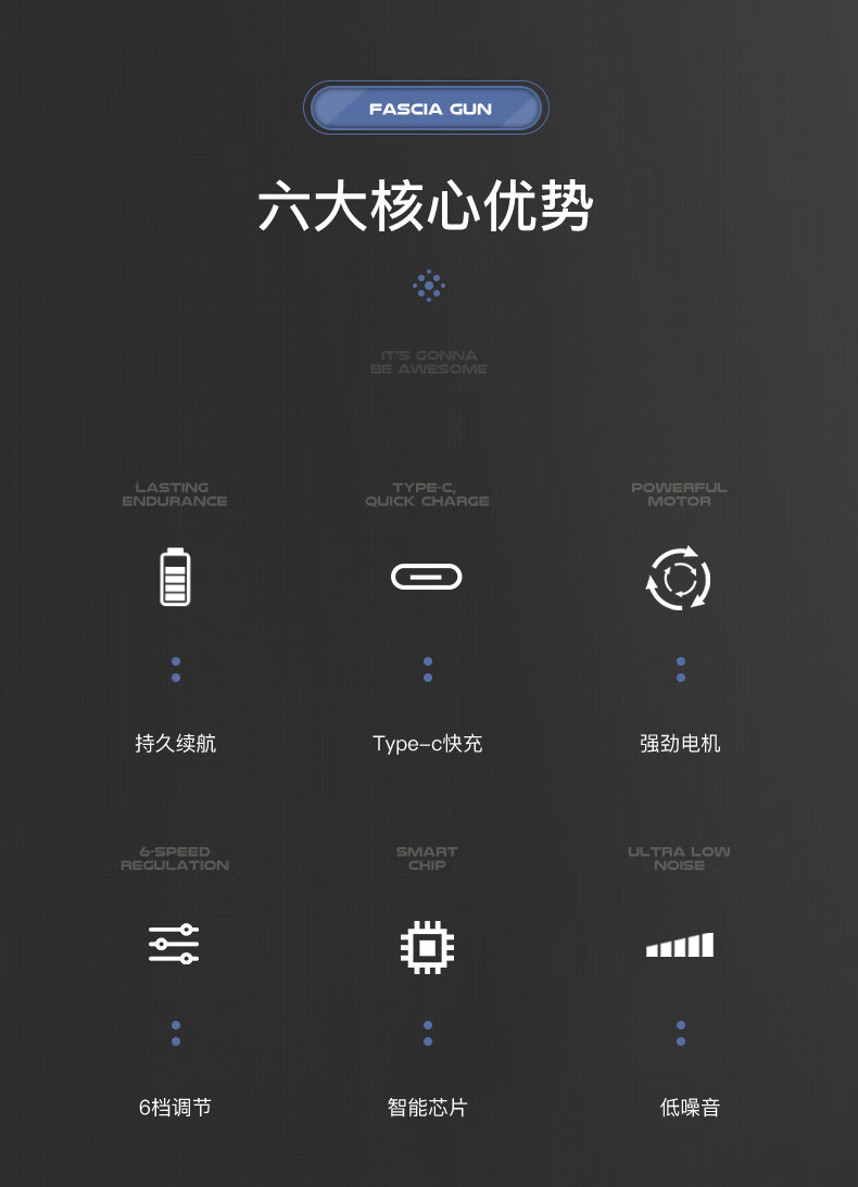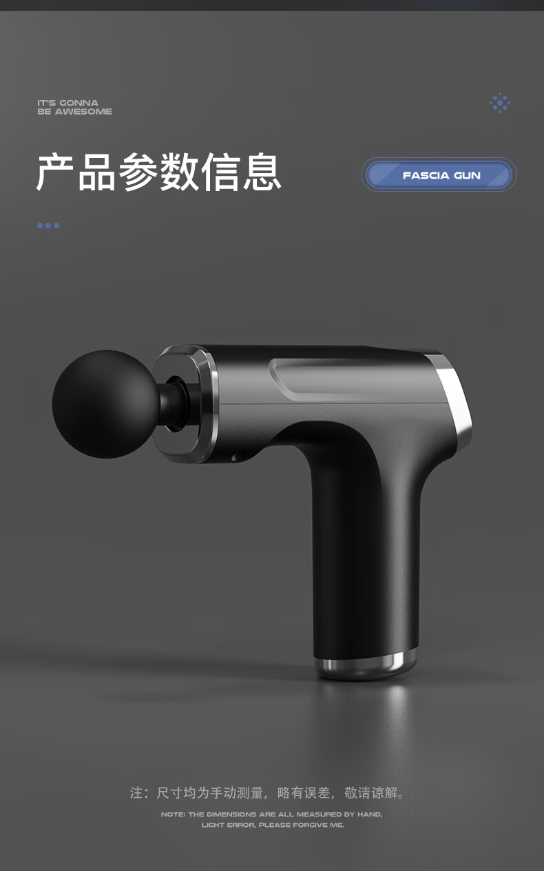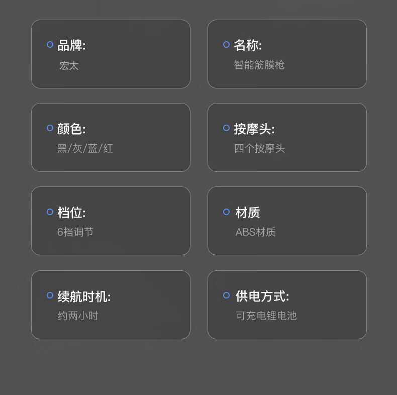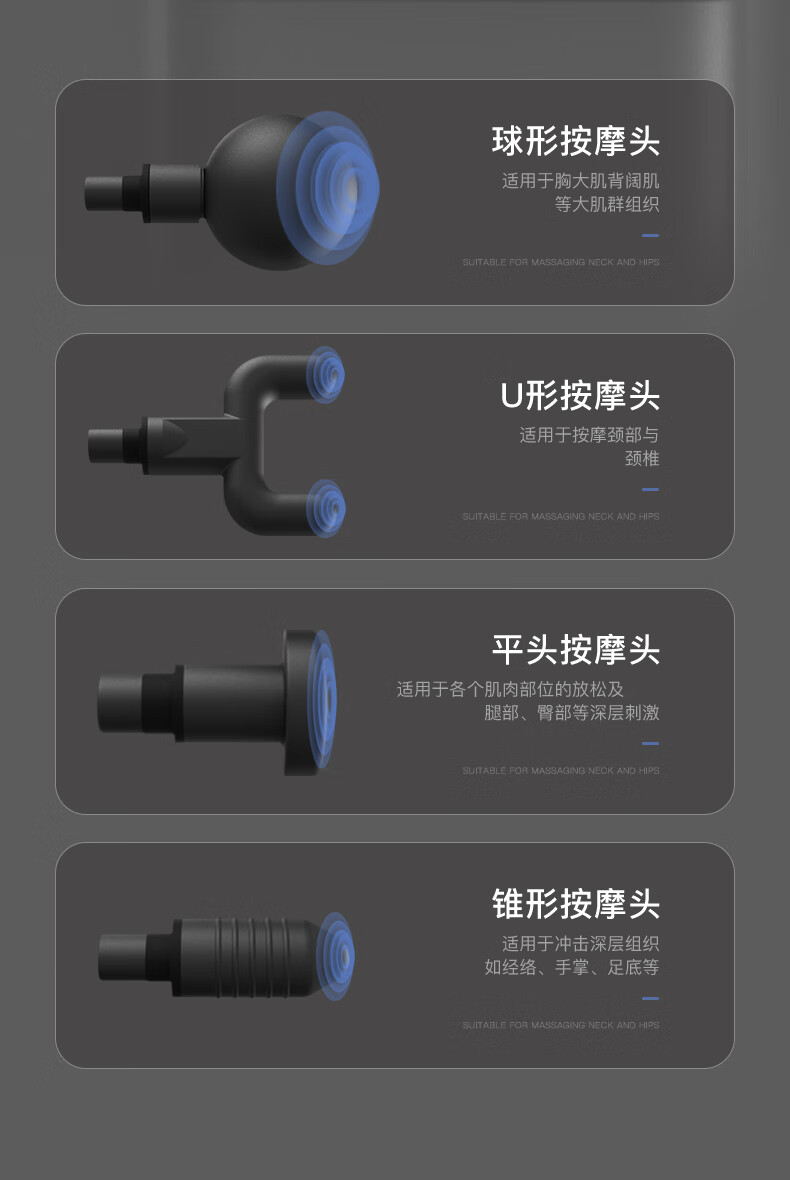 档位:6档调节 材质:ABS材质 按摩头:四个按摩头 续航时机:约2小时 供电方式:可充电锂电池 颜色:黑色 1.耐摔防滑,降低噪音 2.高扭矩大功率无刷电机安全耐用 3.按摩头可以随意切换 4.小巧精致,便于携带