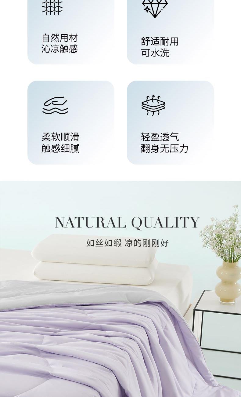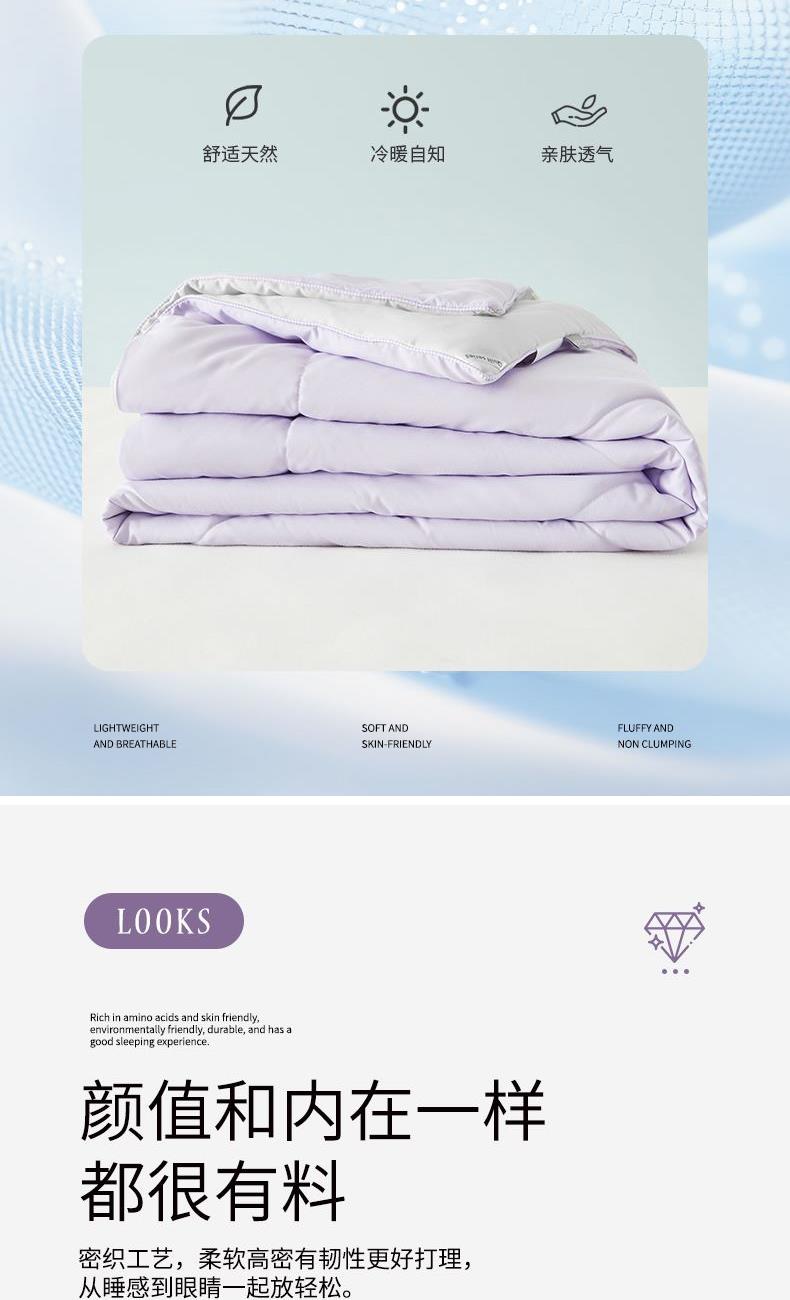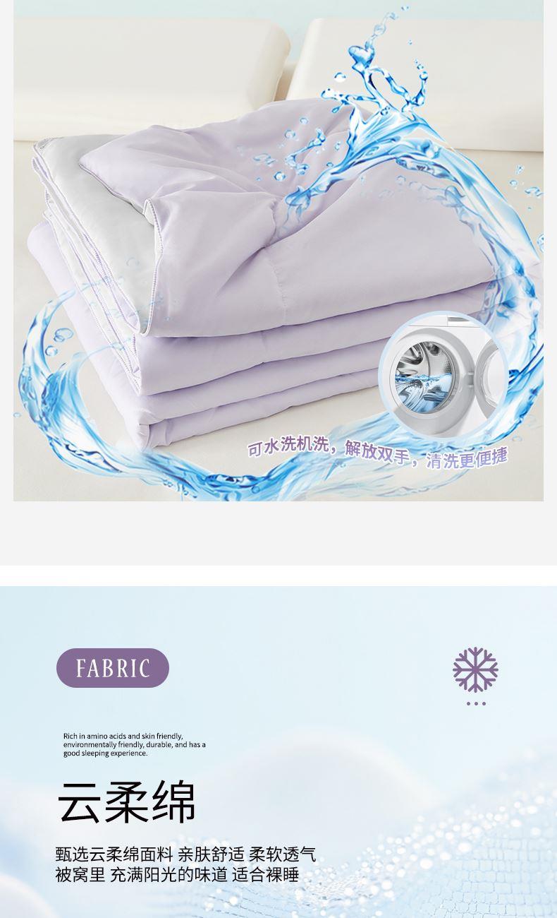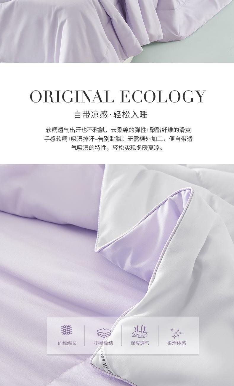 货 号:JB-1522 规 格:150×210cm 面 料:云柔绵 填 充:聚酯纤维 总 重:900G 产品卖点—— 1.紫气东来空调被,云柔绵聚酯面料细腻柔软,触感轻柔贴身,源自天然,丝滑亲肤,裸睡也舒适。 2.被体轻薄不压身,透气不闷热,专为空调房设计,如丝如段,盖着清爽不着凉,轻松入眠。 3.四季百搭,春秋盖温润、夏日常用、冬做内搭,柔软保暖又实用,可水洗解放双手,全家适用。