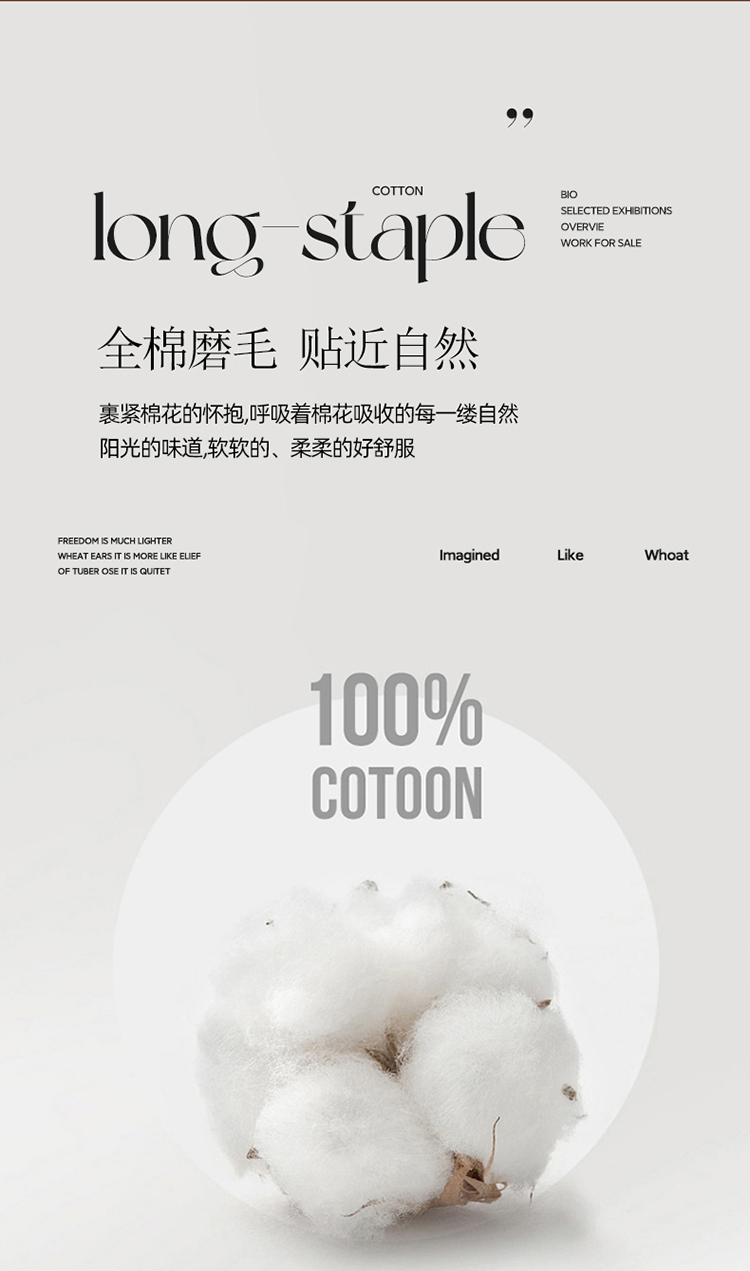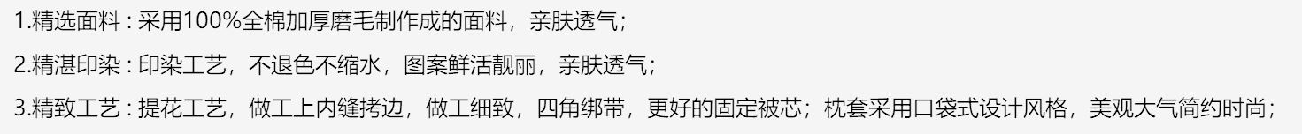 1.精选面料 : 采用100 %全棉加厚磨毛制作成的面料,亲肤透气;