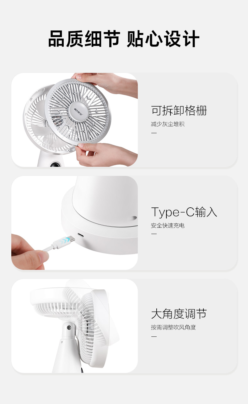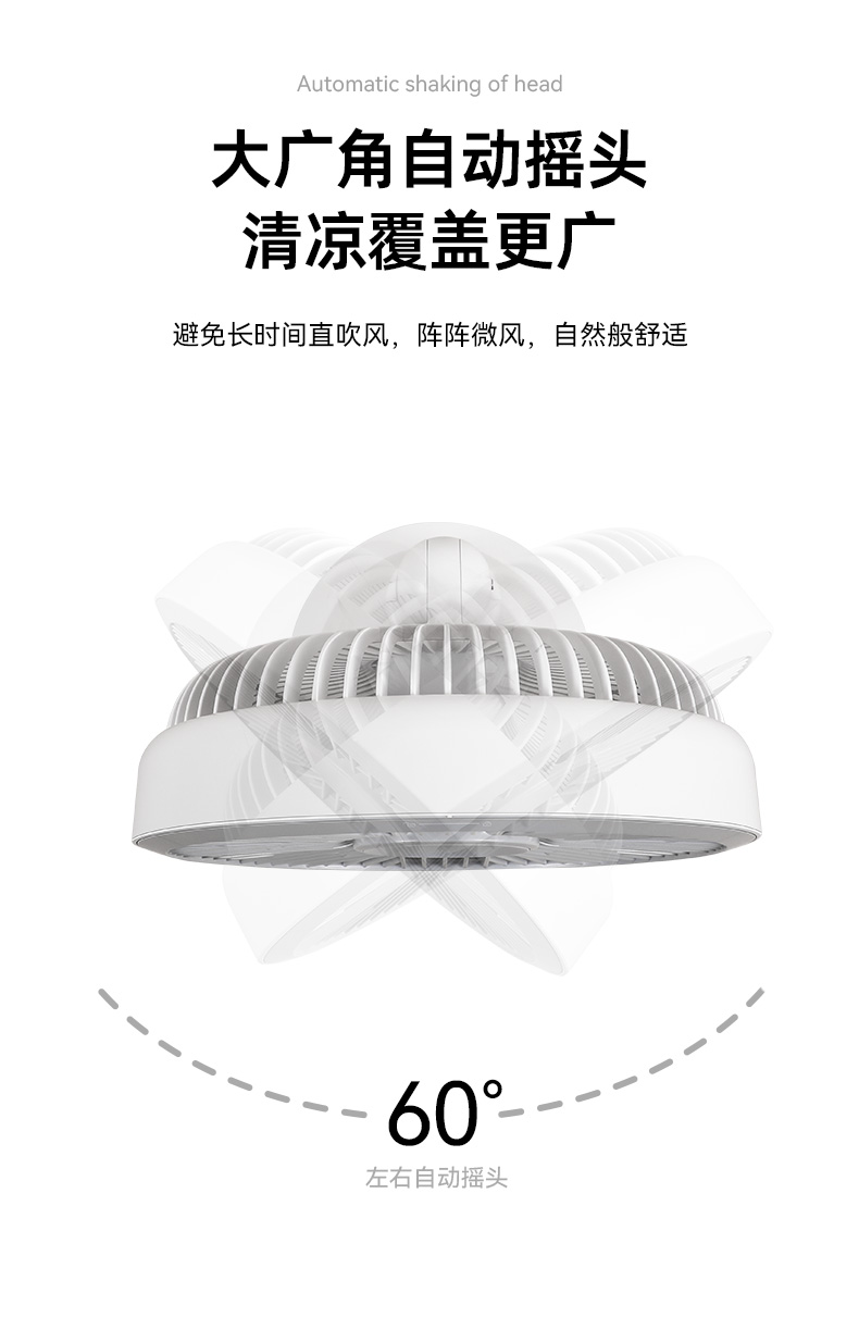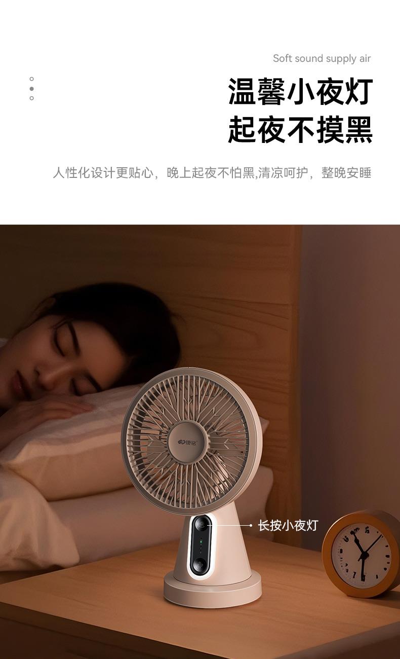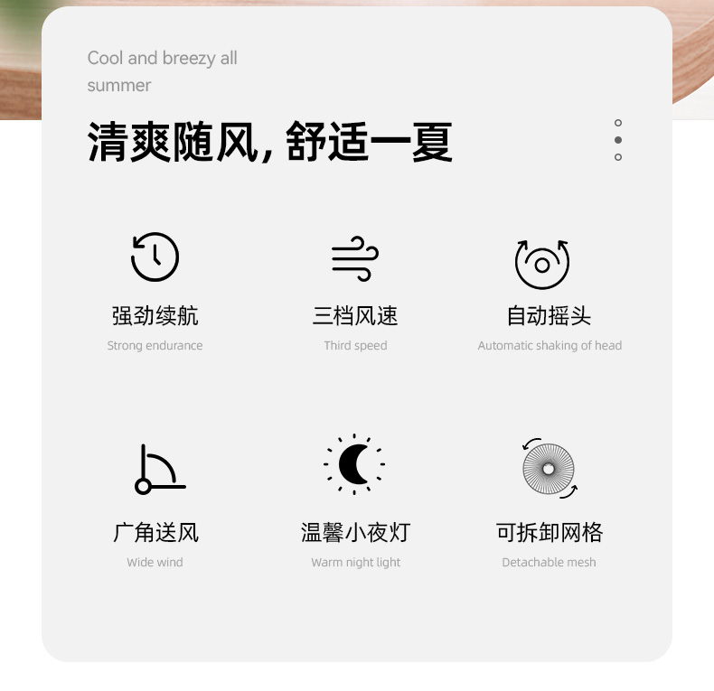 ·90°自动摇头,广角送风 ·强劲风力,轻音送风 ·三档风量,清凉风感 ·小夜灯设计,起夜不摸黑·长效续航,清凉一整晚·Type-C输入,超长续航 快拆清洗,时时如新